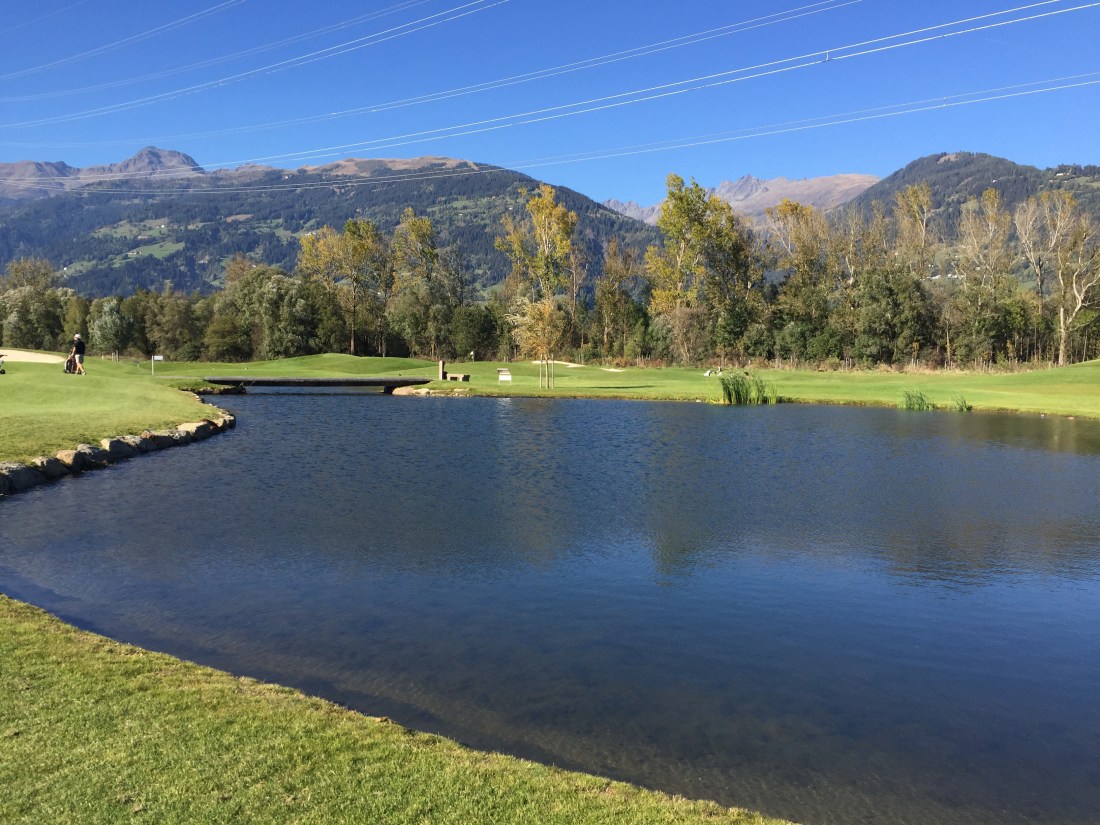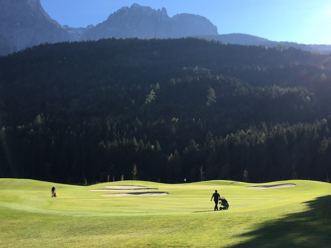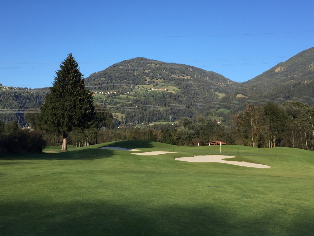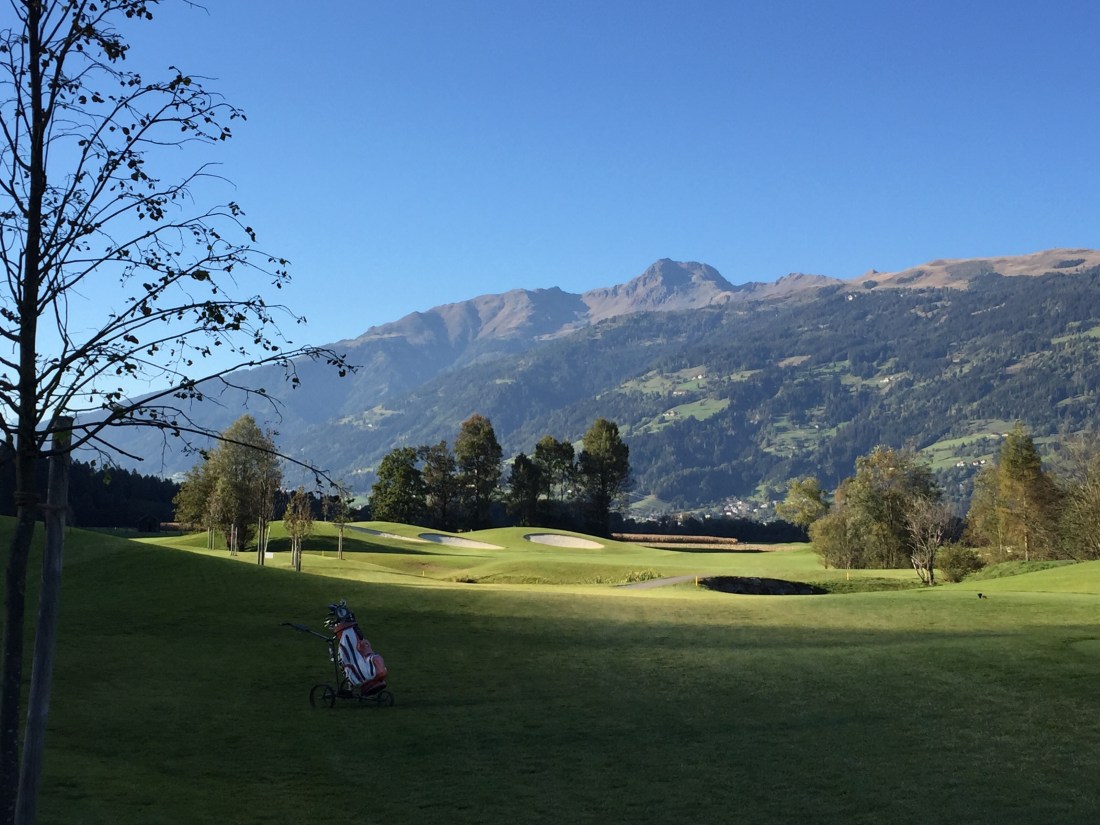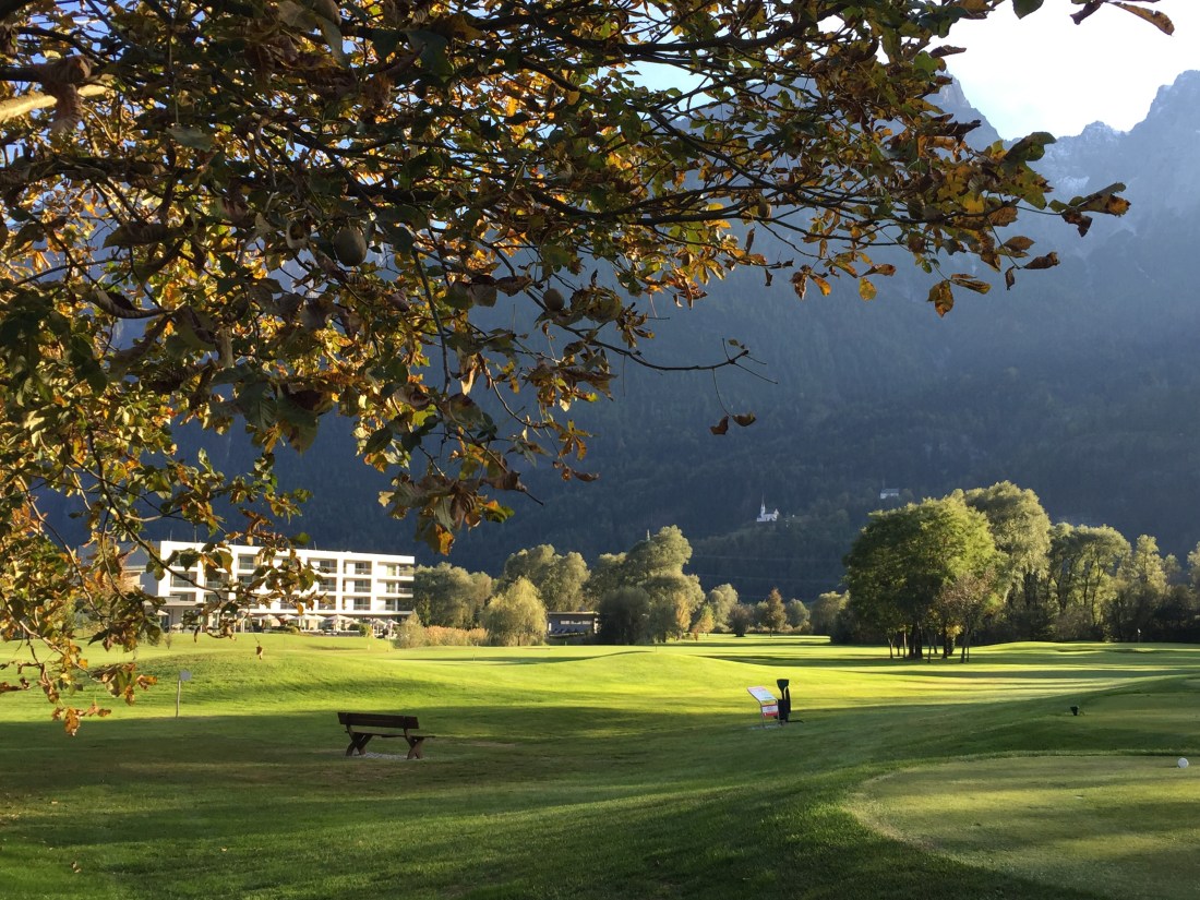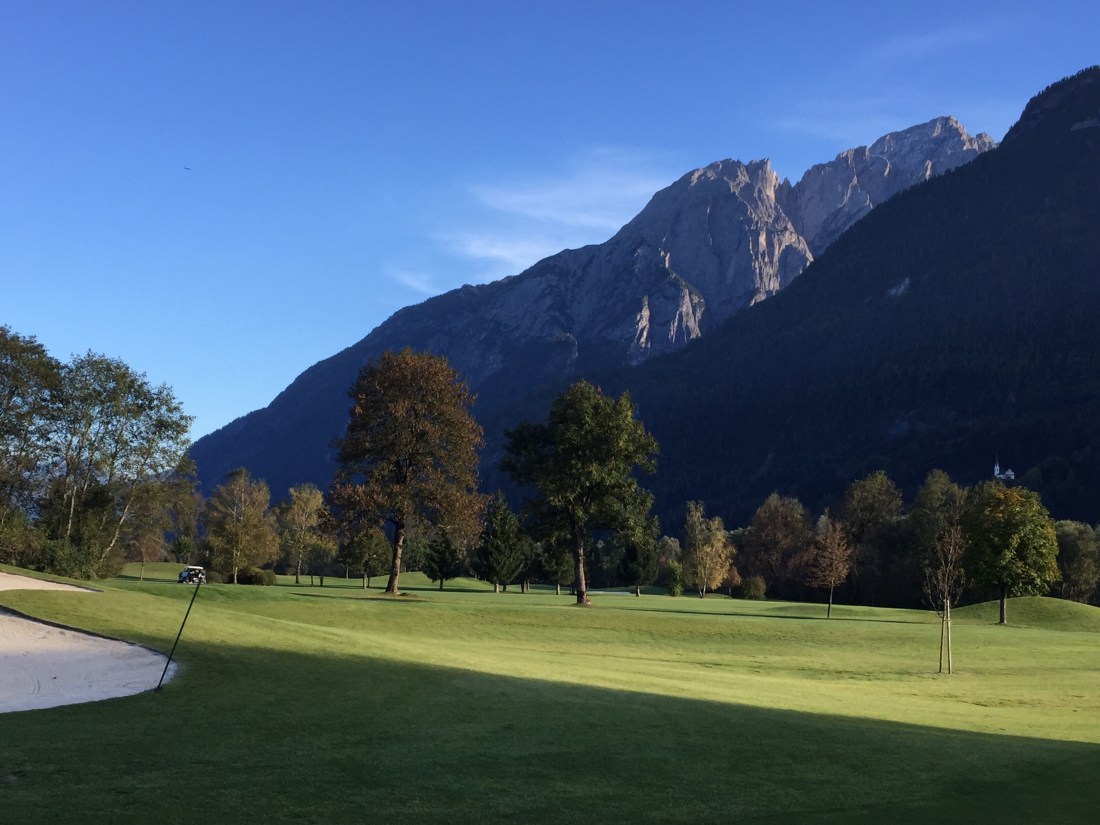 Klar, sie sind verwöhnt hier. Freitag nachmittags im Oktober ist der Platz rappelvoll. Die Flightpartner aus Ulm kommen schon seit Jaaahren immer hierher. Weil es so schön ist. Das ist es. Das Bergpanorama rundum glänzt in der Herbstsonne und macht uns keinen Schatten. Der Platz ist top in Schuss, sehr gut gepflegt. Silber ist der neueste, du siehst es schon am Layout. Viele Bunker, viel Wasser, wellige Fairways, stark ondulierte Grüns. Die Bahnen wirken breit, sind es aber nur scheinbar. Bist du nicht gerade, lauern überall Hindernisse.