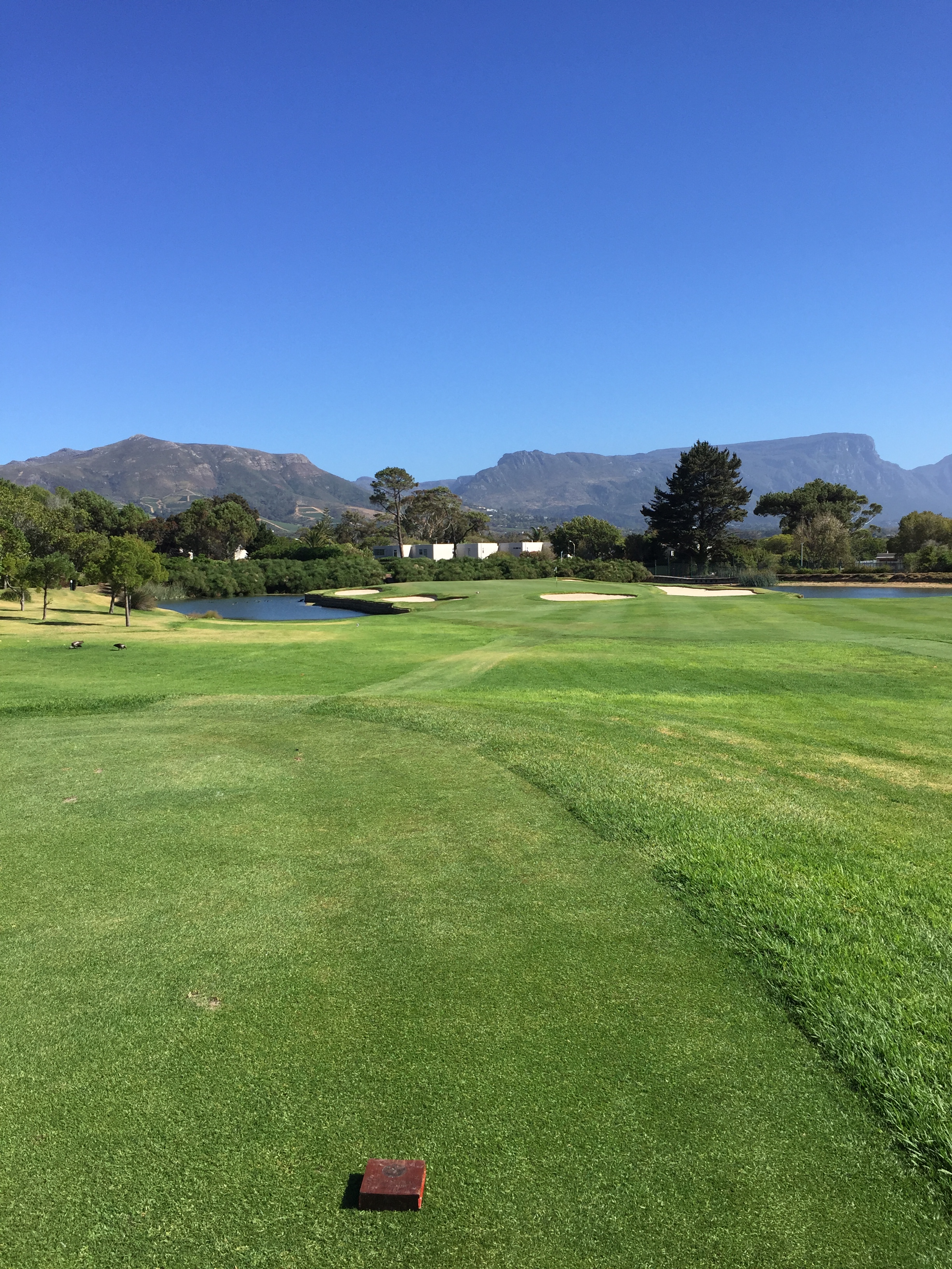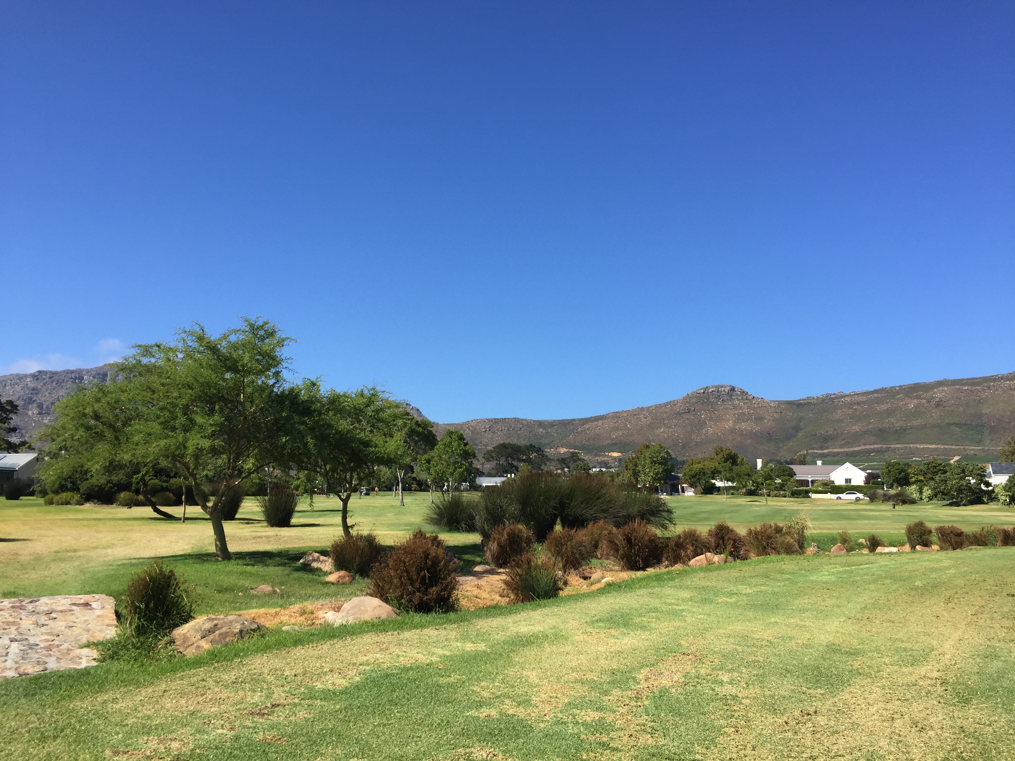 Zwei Runden bekam ich genehmigt von meinen Lieben. Ich entschied mich erst einmal für einen der ehrwürdigen Plätze und brauchte mit dem Mietwagen aus Cape Town nicht einmal 30 Minuten Fahrt durch die Hügel der Gegend: „Steenberg Estate“ leuchtete es mir von den Flaggen an der gut gesicherten Einfahrt entgegen. Im feinen Clubhaus ist man reserviert freundlich und erklärt mir, dass außer meinem (übrigens hervorragenden Nike-Leihset) auch mein Caddie samt Cart auf mich warten würde.