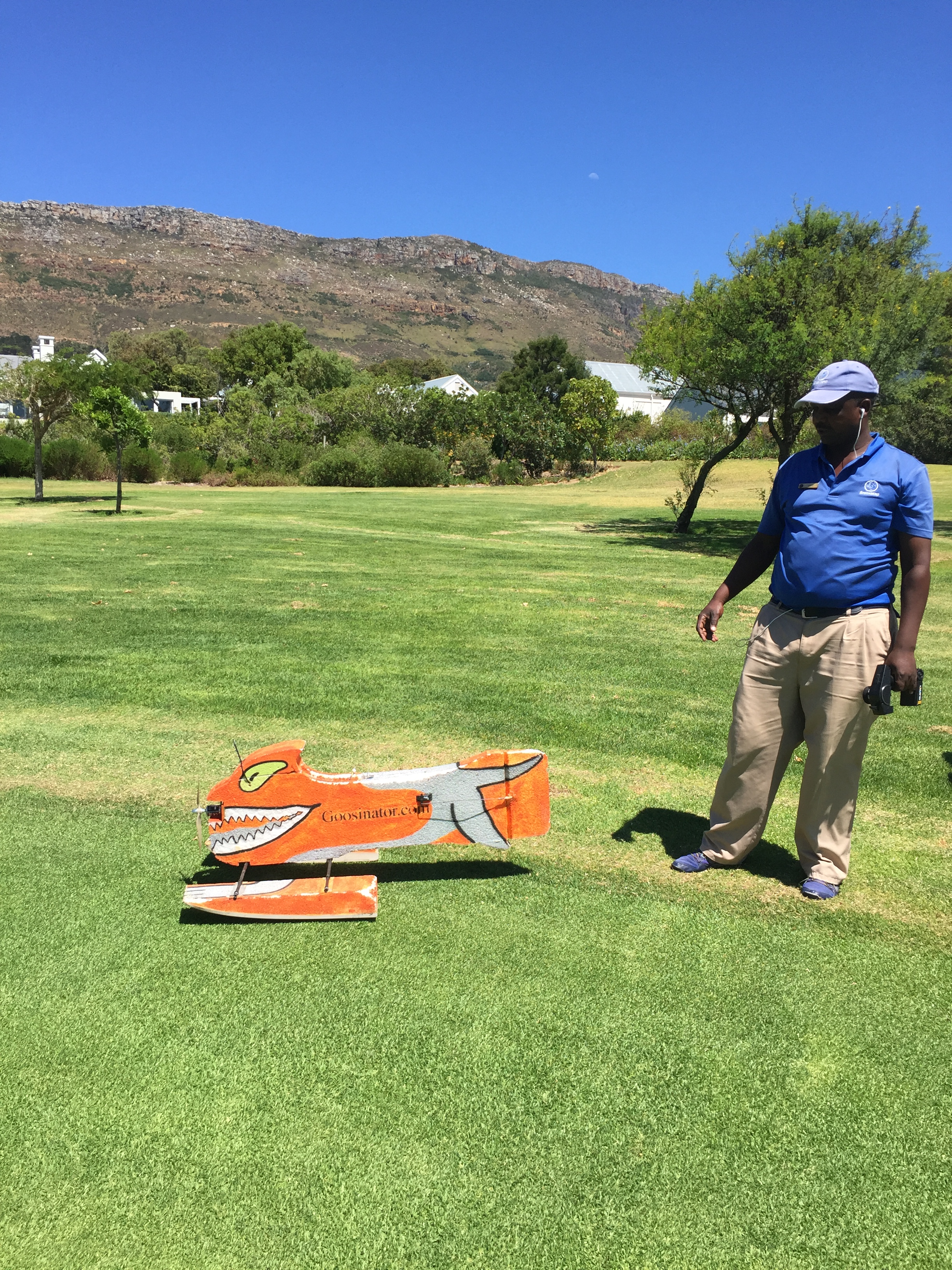 Auf den 2. Neun treffen wir einen sonderbaren Greenkeeper mit einem orangefarbenen Riesenvogel aus Holz, der Geräusche wie ein extrem lauter Rasenmäher von sich gibt. Damit sollen nicht wir Spieler verscheucht werden, merken meine Flight-Holländer und ich schnell, sondern die vielen Enten von den Fairways und sogar aus dem Teich. Eine Art südafrikanischer Klappotetz.