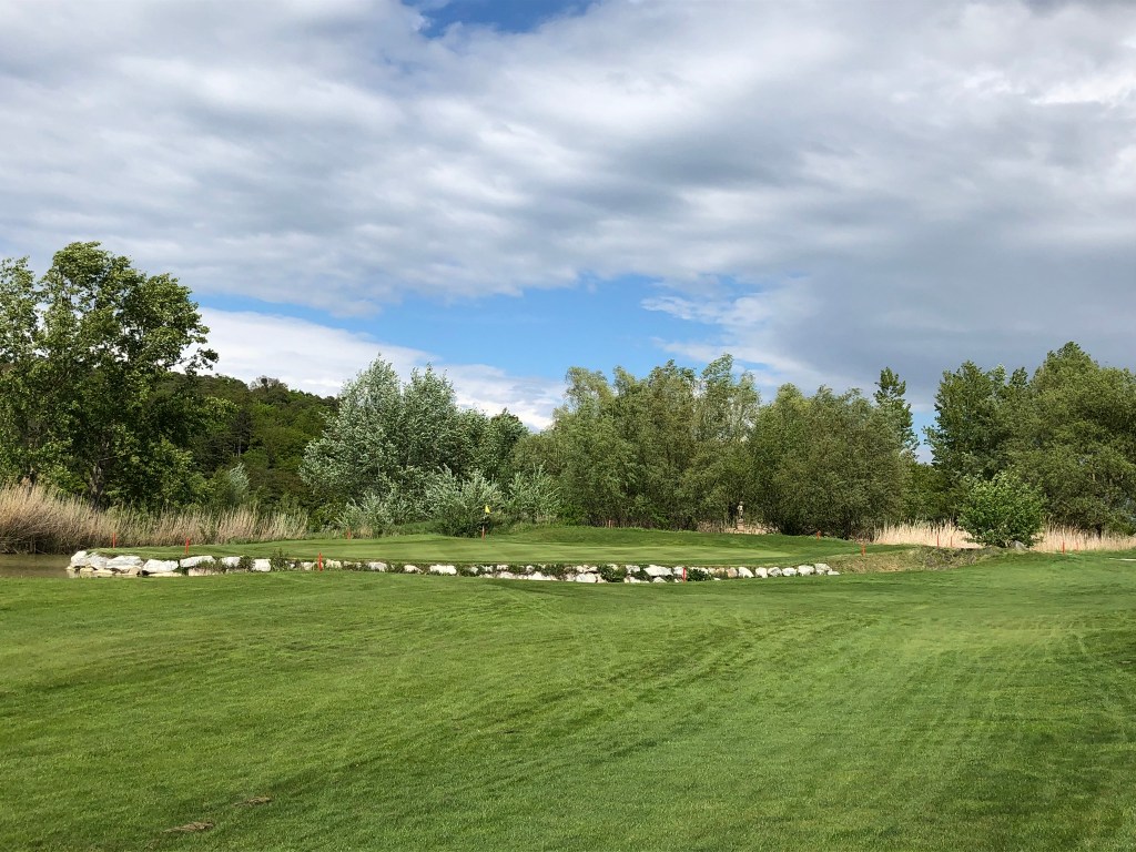Auf den zweiten 9 verändert sich der Platz deutlich, ist auch weniger herausfordernd. Es beginnt mit einem Par 3 samt Inselgrün, später spielt man um einen wunderschönen Teich herum. Da kommen dann auch ebene Bahnen daher mit höher- oder tieferliegenden Grüns, jetzt ist der Platz spannender, vielfältiger, fairer. Vom Abschlag der 13 (Par 5) hast du einen wunderbaren Ausblick. Schön die 14, ein Par 4 bergauf. Ein Dogleg die 16, wo Longhitter bestimmt über das Gesträuch das Grün angreifen, aber nicht, ehe dort vom Vorderflight die Glocke geläutet wird. Vor allem hast du jetzt immer wieder einmal einen geraden Stand. Nicht auf den Teeboxen allerdings. Die sind leider fast ausnahmslos unangenehm buckelig.
