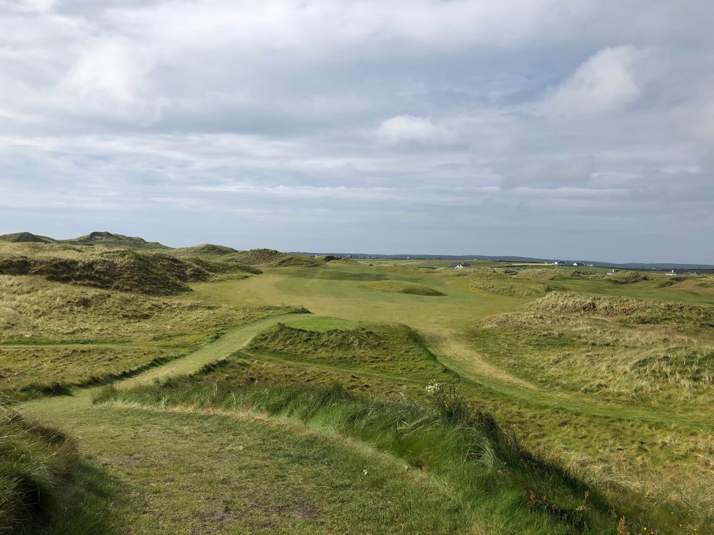 Der erste Tag beginnt, wie ich mir Irland vorgestellt habe: grau, windig, leichtes Nieseln, etwa 14 Grad. Wir sind vom Hotel etwa eine Stunde hierher gefahren, vorbei an Schafen, grünen Flüssen und winzigen Dörfchen und jetzt irgendwo am Ende der Welt. Hier ist nichts mehr außer grasbewachsene Dünen und das Meer irgendwo. Und ein Friedhof, plötzlich, bei dem wir rechts abbiegen und gleich darauf etwas irritiert beim schlichten Clubhaus des Carne Golf Links parken. 27 Loch Links Course gibt es hier, Hackett mit 18, Kilmore mit 9, alle ohne jegliche Bagger oder Maschinen angelegt und einfach in die vorhandenen Dünen gebaut.