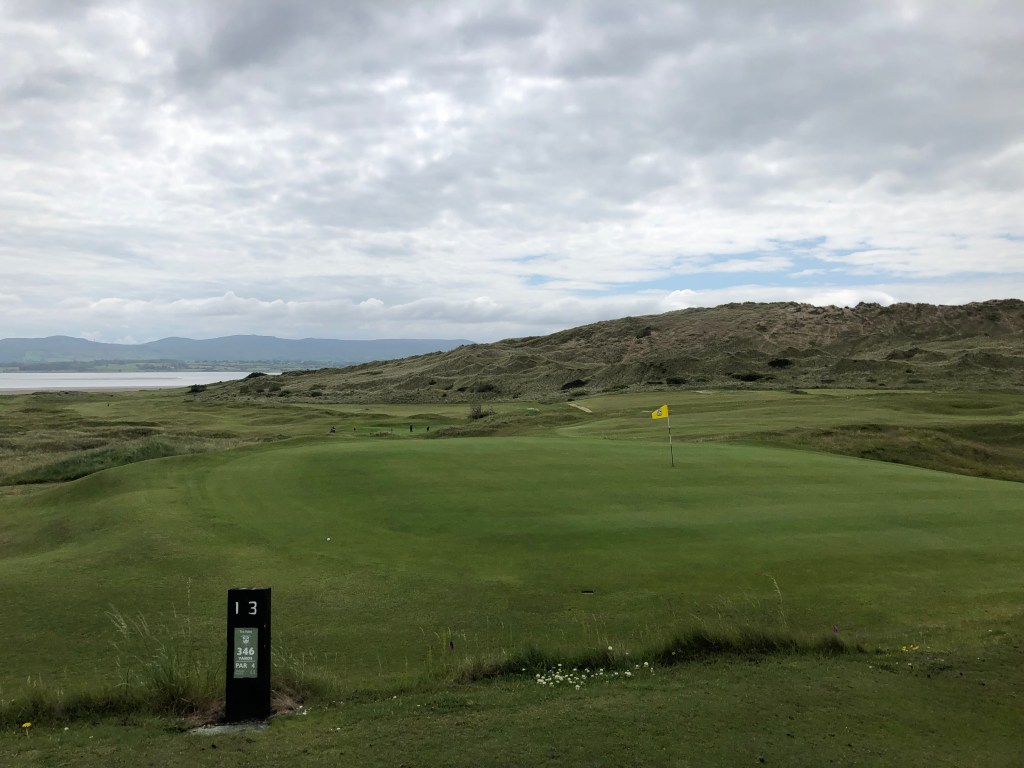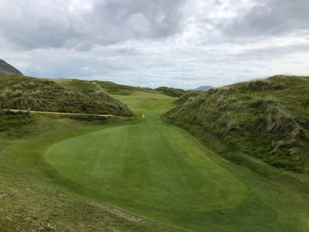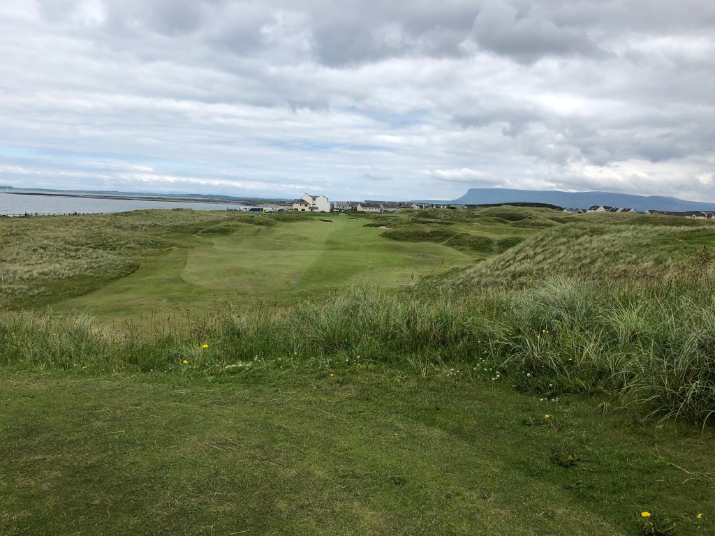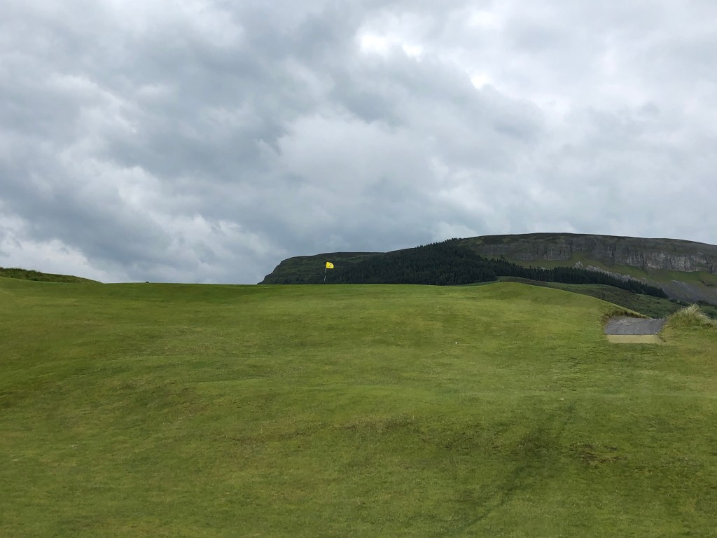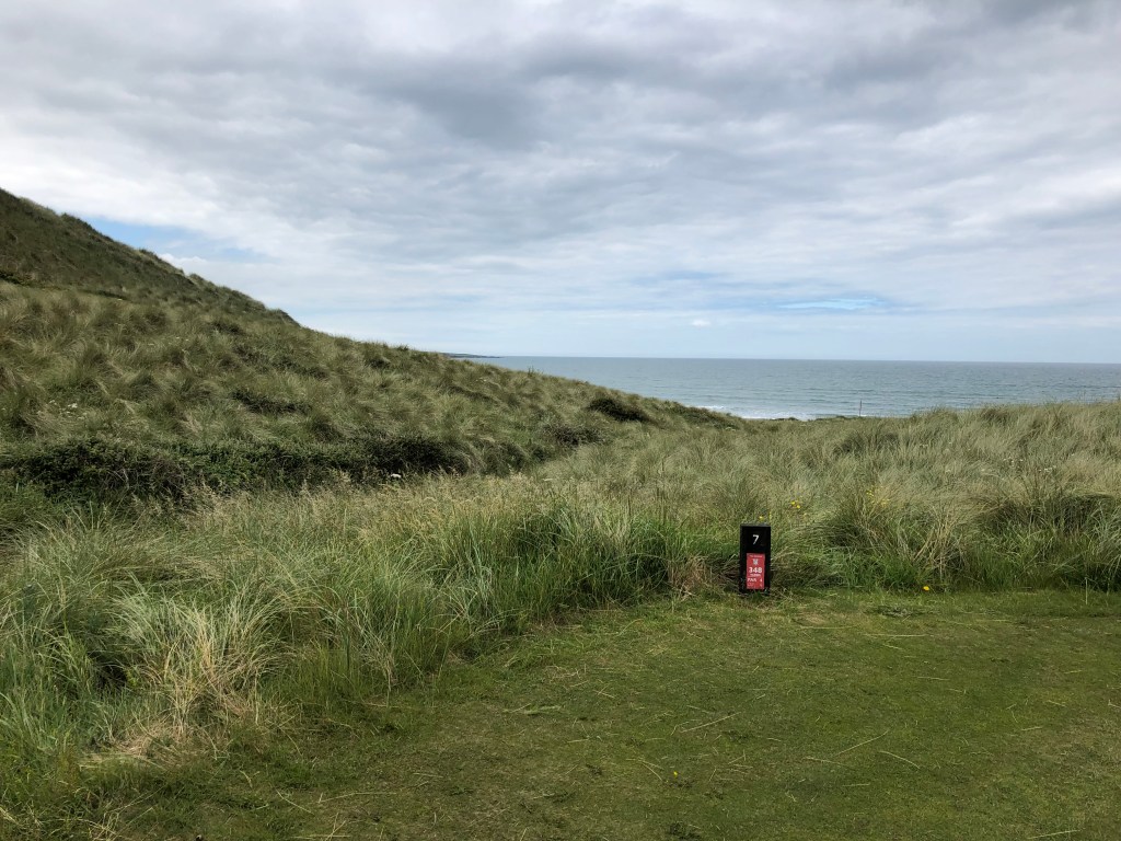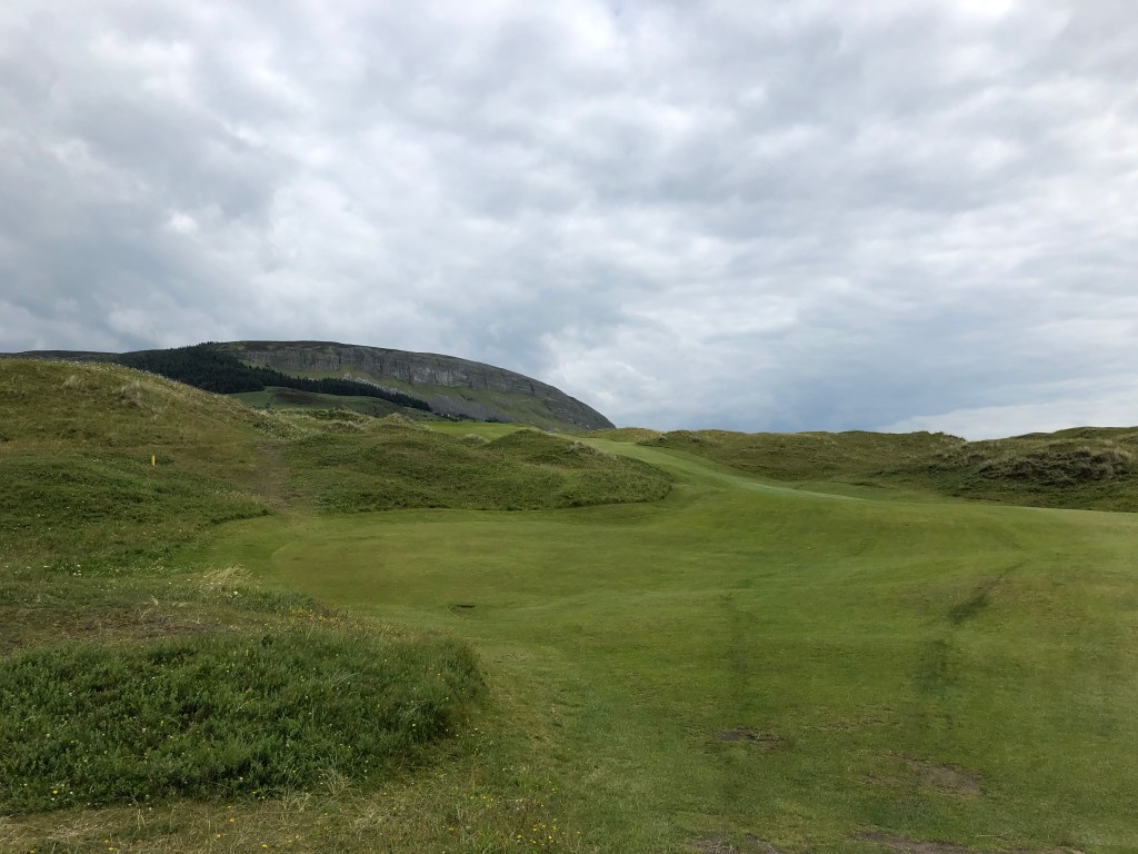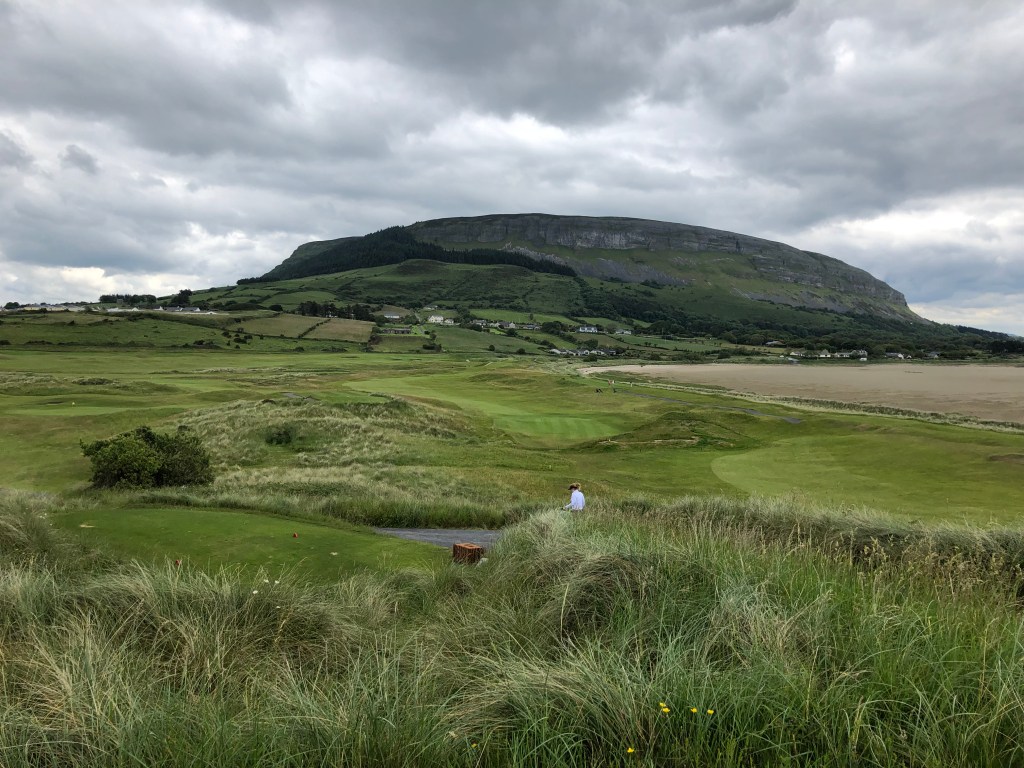 Aber wir schlagen uns wacker auf ungewohntem Terrain und spielen zügig. Strandhill ist lange nicht so wild und rau wie Carne Golf gestern. Die Fairways sind tadellos gemäht und eher so, wie wir sie kennen. Ihr Verlauf nicht. Auch hier winden sich die Bahnen durch die Dünen, wie es ihnen gerade passt. Auf den hohen grünen Wellen bleibt dein Ball nie Mitte Fairway, selbst, wenn du dorthin getroffen hast, sondern rollen 15, 20 Meter seitlich weg. Du spielst über grasige Kuppen oder hast Abschläge hinab in die Tiefe und mit herrlichem Blick zum Tafelberg nebenan oder auf das Meer.