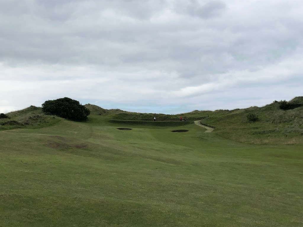 Meine Lieblingsbahnen: Ein schnurgerades Par 4 gleich zu Anfang, bei dem das Grün hinter zwei Bunkern erhöht auf einer Art Mauer liegt (Foto). Zu lang darfst du hier nicht sein, sonst liegst du mitten in der Düne, zu kurz auch nicht, eh klar. Oder: Ein Par 4, bei dem wir blind abschlagen und nur vermuten, wie die Bahn verläuft. Erst der zweite Schlag kriegt deshalb die scharfe Kurve im Dogleg, der nächste muss durch ein nur wenige Meter breites Nadelöhr aufs Grün. Mein Flightpartner spielt ihn mutig über die hohe Düne und trifft das Grün, mein Ball bleibt seitlich im Böschungsrough hängen. Trotzdem: Rückblickend ein Traum, schaut aus wie eine Sanduhr, die Bahn (Foto). Ähnlich kreativ sind viele Bahnen und Grüns gestaltet und wir merken langsam, was Links Course wirklich bedeutet.