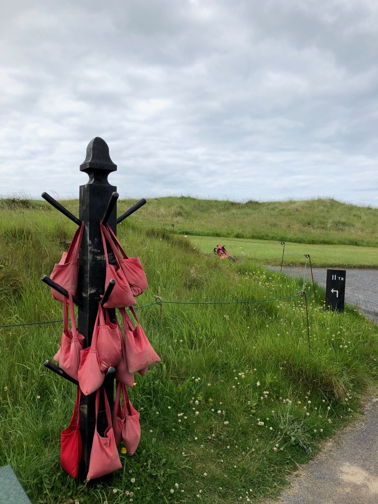 Strandhill begeistert uns alle. Die Bahnen bleiben spannend bis zum Schluss, die Grüns fordern uns mit fast immer doppelten Breaks, die Ausblicke sind wunderschön. Immer wieder kommt die Sonne hervor und dann wechseln Licht und Schatten auf dem Platz und machen ihn noch dramatischer. Trifft man auf einen Flight (zweimal kreuzen sich die Wege zu den Abschlägen), grüßt man freundlich und wechselt ein paar Worte, das machen die Iren so. Was sie auch machen: Pitchmarken ausbessern, wir finden keine einzige. Und wir verwenden natürlich wie sie den Sand in den roten Säckchen, die hier in Strandhill vogelscheuchenartig drapiert sind (Foto): zum Ausbessern der Divots. Very Irish 🙂