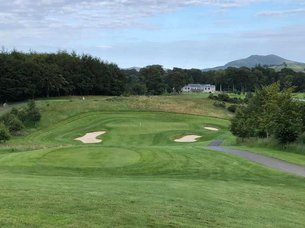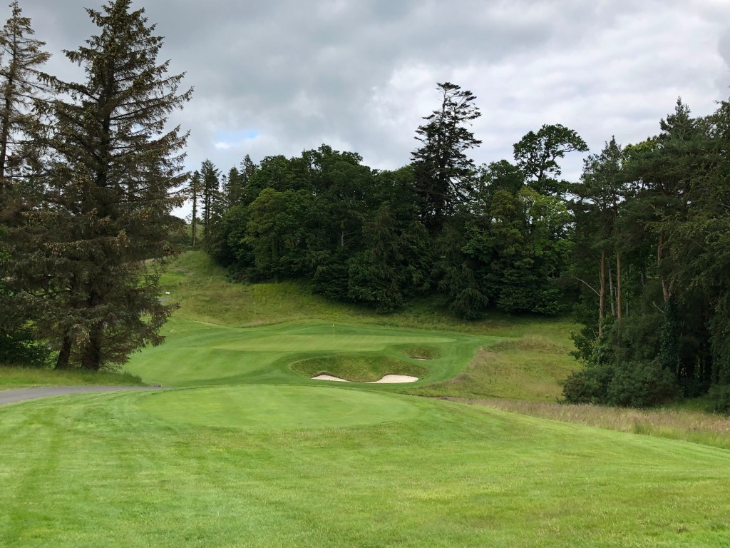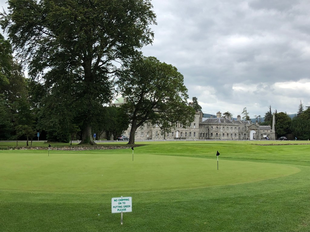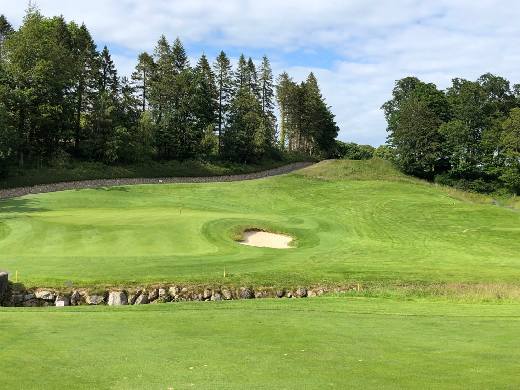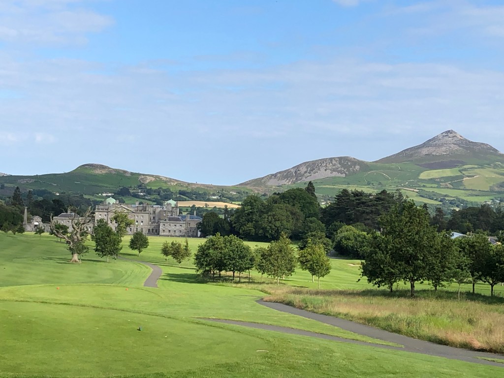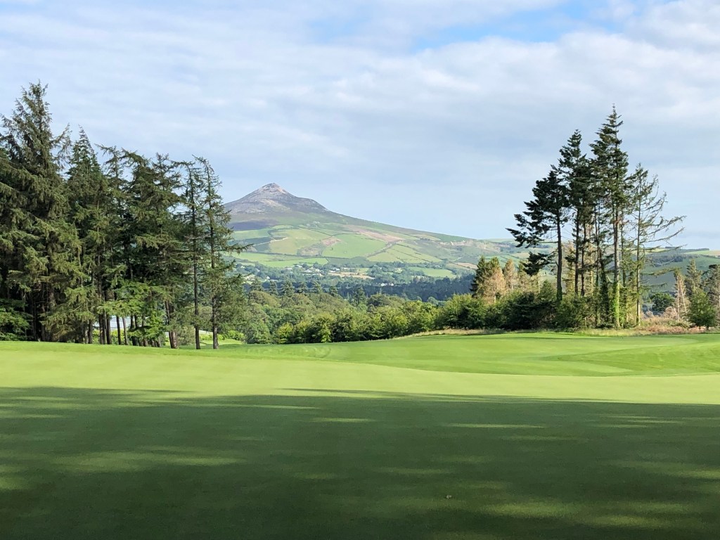 Schon auf dem Weg zum 1. Abschlag liegt links das beeindruckende Powerscourt House vor dir (Foto) und ich ignorierte das Putting Green (was sich wenig später als Fehler herausstellen sollte). Der Kurs beginnt mit einem Par 5, leicht ansteigend, auf samtigem Fairway, das Grün schon von weitem zu sehen und so in etwa bleibt es auch. Der Platz ähnelt eher jenen, die wir in Österreich kennen. Leicht bergauf und bergab, ein paar Kuppen, etwas Wasser, von Bäumen bis Wald umgebene Grüns. Die Fairways sind allesamt topgepflegt, die Grüns affenschnell. Wir erinnern uns, Putting Green, leider nein… Die Bahnen spielen sich gut, weil auch nicht allzu lang. Außergewöhnlich für mich, weil in den letzten fünf Tagen Luxus: Man sieht vom Tee bis zur Fahne und kann sich dem Loch von Anfang an strategisch nähern. Oder sich zu nähern versuchen. Zwischendurch wohl einige Doglegs oder erhöhte, von Bunkern gut verteidigte Grüns, aber das macht den Platz spannend. Auf den letzten Bahnen geht es bergab, weniger was das Spielkönnen betrifft, sondern deren Verlauf. Die Aussicht ist atemberaubend, das Herrenhaus sowieso, dahinter immer der Sugar Loaf im Blick und auf den Fotos, der Zuckerhut, der der Gegend ihren Charakter gibt (Foto). Es ist fast 19:30 Uhr, immer noch taghell hier in Irland und ich genieße die Ruhe und das Spiel sehr.