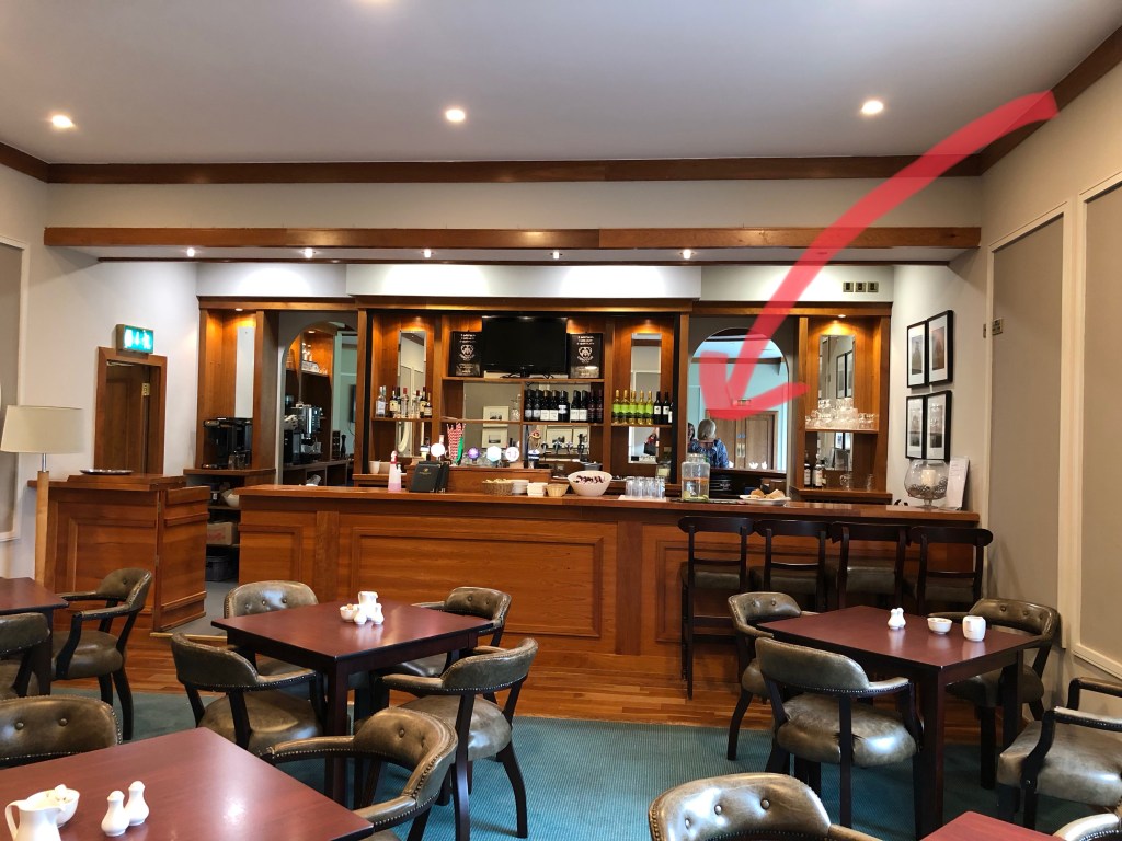 Das ändert sich, als ich das Clubrestaurant betrete. Ich bin nach der Runde mit meinem Mann hier verabredet, um ihm eines der „netten irischen Clubhäuser“, die ich bis jetzt kennengelernt habe, zu zeigen, schicke ihm aber sofort nach Betreten per Whatsapp: Wir essen besser im Pub. Das Restaurant hat doch tatsächlich zwei streng voneinander getrennte Bereiche: einen eher spartanischen ohne Tageslicht für Gäste, einen chic eingerichteten mit toller Aussicht auf den Platz für die Mitglieder. In der Mitte, mauergleich, die Theke. Der Barmann kann beide Seiten bedienen, und als Gast kannst du immerhin rüberschauen in den Membersbereich (Foto). Ist sicher auch praktisch, wenn man die Runde mit einem Mitglied spielt, der Unterhaltung wegen…