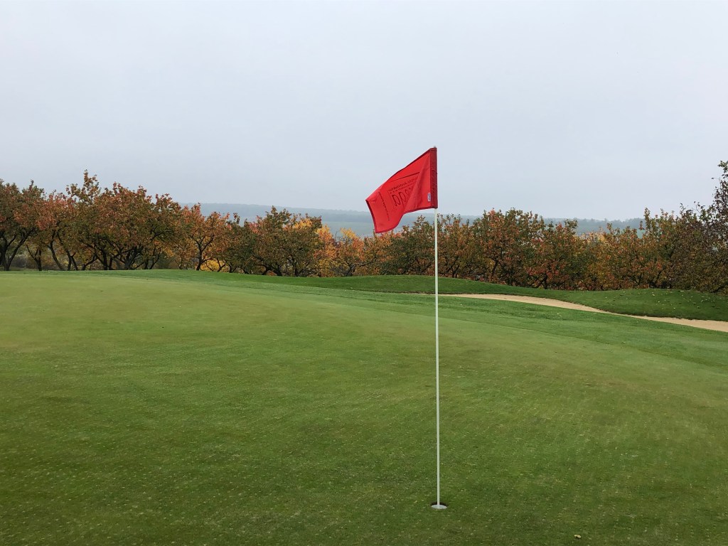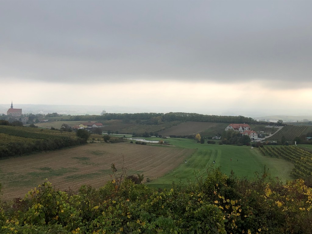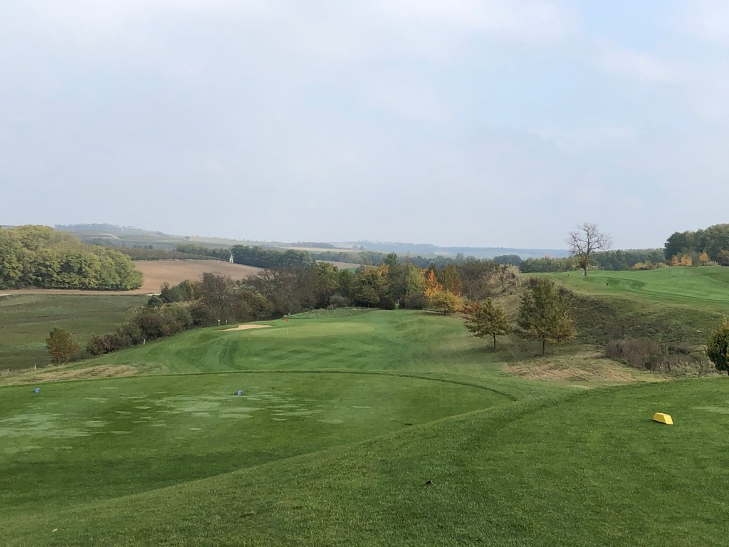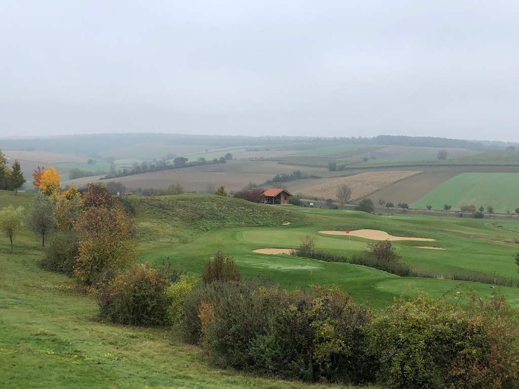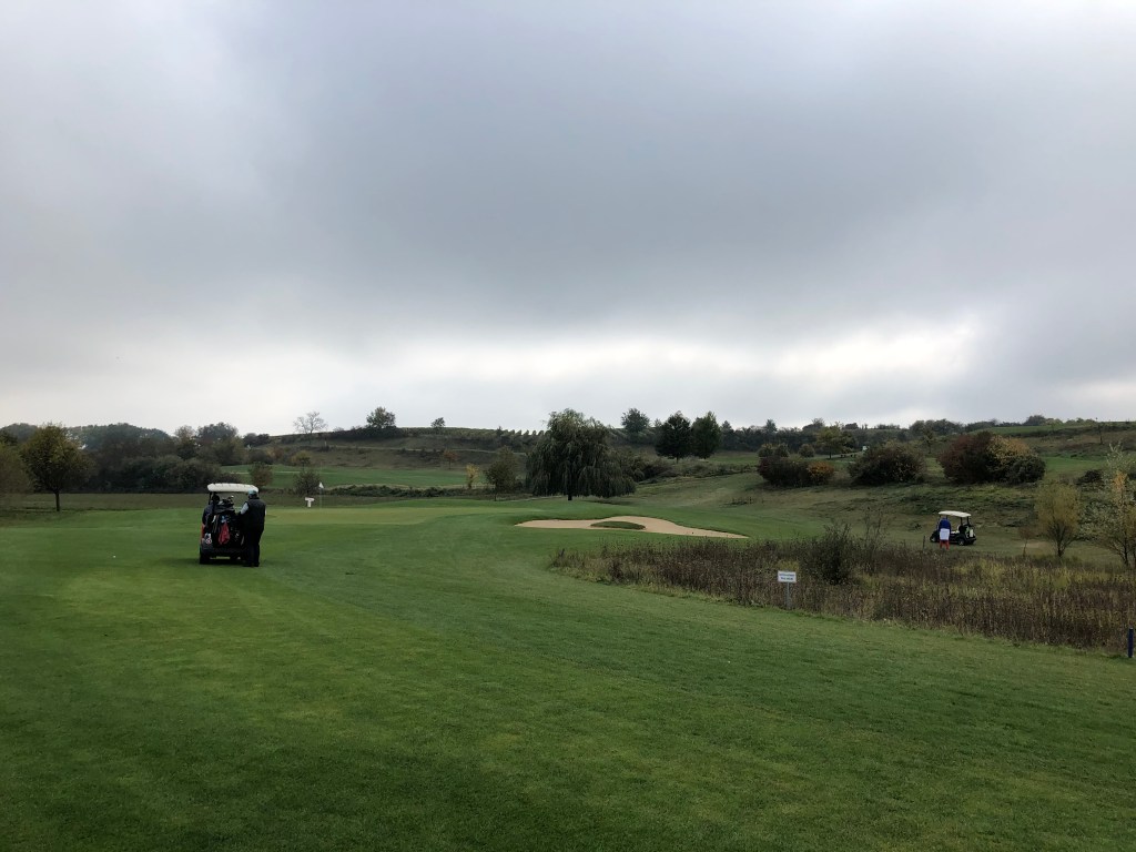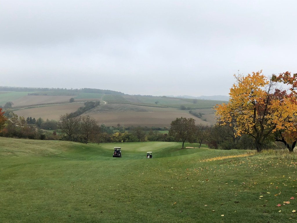 Oben angekommen, geht es weiter mit einem sanften Kurs entlang gelbleuchtender Marillenbäume, durch Weingärten, an Feldern entlang. Zwischendurch immer wieder wunderschöne Ausblicke ins Land. Und obwohl Poysdorf gut besucht ist an diesem Samstag, wähnt man sich auf vielen Bahnen völlig allein auf dem Platz. Die Fairways sind top in Schuss, die Bälle rollen immer noch gut. Im Sommer, hören wir, ist der Platz deutlich härter. Wasserhindernisse gibt es hier kaum, trotzdem spielt sich der Championship Course alles andere als einfach und die zwei Schläge zusätzlich zur Stammvorgabe benötigen wir alle dringend. Oft lauern Outgrenzen, meist sind die Grüns extrem gut bunkerbewacht, nicht immer ist der Stand gerade. Trotzdem ist der Platz fair zu spielen, obwohl es rauf und runter geht auf manchen Bahnen und auf der Runde einige Höhenmeter zusammenkommen. Zu Fuß geht man den Platz allemal, spätestens auf der 18 wird man belohnt: Vor allem von den Herrenabschlägen bietet sich ein wunderbarer Blick auf Kirche, Ort und Clubhotel, natürlich aber auch auf die Landezone des tief unten liegenden Fairways. Der Abschlag von hier aus ist eine reine Freude, auch schon einmal für Damen, die sich das nicht entgehen lassen wollen. (Im Acker daneben wird der Bauer wohl reich sein nach der „Ernte“: Dort liegen, schon mit freiem Auge erkennbar, unzählige weiße Kugeln in den Furchen 😉