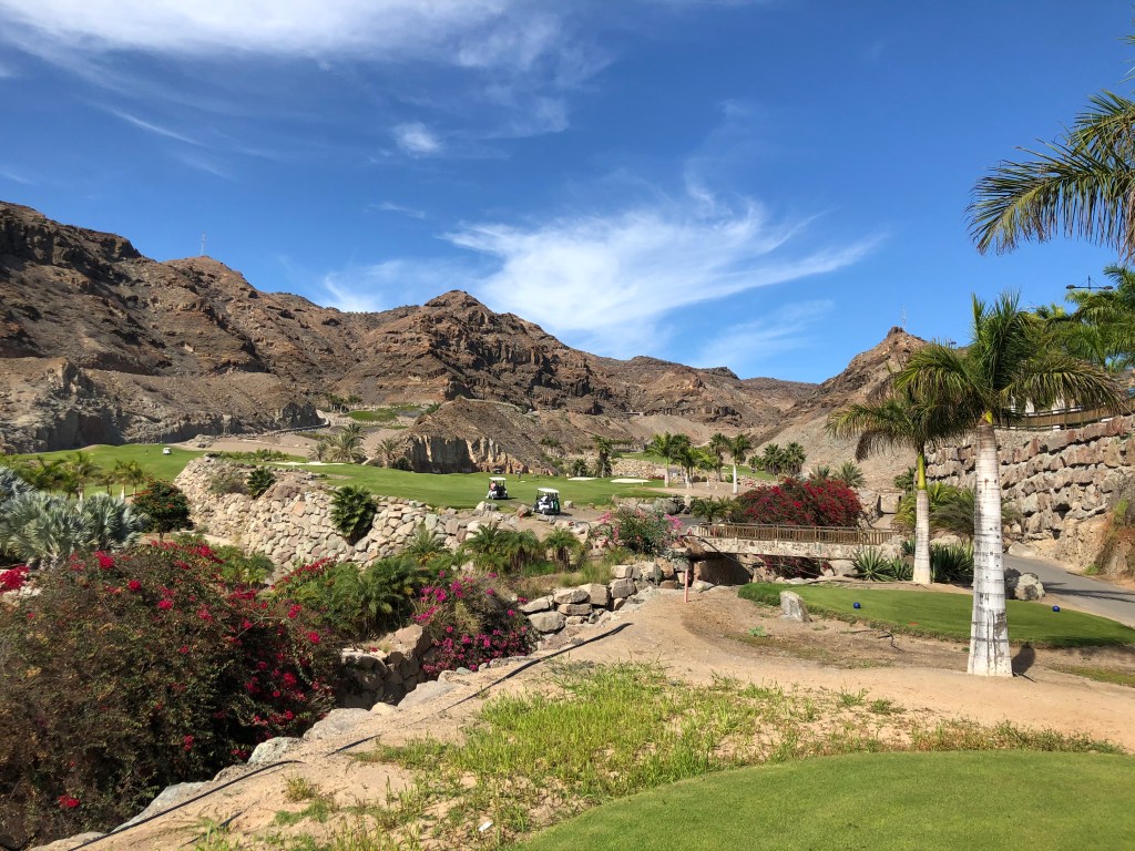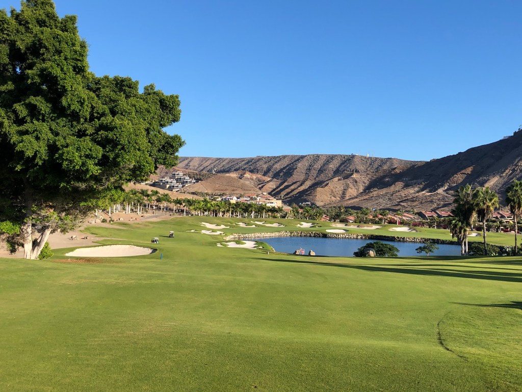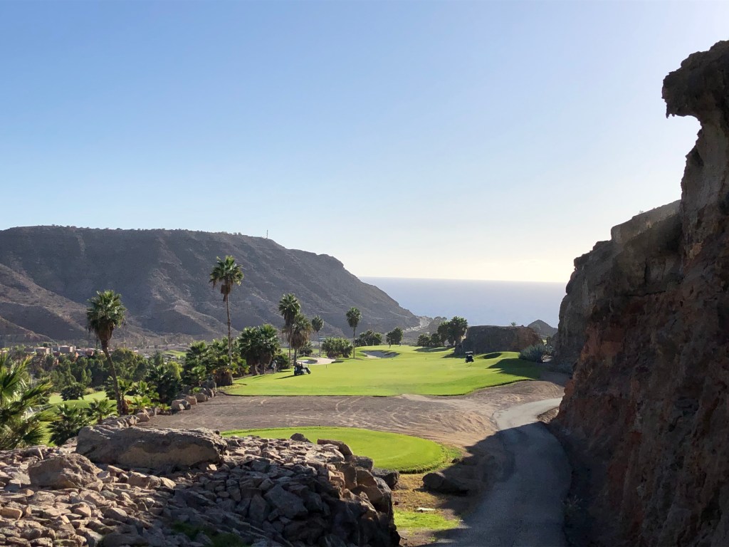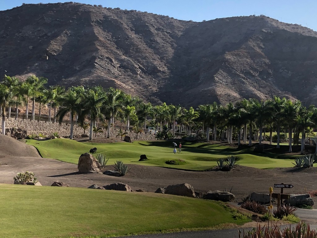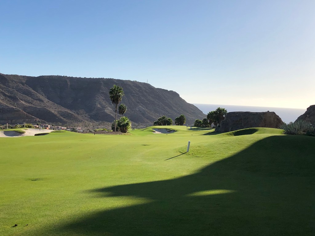 Ergänzt wurde das Ganze an diesem Spätnovembertag durch einen azurblauen Himmel und strahlenden Sonnenschein. Dass die Stimmung in der Gruppe hervorragend war, liegt auf der Hand. Noch ein Kaffee auf der Clubhausterrasse, die gleichzeitig die Hotelterrasse ist, dann die Carts aus der Garage geholt, in die dienstbare Geister schon unsere Bags geladen hatten, und los ging’s. Auch hier: Unbedingt fahren, die Wege zwischen den Bahnen sind weit und steil. Aber: Die Fairways sind deutlich breiter und vor allem gerader als in Salobre, und du hast meist einen ebenen Stand, außer du schießt deinen Ball in die (optisch wunderschönen) Wellen an den Fairwayrändern oder die großzügige verteilten, steindurchsetzten Waste Areas entlang der Bahnen, was du vermeiden solltest, wenn dir dein Schläger lieb ist…