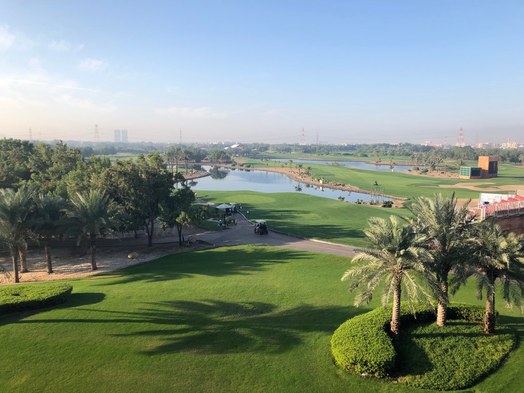 Wow, dachte ich, als ich zum ersten Mal auf den Balkon unseres Zimmers im Westin Hotel ging und auf den unmittelbar davor liegenden Platz schaute: Rechts das auffällige Clubhaus mit dem Riesenfalken, das ich vom Fernsehen natürlich kannte, unter mir der Abschlag der 1, dazwischen die feinschattierten, akkurat gemähten Fairways der 9 und der 18 und an deren Rand die bereits aufgebauten Tribünen in Rot. Ein grandioser Blick, wäre da nicht die riesige Hochspannungsleitung, die praktisch hinter dem gesamten Platz vorbeiläuft. Aber so etwas blenden wir Golfer/innen gekonnt aus und konzentrieren uns auf das, was schön ist: den top gepflegten Golfplatz.