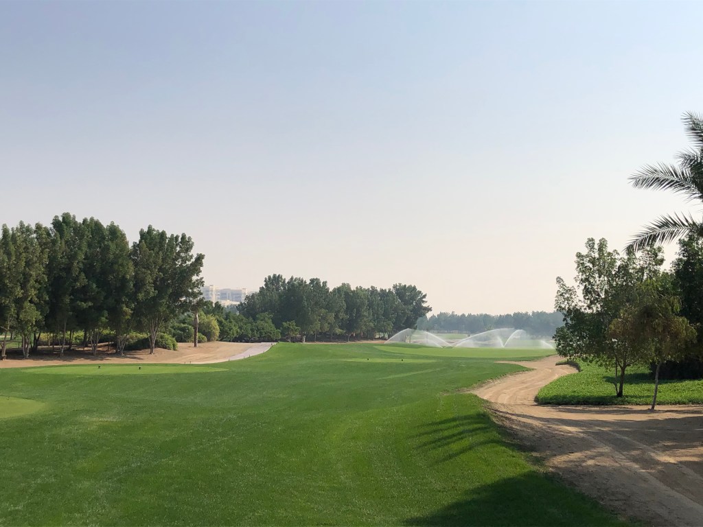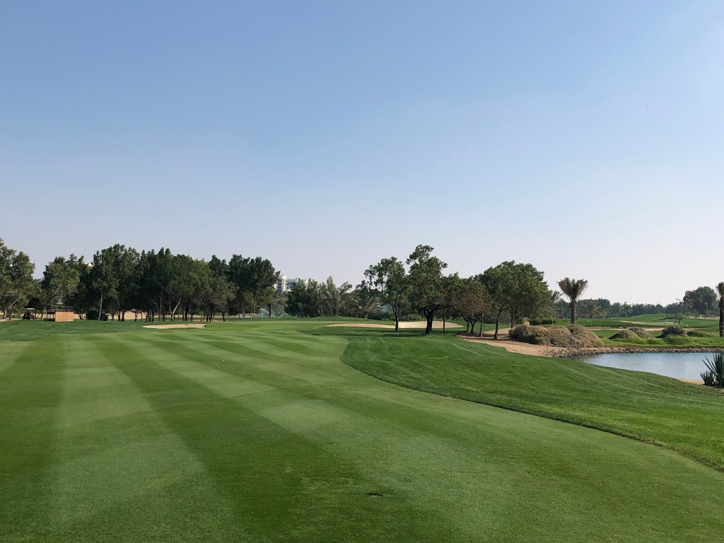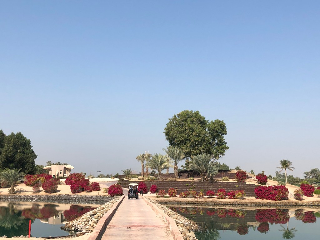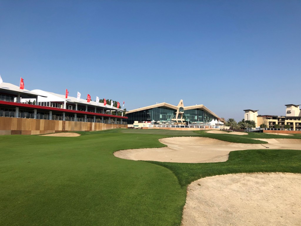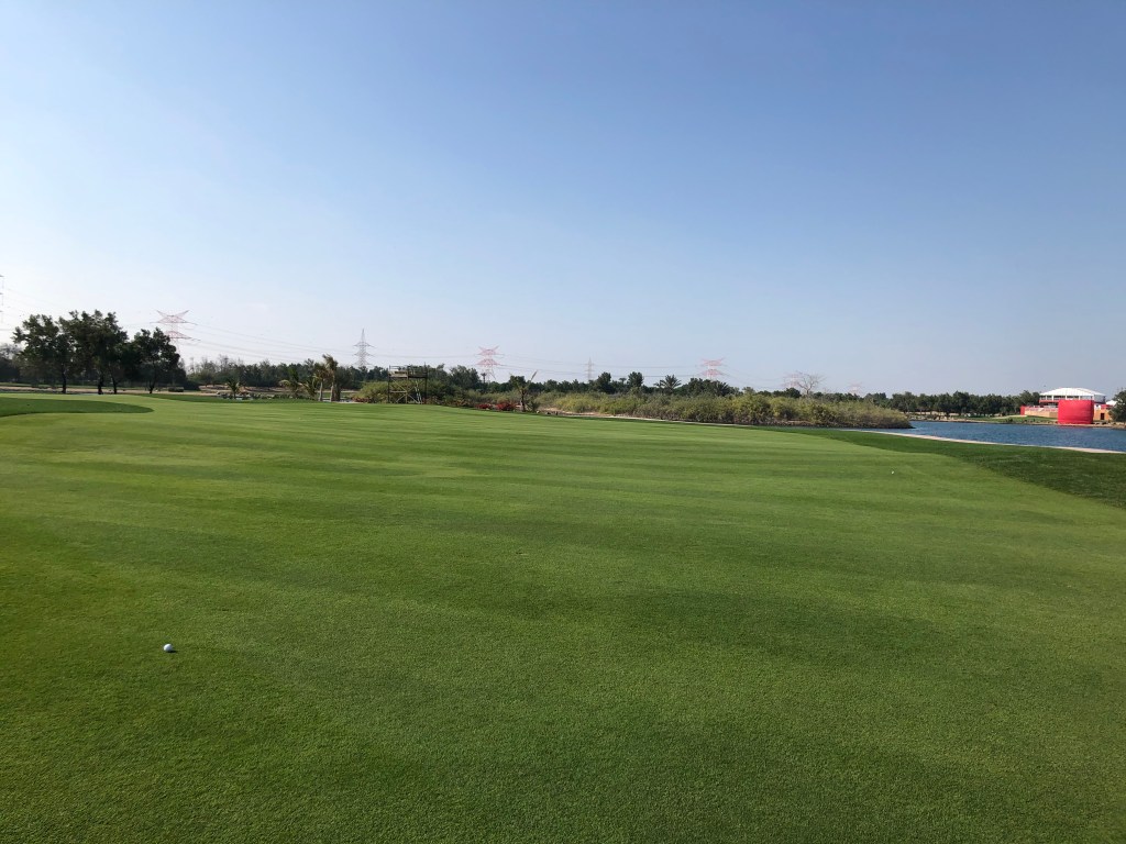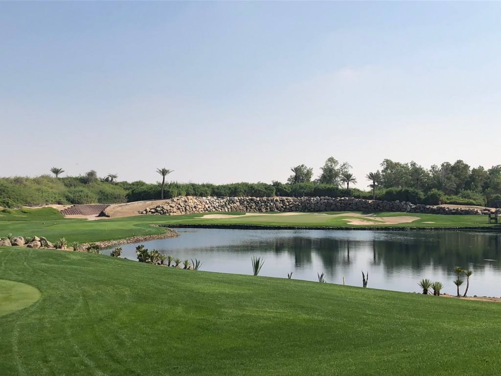 Genau deshalb macht der Platz aber auch Menschen Spaß, die ihr Geld nicht mit Golf verdienen und bloß eine schöne, würdevolle Runde gehen wollen. Mir, zum Beispiel. Ich habe noch nie zuvor einen Platz mitten in der Wüste gespielt. Die merkt man natürlich, nicht nur an der heißen Sonne und den Bewässerungsanlagen. Gleich hinter dem Out ist ein Zaun und dahinter das, was wir in Österreich „Gstettn“ nennen. Baumaterial, Container, Zelte stehen dort herum, wahrscheinlich bis zur nächsten Autobahn. Denn, das muss man sagen: Das ganze wunderbare Resort befindet sich mitten in einem riesigen Autobahnkreuz im Nirwana. Bis nach Abu Dhabi fährst du mit dem Taxi gut 20 Minuten, zum Meer oder den anderen beiden Golfplätzen auf Saadiyat und Yas Island fast 30. Das sollte einem bewusst sein, wenn man hier im Hotel wohnt. Andererseits: Man hat den Championship Course vor der Tür, einen weiteren 9-Loch-Platz und eine Driving Range, die dank Flutlicht auch nächtens genutzt werden kann.