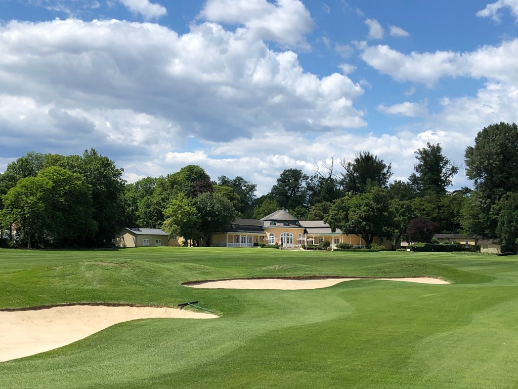 Der Wind weht uns kräftig um die Ohren an diesem Juni-Dienstag. Dicke weiße Wolken ziehen tief über den Himmel und sorgen für ein dramatisches Licht-Schatten-Spiel auf dem Platz. Wir sind im ehrwürdigen Golf Club Wien, der fast zur Gänze innerhalb des Ovals der alten Galopp-Rennbahn in der Freudenau im Wiener Prater liegt. Nur die 1 und die 18 führen vom Clubhaus weg bzw. zu diesem zurück, dann quert man die Rennbahn (nicht ohne die diversen „Achtung-Pferde“-Warnschilder beachtet zu haben) und findet sich auf einem höchst interessanten Gelände wieder. Der Platz ist eine Mischung aus Parkland- und Links Course. Auf den ersten Löchern und zwischendurch wunderschöner alter Baumbestand, dann der typisch karge, grasbewachsene Boden wie in den Links an den Küsten. Auf den harten Fairways springen die Bälle nach der Landung noch fröhlich und rollen weit aus. Das ist bei langen Transportschlägen ein Vorteil, nicht aber in der Nähe der Grüns. Linkscoursetypisch säumen nämlich unzählige tiefe Bunker Fairways und umgeben die Grüns und sind aus der Ferne kaum zu erahnen. Der Blick ins Birdiebook lohnt bei der allerersten Runde allemal. Die Umgebung der Bunker ist mit grasigen Gefällen gebaut, sodass der Ball unweigerlich hineinrollt. Das ist gefährlich für den Score und auch wieder nicht: Die Freudenau hat nämlich den feinsten, fluffigsten Sand, den ich je gespielt habe. Hier gelingt das mit dem Sandpolster unter dem Ball ganz einfach – und zwar jedes Mal.