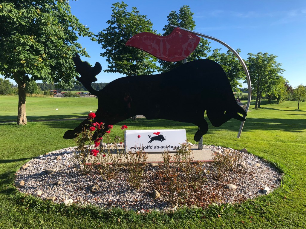 Am Clubhaus vorbei und am großen Stier, dem Clublogo (das aber NICHTS mit dem berühmten Salzburger Getränkehersteller zu tun hat) geht es auf die 10. Und dort passiert etwas Herrliches: Du kannst dir aussuchen, welches Grün du anspielen magst!! Es gibt nämlich ein leichtes ohne Wasser davor und ein schwieriges hinter dem Teich. Par 5 bleibt Par 5 und die Wahl dir überlassen. Wo gibt es das sonst?