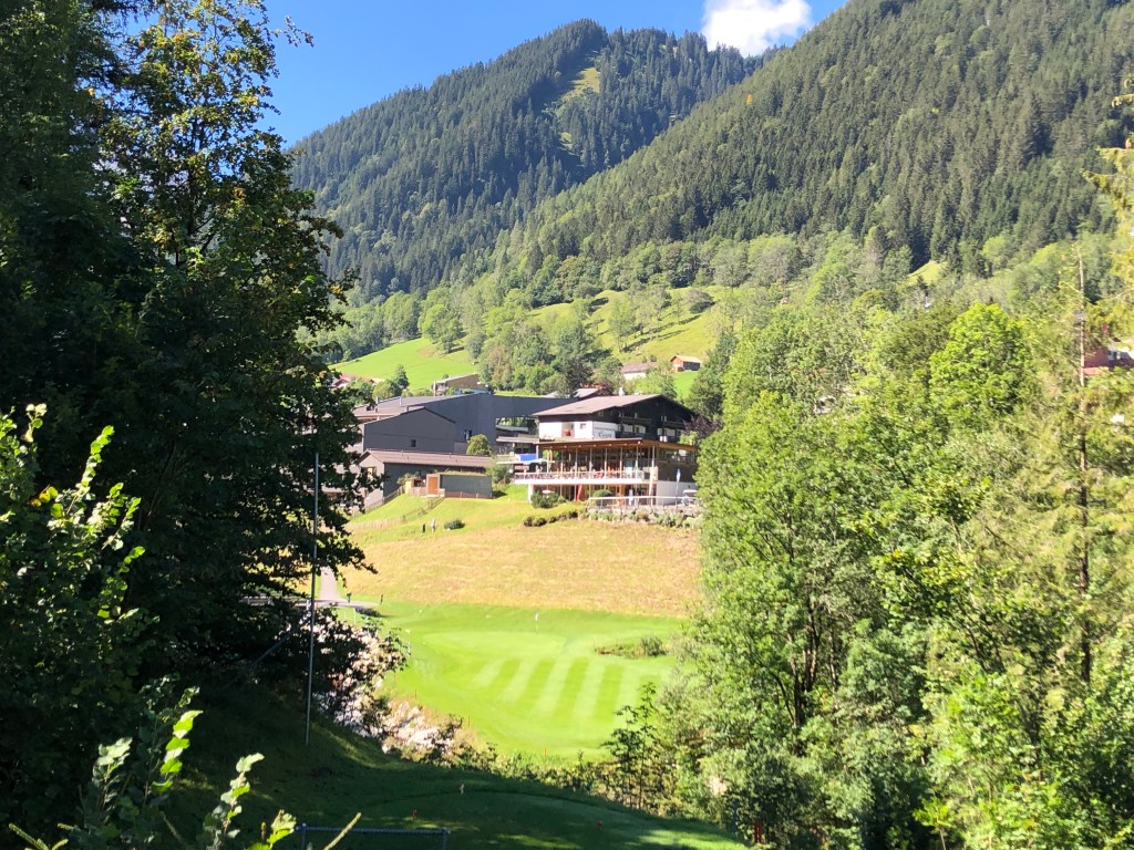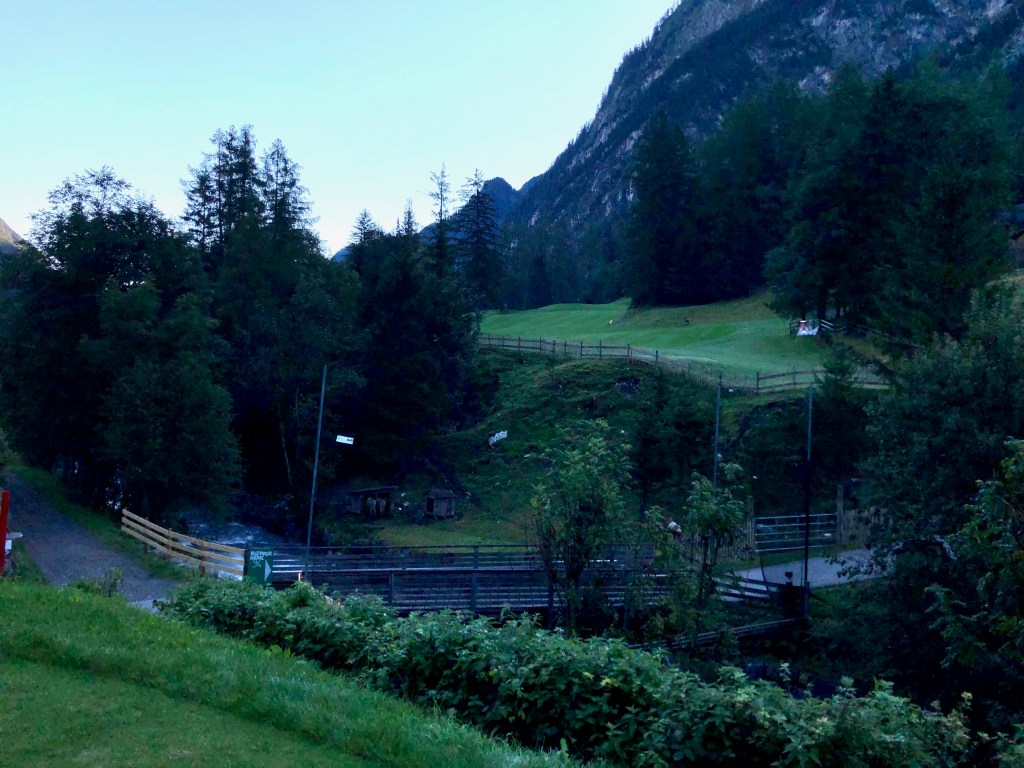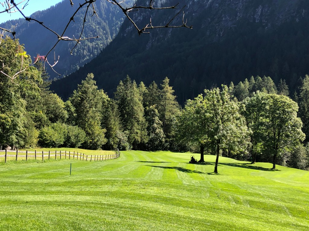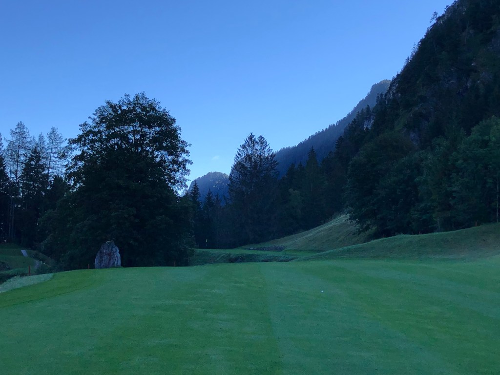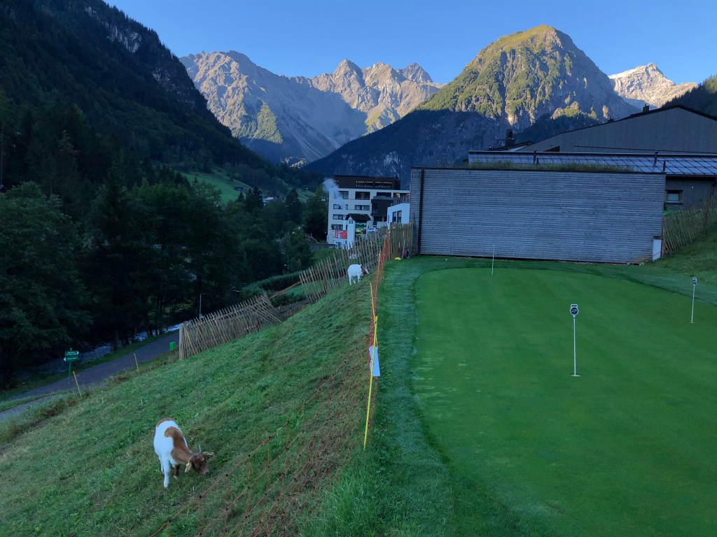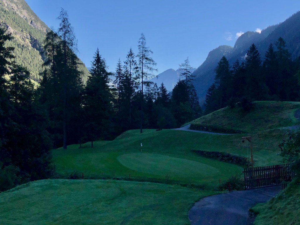 Was mache ich immer, wenn mein Spiel, nunja, sagen wir, mäßig ist? Ich erfreue mich an anderen schönen Dingen. Der Landschaft, zum Beispiel. Und die ist wirklich unglaublich hier. Berge, Gletscher, Wiesen, Kühe – alpenländischer und österreichischer geht kaum! Langsam schafft es dann auch die Sonne ins Tal und ab der 15 beginnen die Fairways endlich zu leuchten. Die 15 schlägst du übrigens steil bergab über ein Biotop und den Fluss in den Gegenhang mit Bäumen, ehe es WIRKLICH steil bergauf geht zum Grün irgendwo oben am Horizont, aber das nur nebenbei. Die 18, ein Par 3, spielt man dann wieder von hoch oben auf das Grün direkt vor das (eher unter das) Clubhaus. Emil und ich haben für 18 Löcher und fast 11 km gerade mal 3:20 Stunden gebraucht, außer uns sind noch kaum Menschen hier und schon gar niemand, der mir von der Terrasse aus zuschaut. Obwohl, die Ziegen, vielleicht.