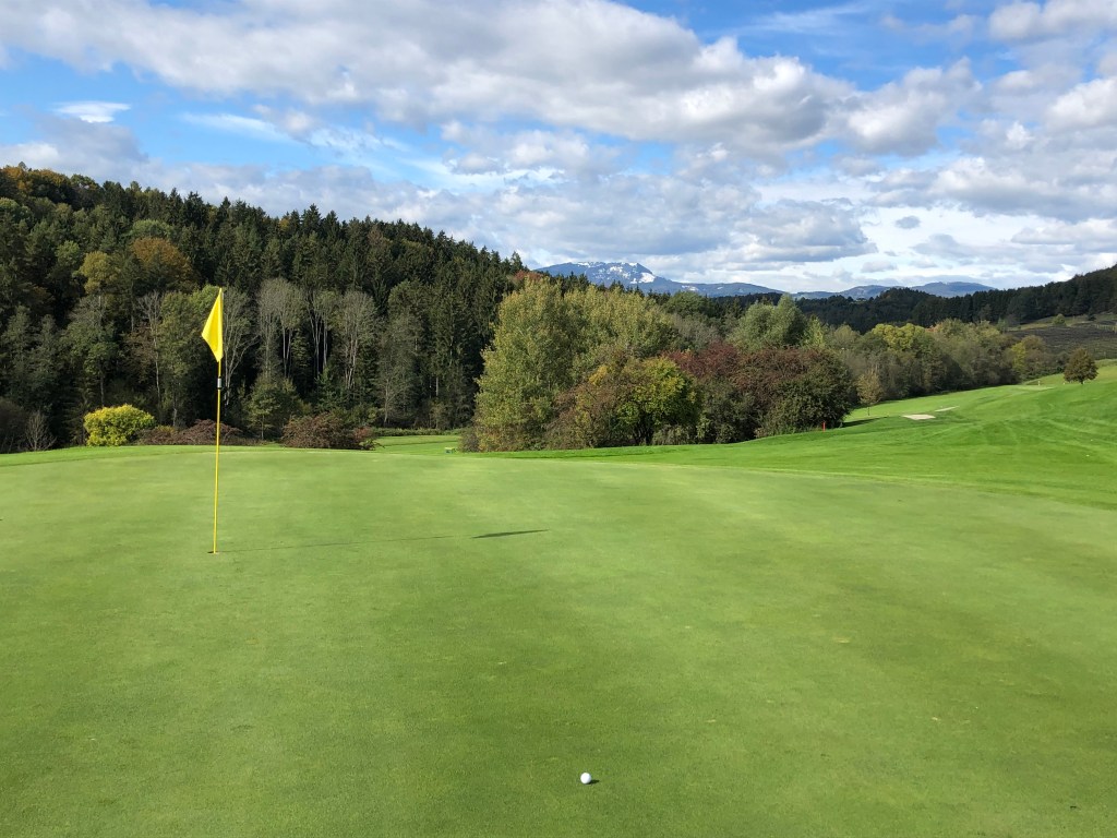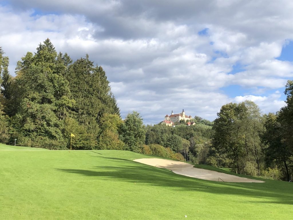 Belohnt wird man, weil die Bahnen nicht allzu lang sind und auch immer noch fair zu spielen. Die Fairways sind wie Teppiche, akkurat gemäht, das Rough ist relativ milde, die Grüns sind ziemlich flott. Perfekt gepflegt ist hier alles bis ins (fehlende) Unterholz, so dass du auch Bälle gut wiederfindest, die aus irgendeinem Grund nicht Mitte Fairway liegen geblieben sind… Belohnt wird man aber auch zwischendurch immer wieder durch feine Ausblicke, etwa wenn in der Ferne Berge mit dem ersten Schnee der Saison auftauchen. Oder aber mit dem Blick auf Schloss Freiberg, das besonders auf den zweiten Neun omnipräsent zu sein scheint.