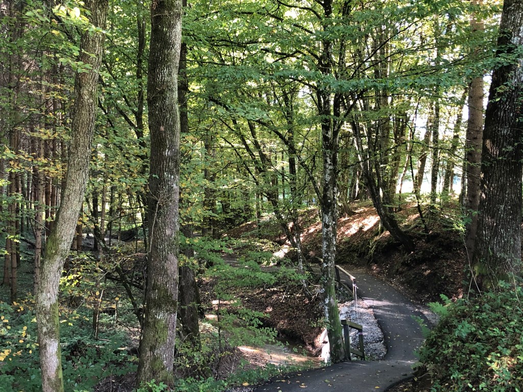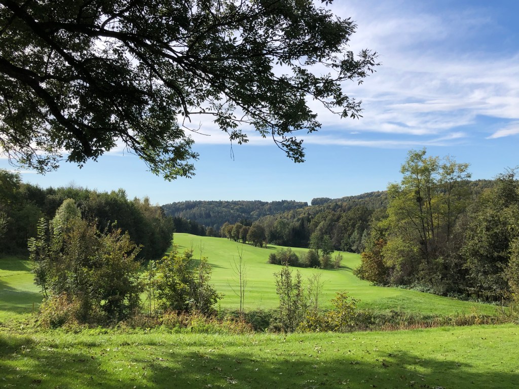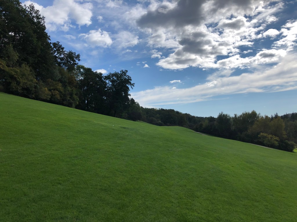 Was jetzt kommt, zählt zu den schönst gelegenen Golfanlagen, die ich kenne. Man spielt mitten im Wald, der sich erst leicht zu verfärben beginnt, an Bächen entlang und an ganz wenigen verstreuten Höfen vorbei. Zwischen der 11 und der 12 geht es ein ziemlich langes Stück durch den Laubwald, neben uns gluckert ein Bach. Ja, man könnte von „langen Wegen zwischen den Bahnen“ sprechen – man kann die hier aber auch genießen! Eine Runde in Freiberg bringt beides: Golfen und Landschaft als Gesamtpaket. Golferisch gefällt mir besonders die 13, im letzten Drittel ein scharfes Dogleg mit erhöhtem Grün. Knifflig, aber mit ein wenig Strategie gut zu spielen die 16 vom hochgelegenen Abschlag in die Tiefe, dann um die Ecke über den Teich wieder hinauf. Bergauf der Abschlag der 17, wieder über eine Kuppe. Ohne Platzkenntnis setzen wir den 2. Schlag zu weit nach links und stehen dann vor dem Problem, dass das (winzige) Grün hinter dem Teich liegt und hier ganz klar besser über rechts zu spielen gewesen wäre. Der Weg zur 18 ist der einzig wirklich steile, die Bahn würden wir bei der 2. Runde auch anders spielen…