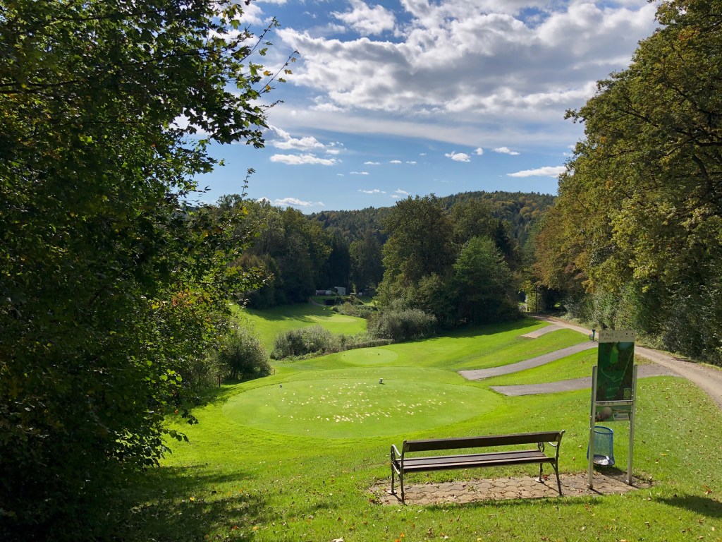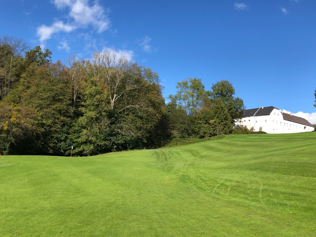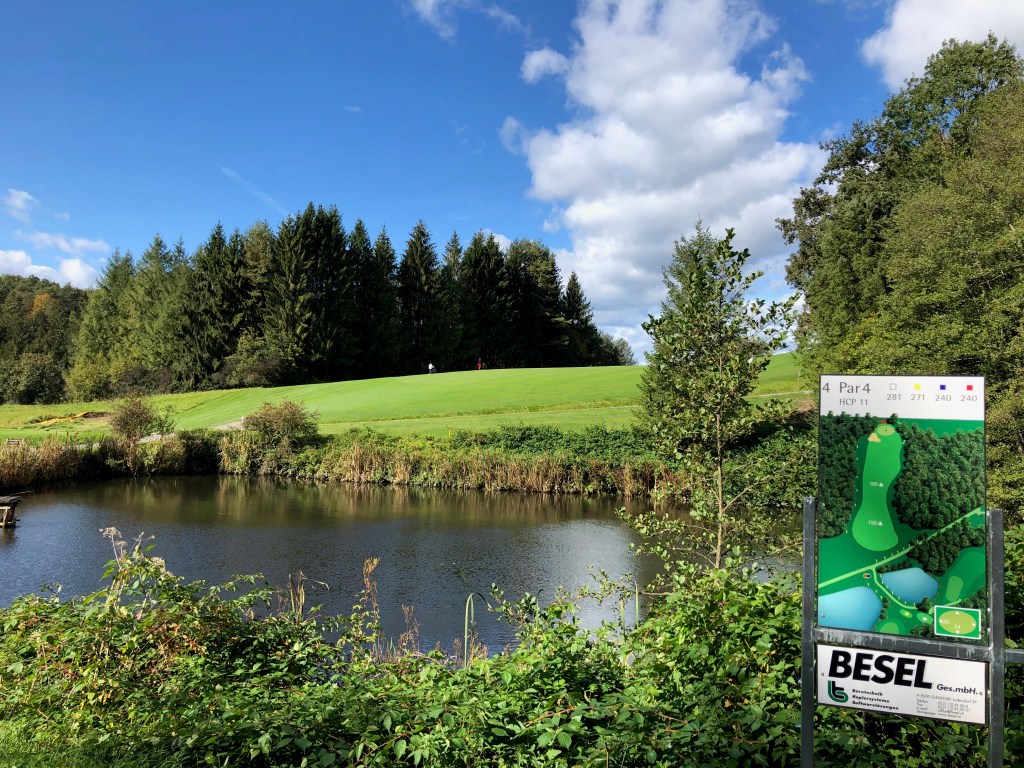 Sonniger Empfang schon im Sekretariat. 49,- Greenfee bezahlt man um diese Jahreszeit, und den Logoball für meine Sammlung gab’s geschenkt, dazu eine herzliche Verabschiedung auf die Runde. Die beginnt gleich um die Ecke des Clubhauses und schon an Tee 1 sieht man, was einen die nächsten paar Stunden erwarten wird: wenig Ebenes und viel seitlicher Wald. Das Par 5 zum Einstand geht bergab, dann schräg bergauf und beim Grün bleibt man besser kürzer als länger, weil es dahinter wieder steil bergab geht.