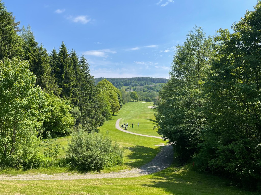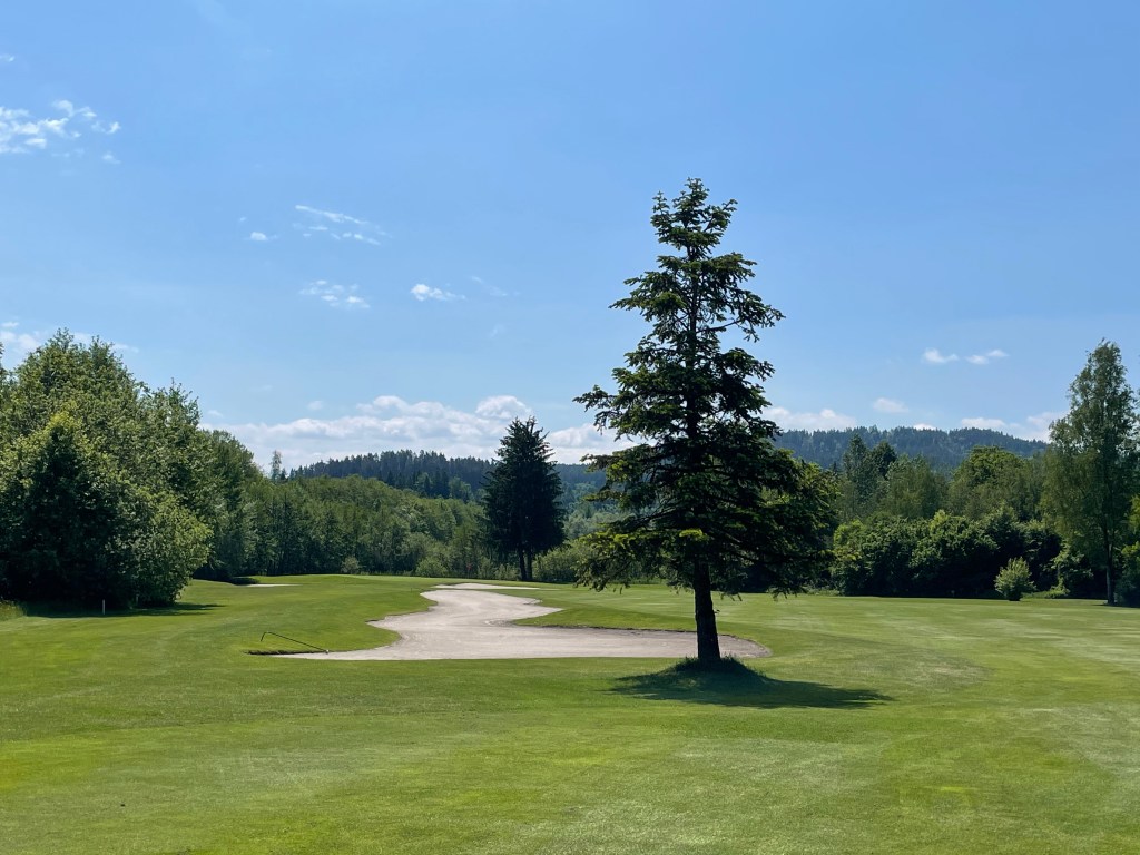 Die 4 ist ein Par 3, das Grün liegt tief unter uns, das liebe ich! Seltsamerweise üben der Zaun und das Gärtchen auf der rechten Seite magische Anziehungskraft aus – mir gelingt der Schlag auf das Grün und jetzt mag ich solche Bahnen gleich noch lieber. Auf der 5 zeigt sich, was für den Platz charakteristisch ist: Die Bahnen fangen meist harmlos an, die Fairways sind breit, das dicke Ende in Form von mehreren um das Grün platzierten Bunkern kommt am Schluss. Hier ist man auch auf jener Stelle des Platzes, die auf Moorgrund angelegt wurde. Trotz guter Platzpflege, meint die Kärntnerin im Flight, ist der Boden nach starken Regenfällen hier und auf der 6 meist sehr tief. Das ist aber heute nicht der Fall, wir hören nur fernes Donnergrollen und hoffen, trocken zu bleiben.