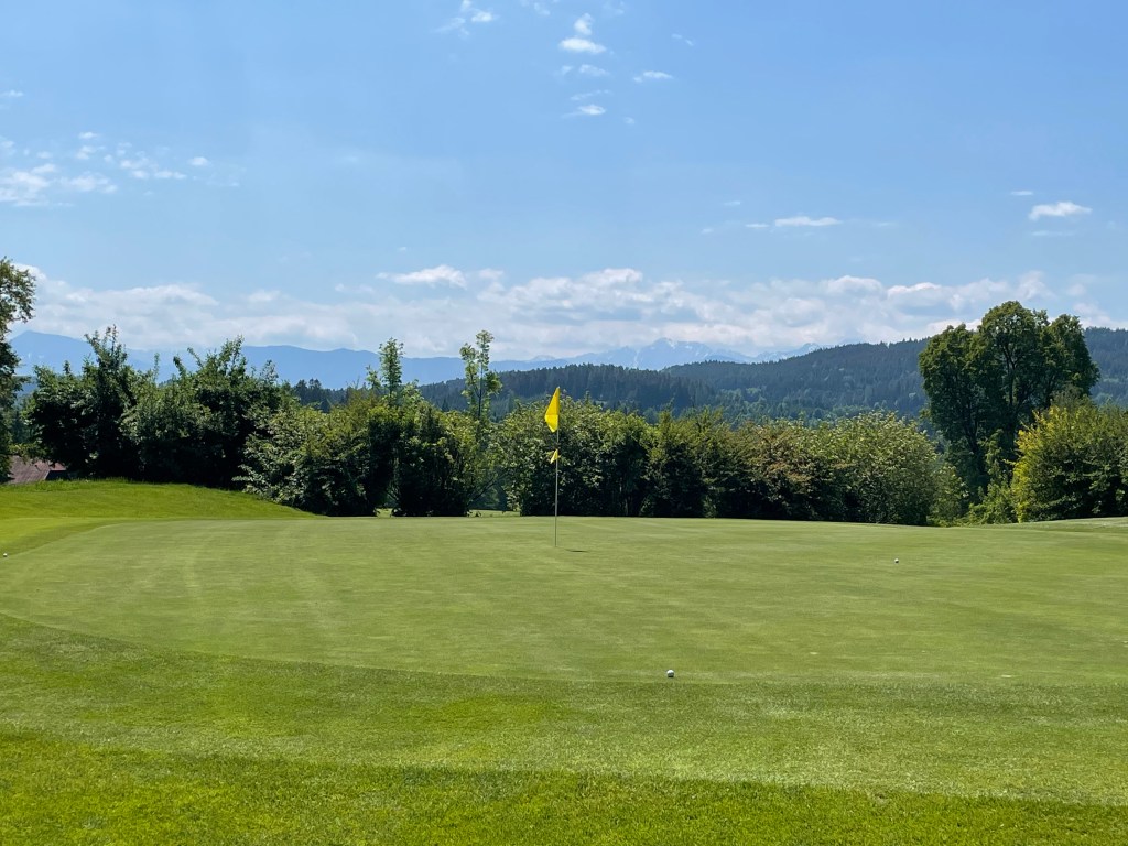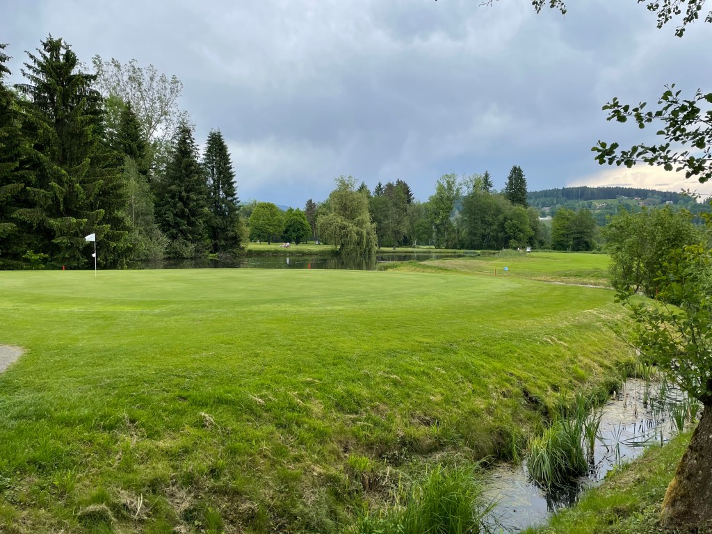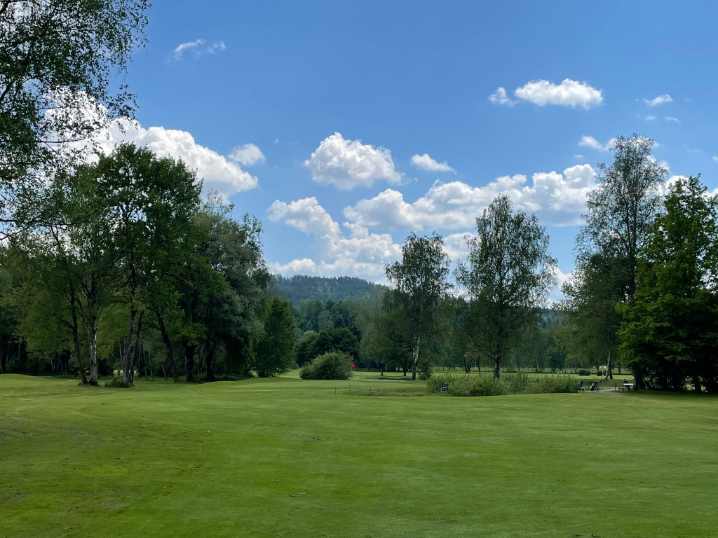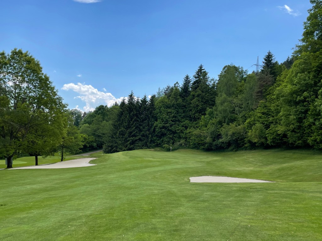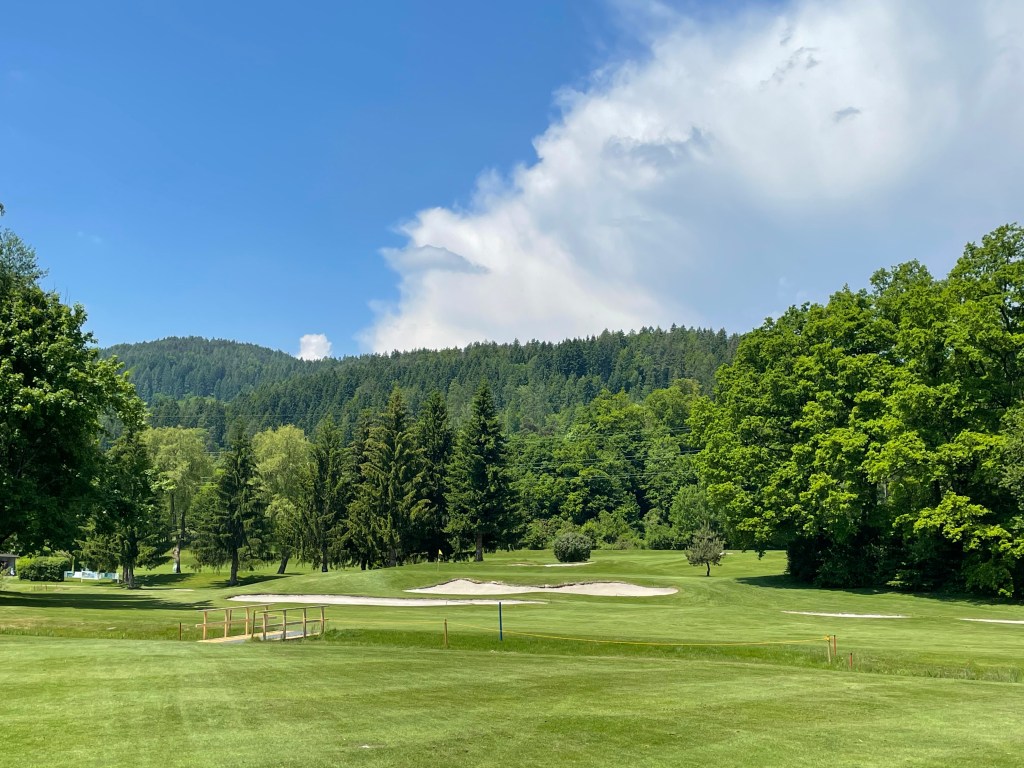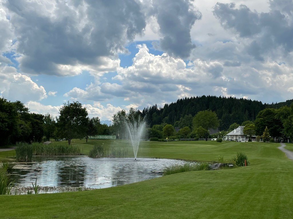 Nach freundlichem Empfang im Sekretariat erst einmal ein Kaffee auf der Terrasse. Chic ist es hier, und ein vorsorglicher Blick auf die Speisekarte macht Gusto auf die Einkehr nach der Runde. Am ersten Abschlag stehen wir dann zu Viert. Man kennt den Platz, merke ich, spiele aber auf der 1 auch ohne Platzkenntnis, aber mit Glück (Bunker!) ein entspanntes Bogey. Hatte gedacht, der Platz sei brettleben, ist er aber nicht ganz. Zur 2 geht’s schon ein Stückerl bergauf, rechts ein schöner Blick auf einen tieferliegenden Abschlag. Die 3 hat ein wenig Schräglage und ist das schwerste Loch, belohnt aber vom Grün aus mit Ausblick auf die Karawanken (glaube ich).