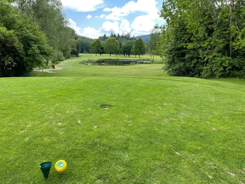 Auf den Back Nine wird es wieder schräger, ein wenig geht es bergauf, die Fairways sind aber schön breit und der Platz bleibt auch hier fair und für höhere Hcps gut und frustfrei spielbar. Sieht man, und das muss auch erwähnt werden, generell von den Grüns ab. Die sind nämlich die langsamsten, die ich bisher gespielt habe. Man glaubt es irgendwie nicht und so mancher Putt bleibt auch jetzt noch deutlich zu kurz. Auf dem Par 3 der 15, zum Beispiel, wo der Schlag übers Wasser auf’s Grün im Nachhinein gesehen gar nicht die eigentliche Schwierigkeit war.