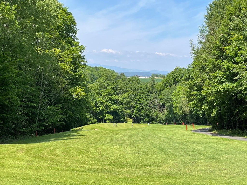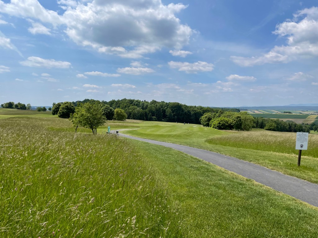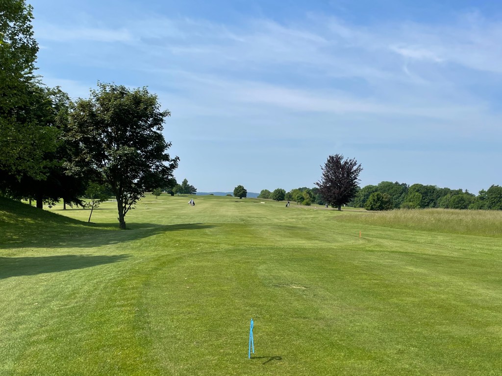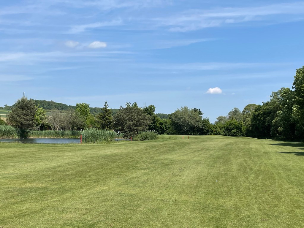 Von nun an geht es wieder bergauf, auf der 8 suche ich das Fairway. Die Bahn schlängelt aufwärts, noch dazu über einen kleinen Bach und das Grün liegt hoch oben. Halfway ist auf Höhe des Clubhauses und von dort geht es auf der anfangs sehr breiten 10 wieder bergab. Vom Knie des Doglegs hat man einen schönen Blick auf das Grün (und die Bunker drumrum), aber auch ins Land.