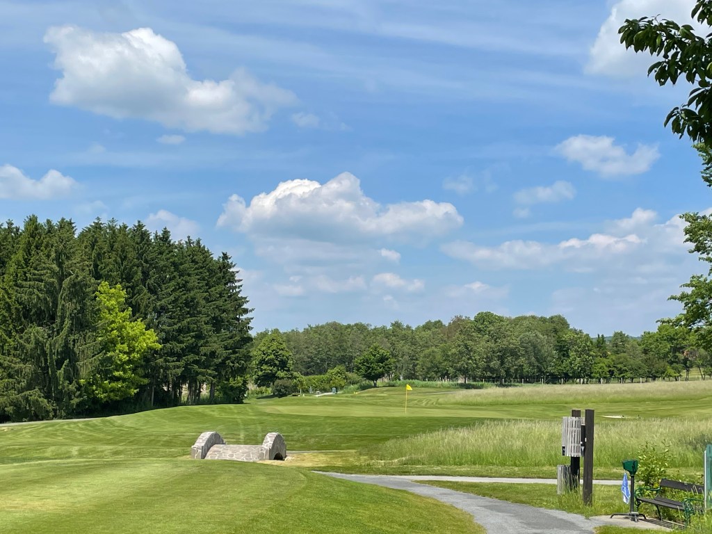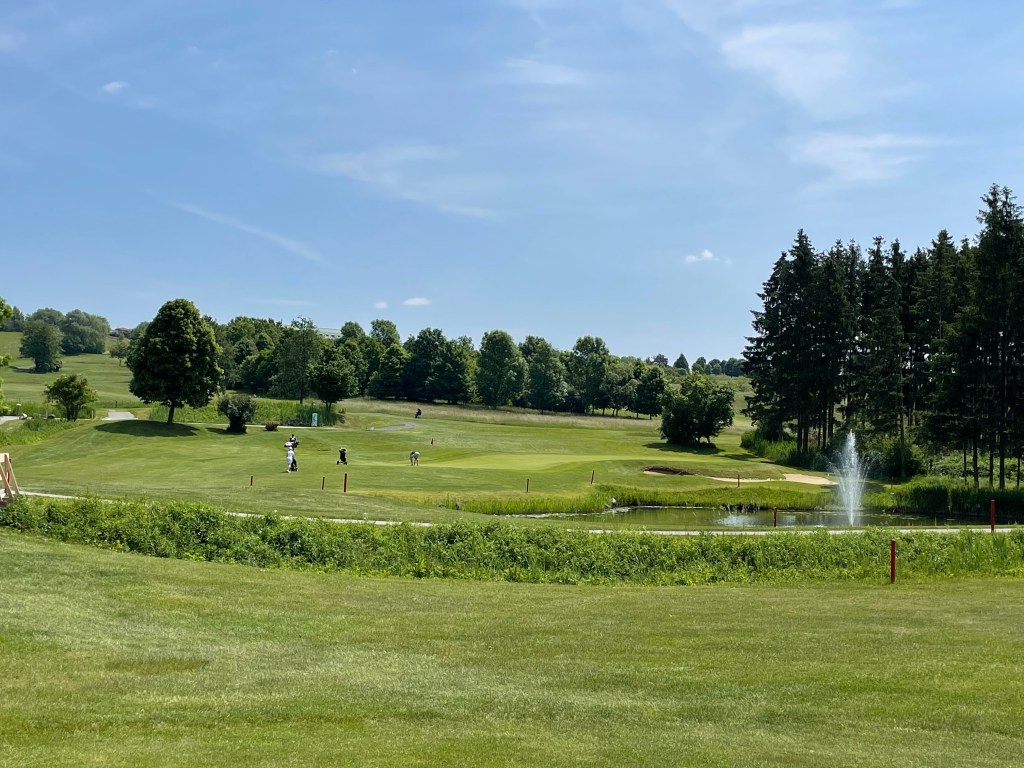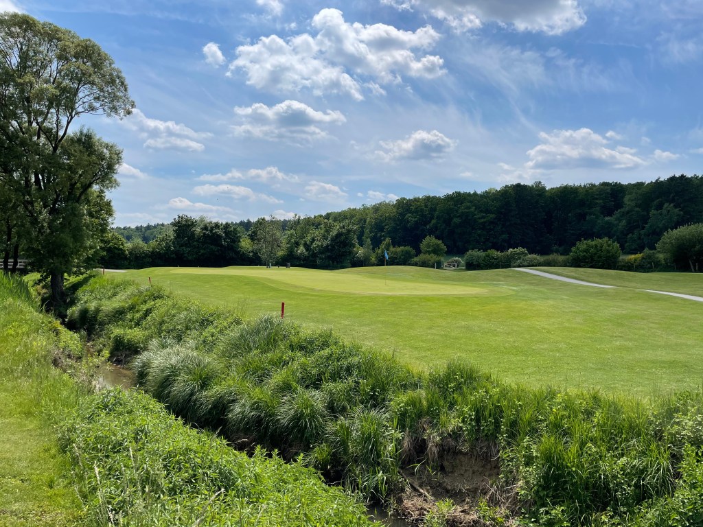 So, aber jetzt zum Platz. Sehr breit liegt das Fairway der 1 vor uns, kurz gemäht und mit schön langem Roll. Drumherum bestimmen hohe Gräser, (Obst)Bäume und schöne Ausblicke das Bild. So eben wie hier bleibt es nicht, schon auf der 3 spielt man bergab auf das tief unten liegende Grün (oder in den Wald seitlich rechts). Unten angekommen geht es wieder eben dahin. Auch neben den Fairways ist kurz gemäht, verirrte Bälle sind gut zu finden. Die 5 dann ist das schwerste Loch am Platz mit einem kleinen Teich vor dem Grün und ich erfahre, wie Bernd Wiesberger das strategisch anlegt. Ich mache das anders und spiele immerhin mein Handicap. Das nächste Par 3, die 7, führt über den Teich mit Fontäne, das Grün ist scheinbar winzig und hängt – eh klar – auch noch Richtung Wasser.