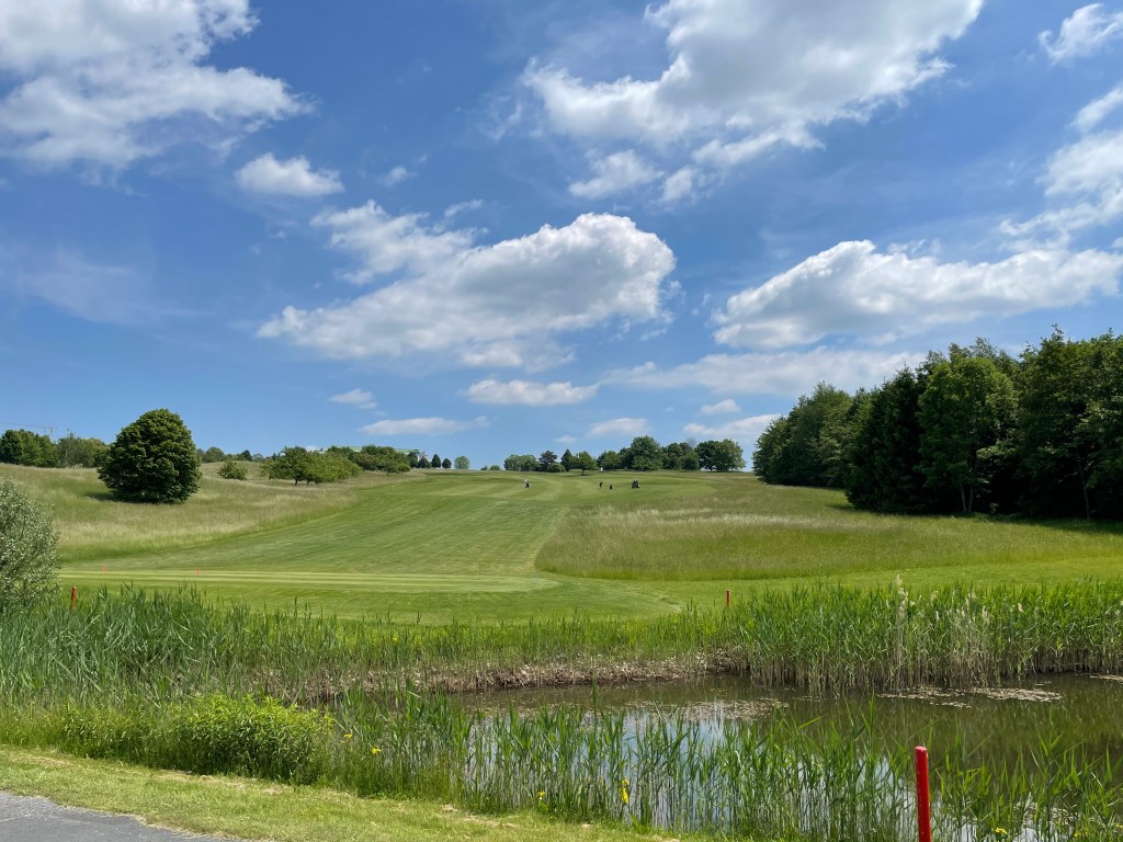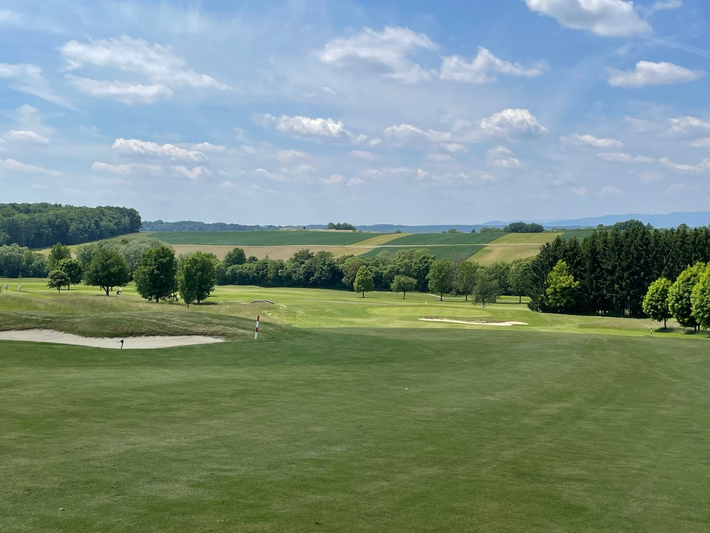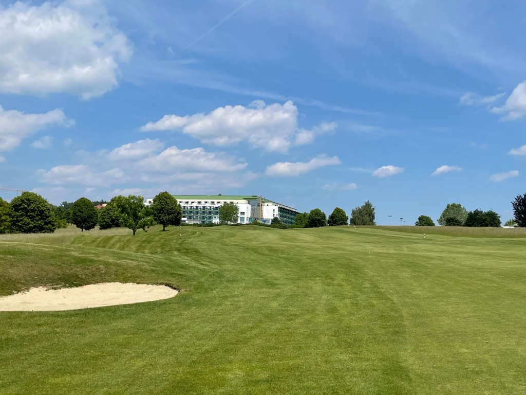 Es ist heiß mittlerweile und wir sind froh, dass ab und zu weiße Wolken über den Platz ziehen und so manchen Aufstieg beschatten. Ein Cart braucht man hier nicht, mit einigem Auf und Ab muss man aber klarkommen. Ich mag das ja sehr gern, vor allem wenn auf dem Par 4 der 12 zwar die Landezone vom Abschlag aus nicht einzusehen ist, der Ball dann aber weiter gerollt ist, als man hoffte. Die nächsten drei Bahnen liegen wieder in der Eben und sind wunderbar breit. Wunderschön die 16, ein Dogleg, das nach dem Knie steil bergauf führt und die 17, ein Par 3 mitten im Wald. Was soll ich sagen, ich habe vorlauter Konzentration vergessen, Fotos zu machen, was meinem Spiel aber wiederum gut tat. Das Par 5 der 18 verläuft mit Blick auf das Hotel bergauf, auch das schaffen Martina und ich noch in der Hitze und motivieren uns mit der Aussicht auf einen großen Radler nach der Runde.