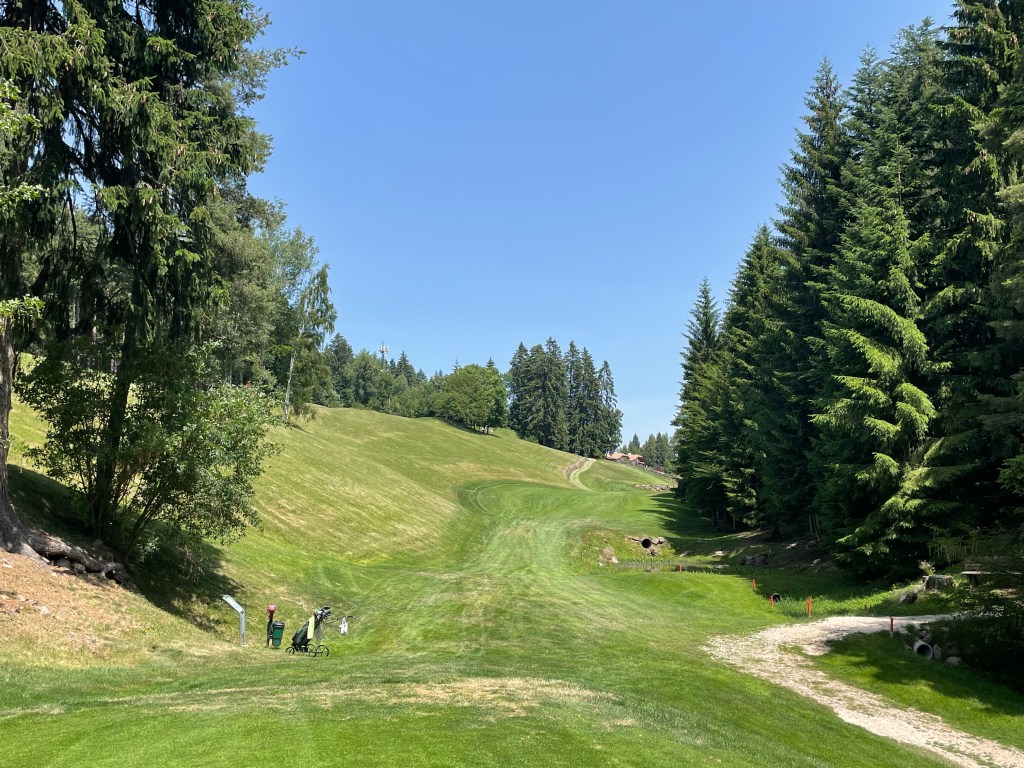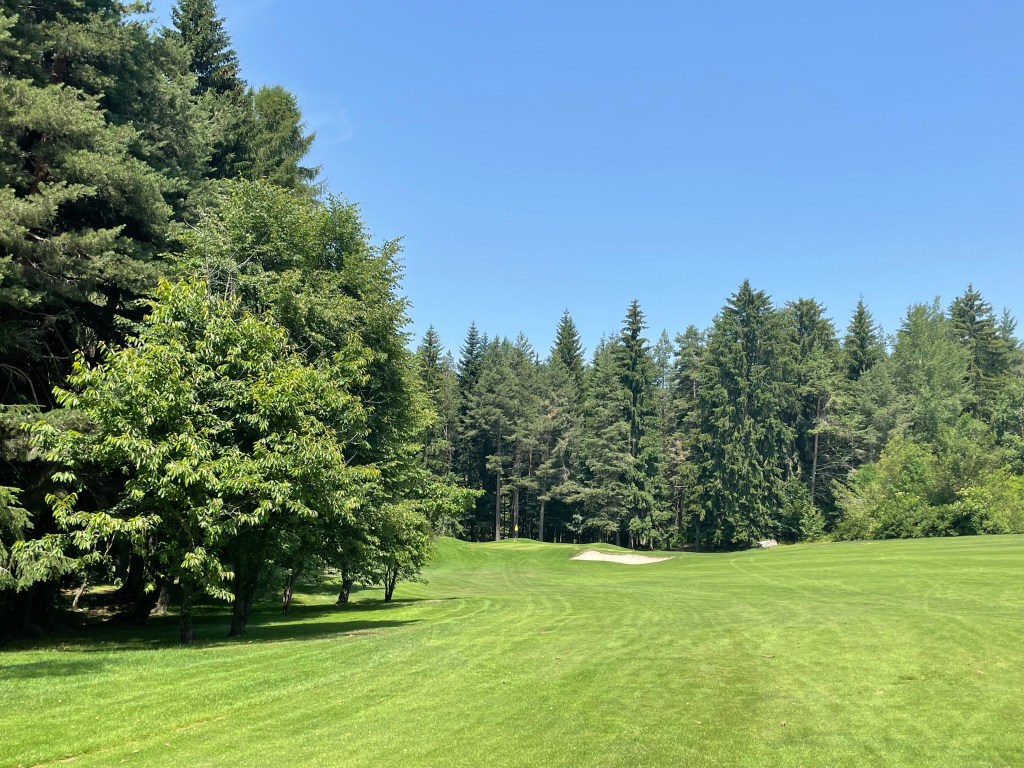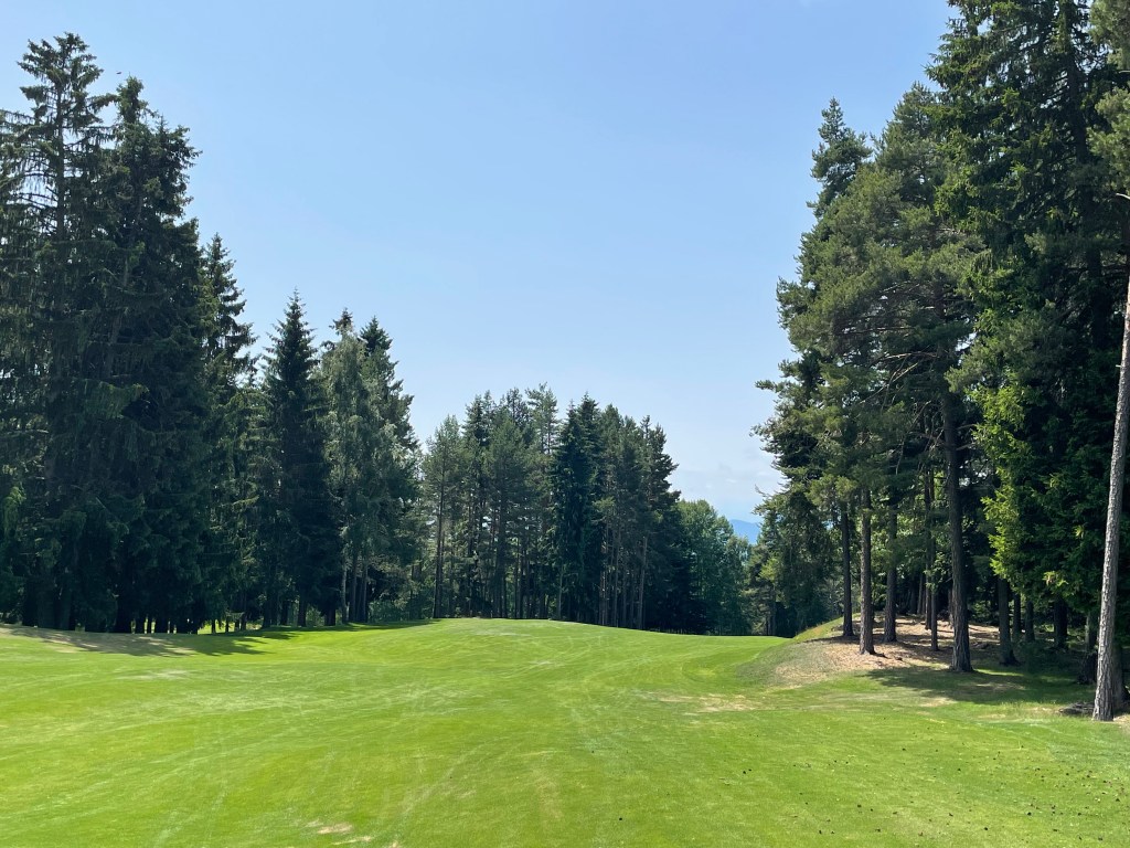 Schon auf der 1 habe ich das erste Dogleg des Platzes vor mir. Das soll heute auch meist so bleiben: Der Platzdesigner hatte wohl eine Vorliebe für die geknickten Bahnen, oder aber das Gelände erforderte es so. Den Teeshot sollte man also möglichst so platzieren, dass der Ball weiter in Richtung Grün gespielt werden kann. Die Herren überlegen jedes Mal gut, ob sie den Driver nehmen – ein Holz oder Eisen ist in den meisten Fällen hier besser. Die Herren, das sind Wolfgang aus dem deutschen Memmingen und Fernando aus Padua, der jetzt im Sommer gern in der kühleren Luft hier spielt. Nun reicht mein Italienisch zwar zum Bestellen in der Trattoria und für ein bisschen Smalltalk, heute kommen ein paar Golfvokabeln dazu.
