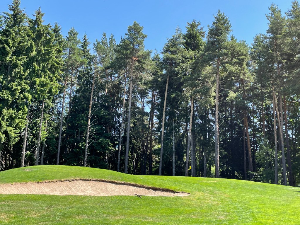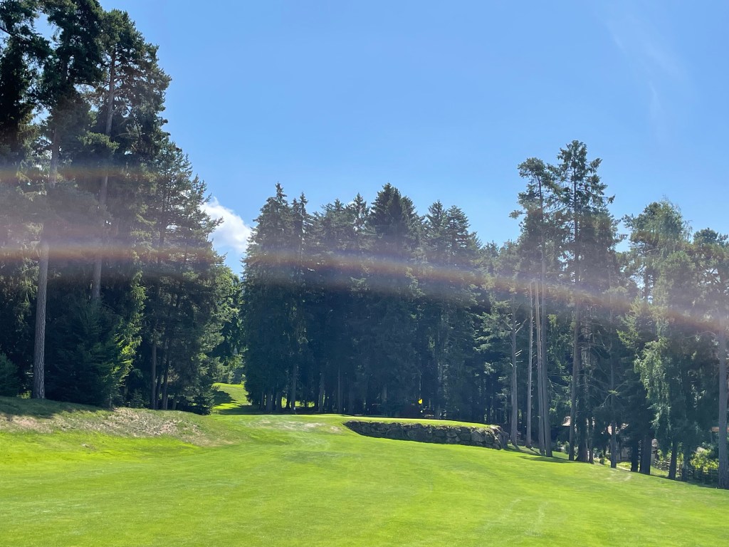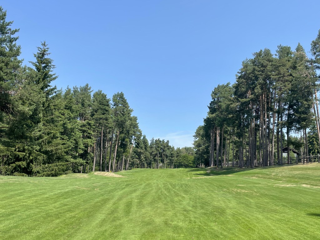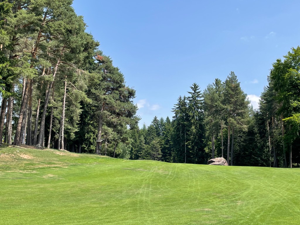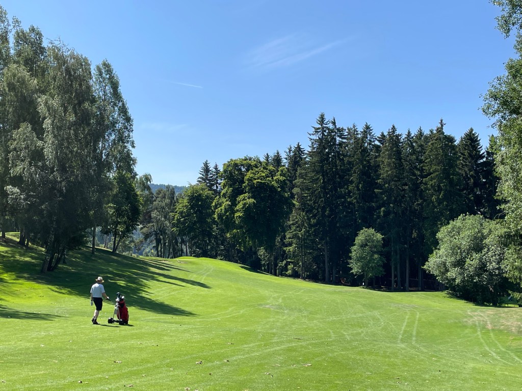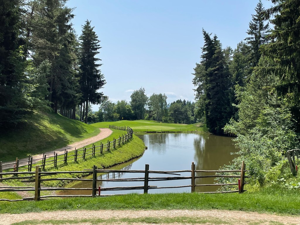 Auf der 16 (bergauf, jawoll!) rät mir Wolfgang, den zweiten Schlag „links am Marterl“ vorbei zu spielen. Das Grün ist nicht einsehbar. Macht aber nix, mein Ball findet irgendwie den Weg. Zumindest in dessen Nähe. Auf der 17 dann „endlich“ – Wasser! Sie besteht praktisch nur aus Abschlag, Teich, 70 cm Vorgrün und Grün – optisch eine Augenweide. Länge 136/130 Meter. Hinter dem Grün ist ausnahmsweise einmal kein Wald, ich bin also lieber länger als kürzer und greife zum Driver, was sich bei meinen Carrydistanzen als richtig erweist. Die 18 geht dann zuerst schräg runter, dafür zum Ende hin schräg aufwärts und hängt auch deutlich nach rechts. Wir geben noch einmal Gas, überlegen sehr genau, wohin wir den Ball spielen, was gut ist, denn hinter dem Grün – foresta.