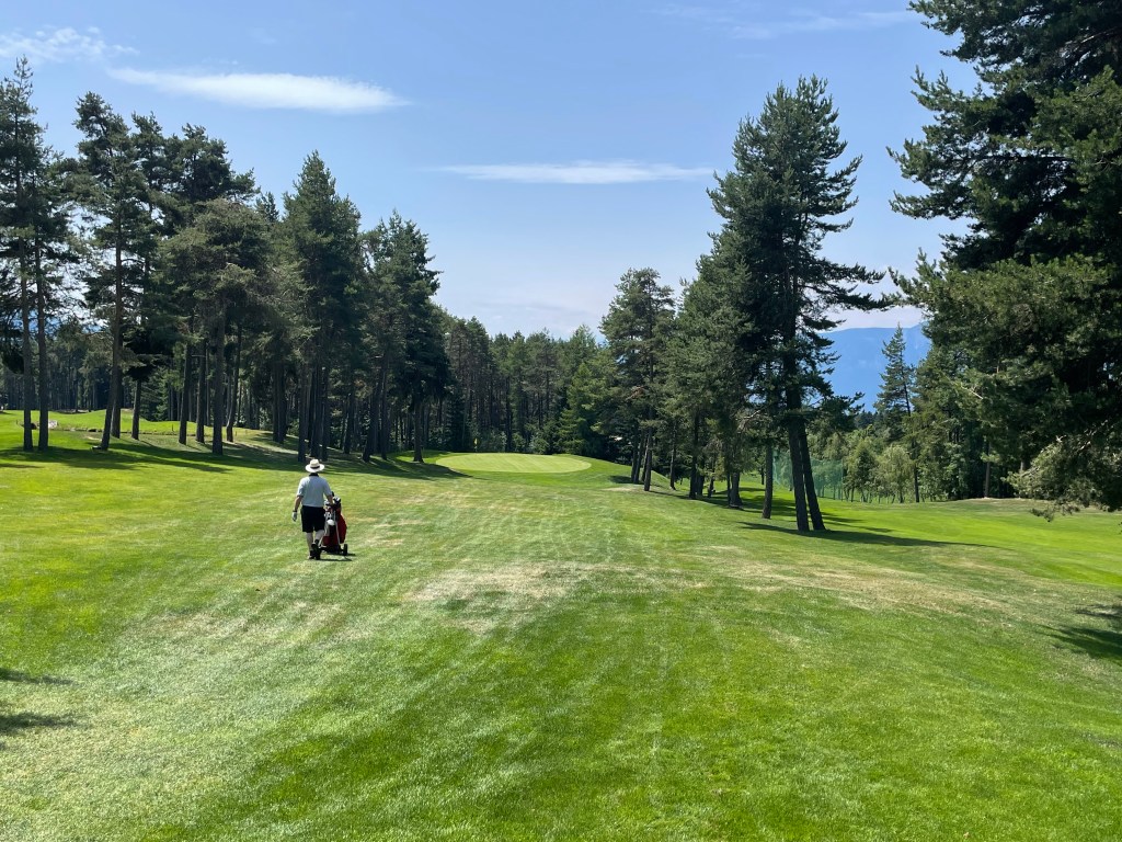 Aber erst einmal Konzentration auf das Spiel. Es geht auch hier abwechselnd bergauf und bergab, doch nicht so exzessiv wie in St. Vigil Seis. Meine beiden Flightpartner haben Platzkenntnis und raten mir, wo ich die Bahnen anspielen soll. „A destra“ rät mir Fernando auf der 2, weil der Ball ohnehin nach links hinunter rollt. Genau umgekehrt auf dem Par 5 der 3 – bergab, klar. Die Grüns sind nicht allzu schnell hier und auch nicht stark onduliert, haben aber eine ganz andere Schwierigkeit parat: Wer den Schlag zu lang lässt, dessen Ball („pallina“) landet unweigerlich im steil abfallenden Wald („foresta“, ich habe extra gefragt) dahinter und ist entweder verschwunden, oder aber sehr schwer aus den Nadeln und Steinen am Boden spielbar. Das gilt auch für die 5 (Dogleg, Überraschung!), wo ohnehin links und rechts kein Platz zum Anspielen ist. Auf dem Grün ist Fernando aber dann kulant und schenkt mir den letzten Putt: „Dato!“