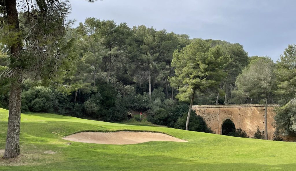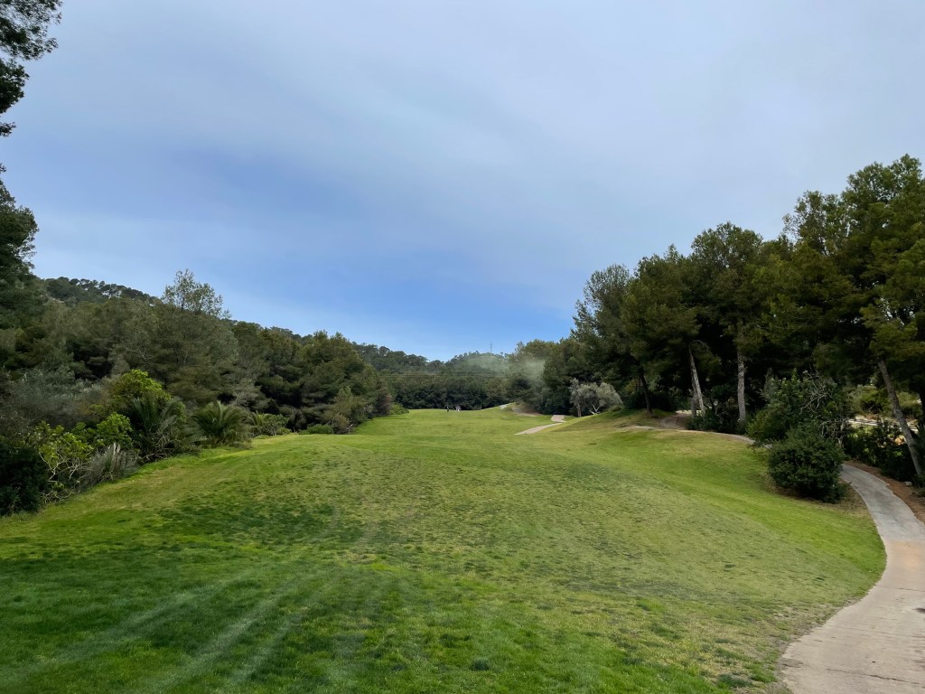 Vom Clubhaus aus hat man sofort einen höchst informativen Blick steil hinunter in einen Talboden, aus dem die 9 und die 18 hier herauf führen. Aber erst einmal bin ich auf der 1 und es geht gleich richtig anspruchsvoll los: mit einem steil abfallenden, wunderschönen Par 4, das bergauf auf einem erhöhten kleinen Grün endet. Die nächsten Bahnen winden sich auf oder ab, sind manchmal Doglegs, verlaufen aber immer relativ eng zwischen den Pinien. Wasser bleibt einem erspart, sieht man von den meisten Par 3 ab. Länge ist hier nicht unbedingt entscheidend, sondern Präzision ist gefragt auf dem Par-69-Platz. Ab und zu gibt es blinde Schläge, aber gerade nur so viele, dass man nicht den Spaß verliert. Präzision braucht es hier immer und überall, auch auf den Grüns, die zwar nicht so schnell sind wie in T Golf oder Santa Ponsa I, dafür aber klein.