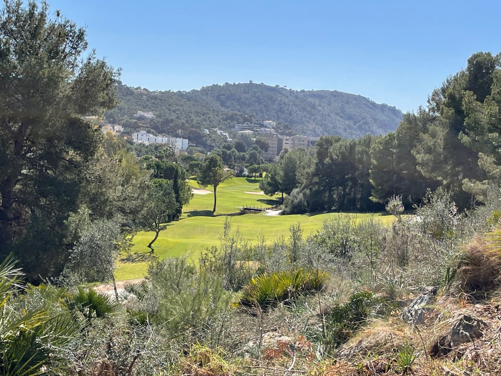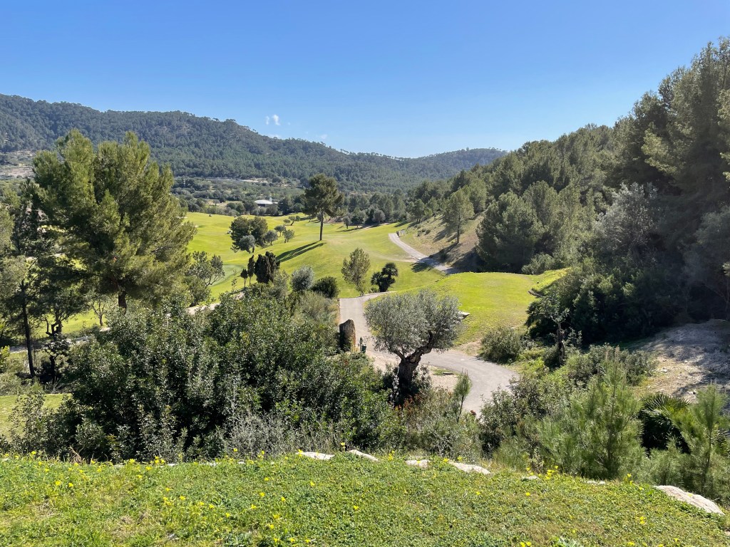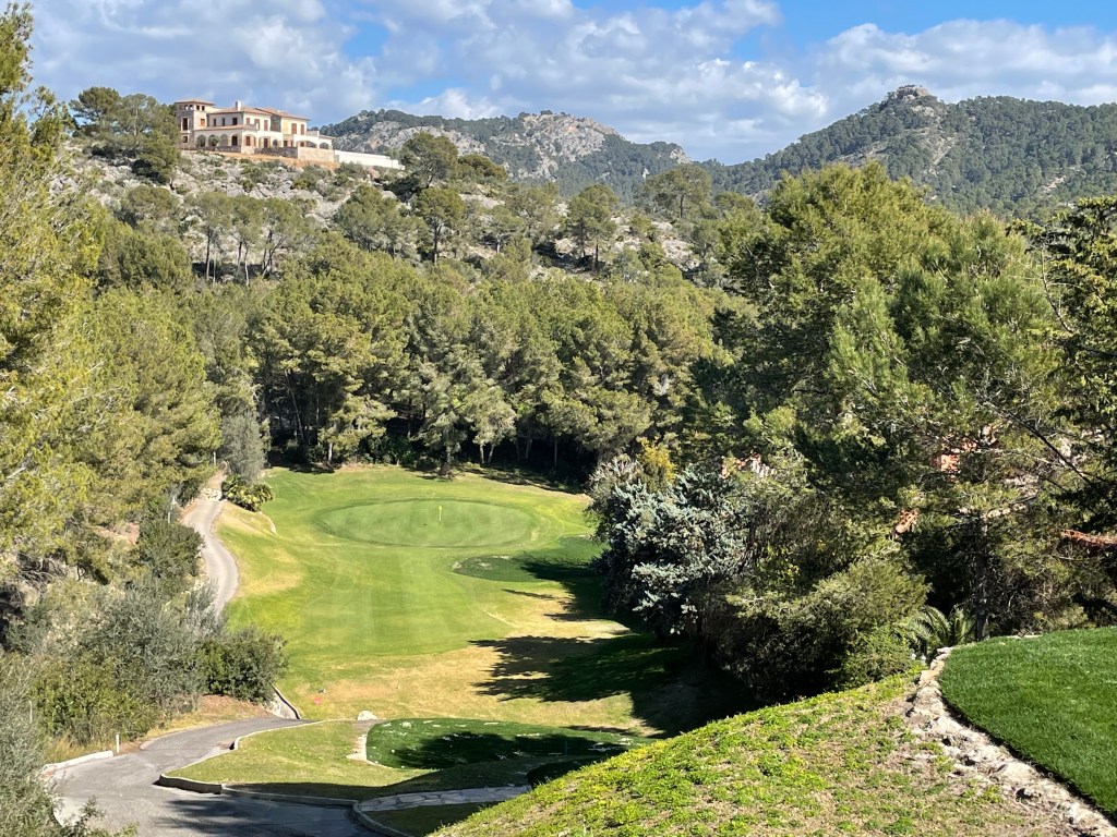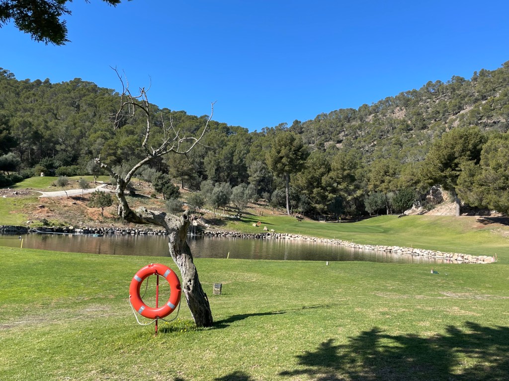 Die Begeisterung für Andratx kommt nicht von Anfang an. Die ersten Bahnen am neugebauten Hotel direkt neben der 2 vorbei (Wer will eigentlich seinen Urlaub hinter Netzen verbringen?), längere Wege zwischen endlosen Reihen an Bungalows hindurch. Ich bin froh, mit Cart unterwegs zu sein. Aber dann. Das Par 3 der 4, tief unter dir ein Teich und so mancher Ball im Flight landet aus Gründen des vorsichtigen Spiels rechts – im Wald. Dann die beiden Par 5 hintereinander. Die 5 ein Dogleg bergab und bergauf mit deutlicher Schieflage. Die 6, das „Green Monster“, das schwerste Loch am Platz mit 532/454 Metern Länge noch dazu.