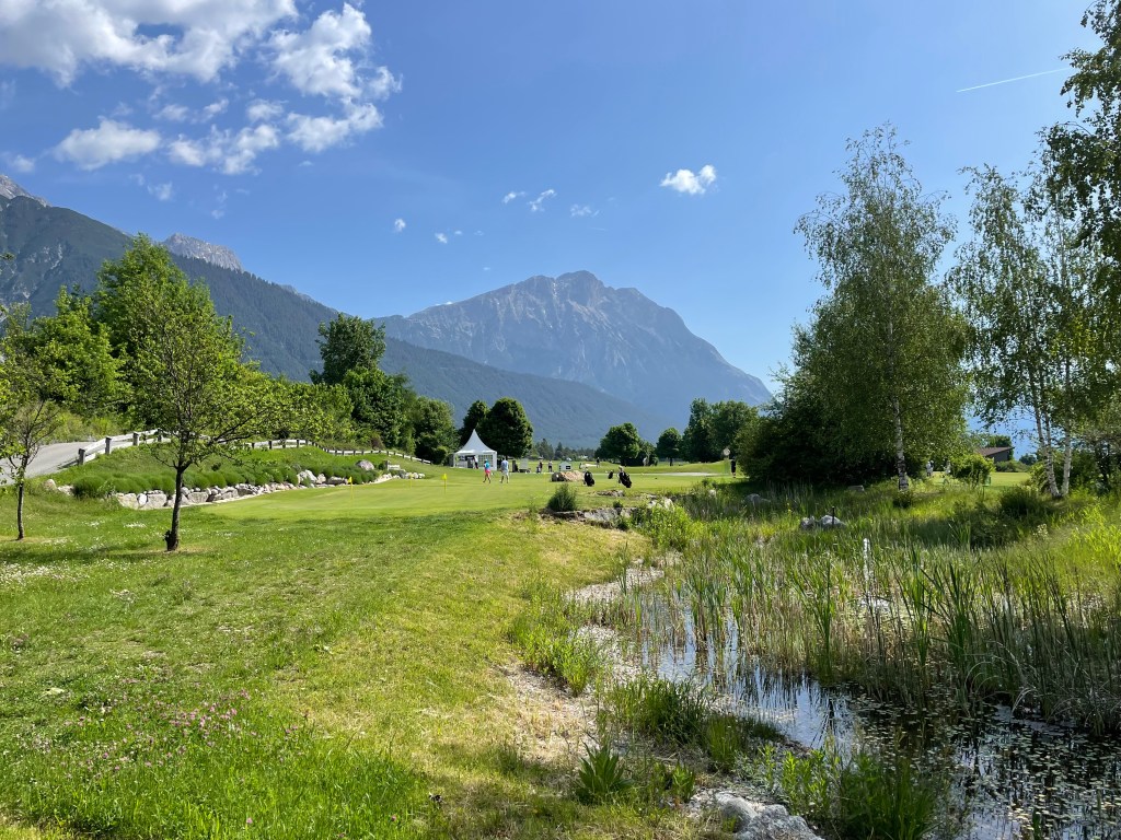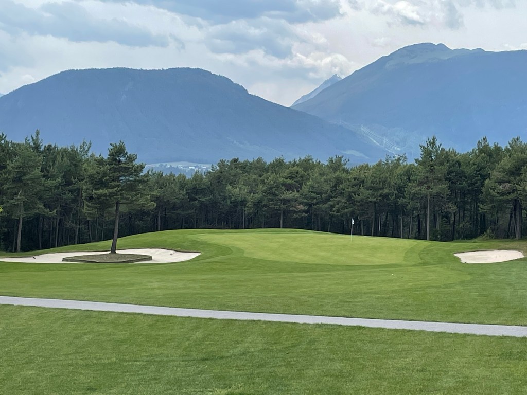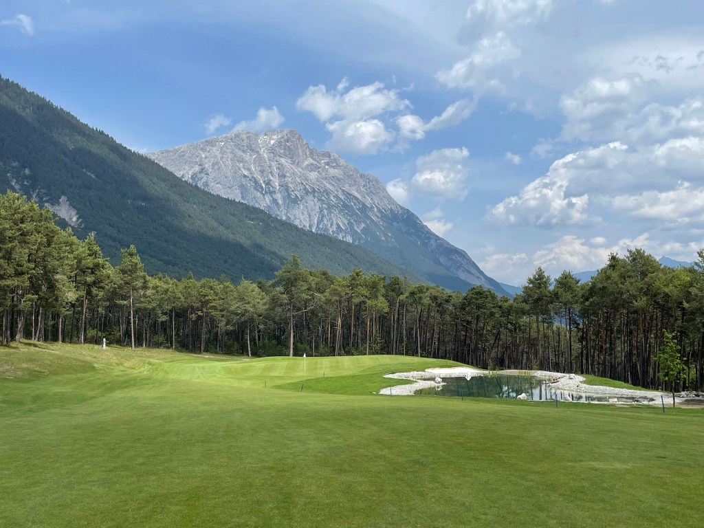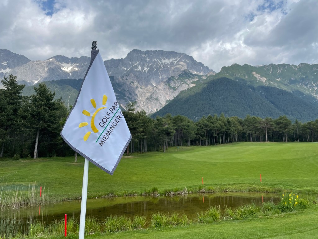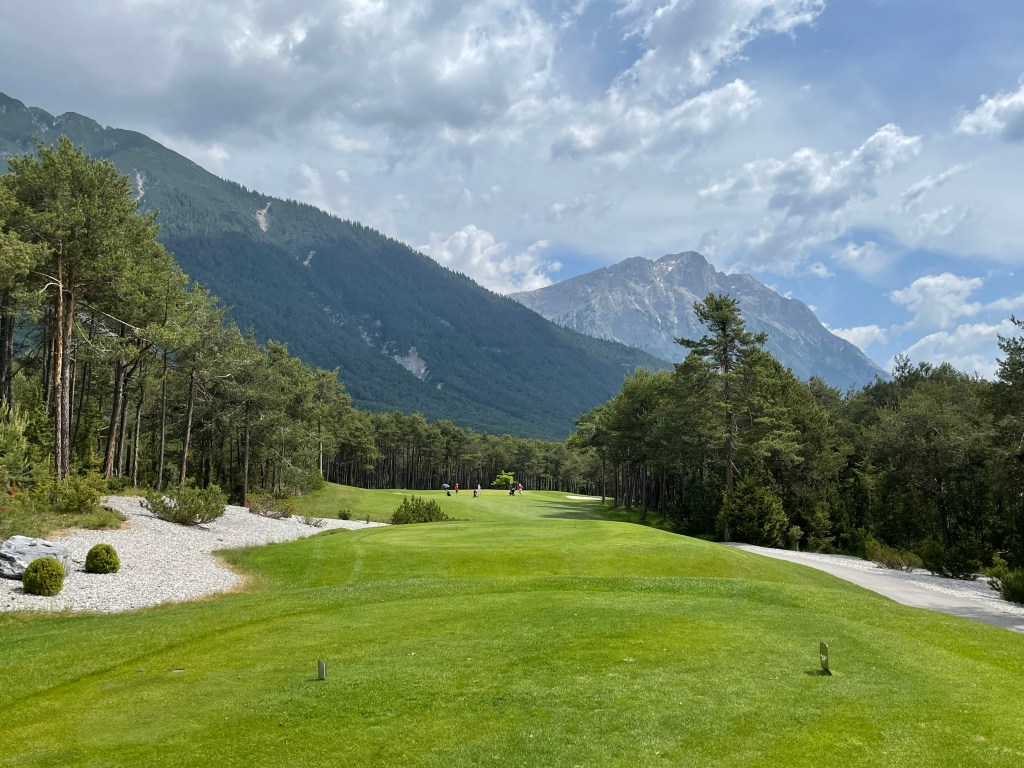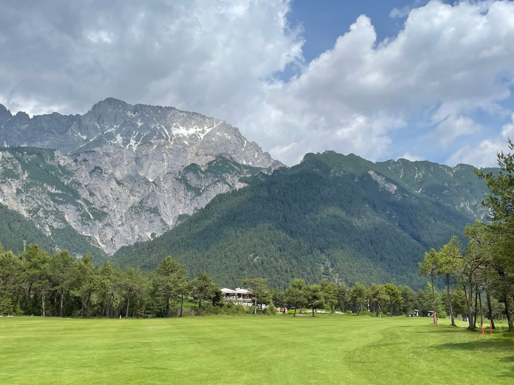 Es ist angenehm warm und sonnig mit attraktiven weißen Wolken an diesem Mai-Sonntag in Tirol. Mieming ist gut gebucht, vor allem Schweizer:innen haben es über die Grenze hierher nicht weit und bevölkern Hotels und Platz. Ich habe erfreulicherweise ortskundige Mitglieder im Flight, ein sportliches Tiroler Pärchen. Sie erklärt mir freundlicherweise gleich an Tee 1 die wichtigste Grundregel für den Platz: „Jede Bahn fällt zum Inn hin ab. Also immer deutlich auf die höhergelegene Seite spielen, sonst liegst im Wald!“ Der Inn ist scheinbar weit weg von hier, unten, im schmalen Tal. Nur ein paar Kilometer geht es von Telfs hinauf auf das sonnige Plateau. Die Lage hat Vorteile: Der Platz mitten in den Bergen öffnet fast immer schon Mitte März und bleibt bis weit in den Herbst hinein bespielbar.