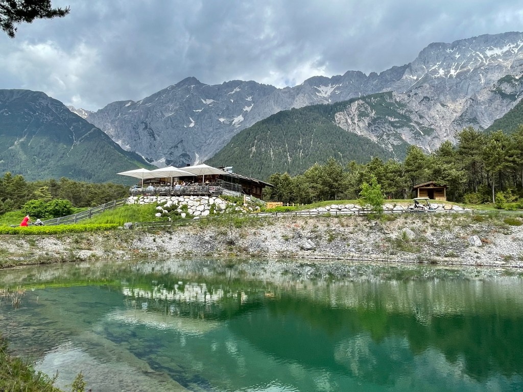 Auf der 9 bergauf kommt dann endlich SIE ins Blickfeld: die Stöttlalm, das berühmte Halfwayhaus des Platzes. Sagst du „Mieming“ und „Golf“, kommt sofort: „Jaaa, und die herrliche Alm dort!“ Leichter Wermutstropfen heute: an den Wochenenden kann man neuerdings dort keine Pause mehr einlegen. Samstags und sonntags dient die stylische Alm mit Bergsee und Panoramablick als begehrte Hochzeitslocation. Besser wochentags hier spielen also, oder von Mieming aus eine kleine halbe Stunde hinaufwandern, wie ich es mit meinem (nichtgolfenden) Ehemann am nächsten Tag gemacht habe.