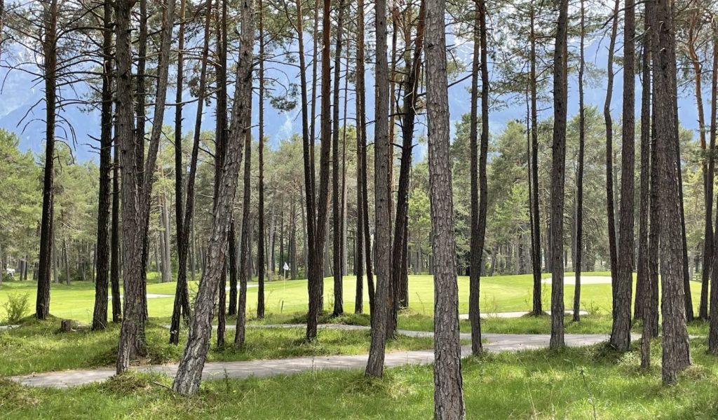 Cart braucht man in Mieming wirklich keines, die Steigungen sind moderat, die Wege wunderschön im Wald gelegen und schattig. Das ist gut so: Eine Runde am Championkurs Mieming geht über etwa 11 Kilometer. Auf dem etwas längeren Weg zurück zum modernen Clubhaus, das hier „Greenvieh“ heißt, kann man noch einmal ausgiebig die großartigen Schläge der Runde besprechen – oder die vorbeigeschobenen Putts.