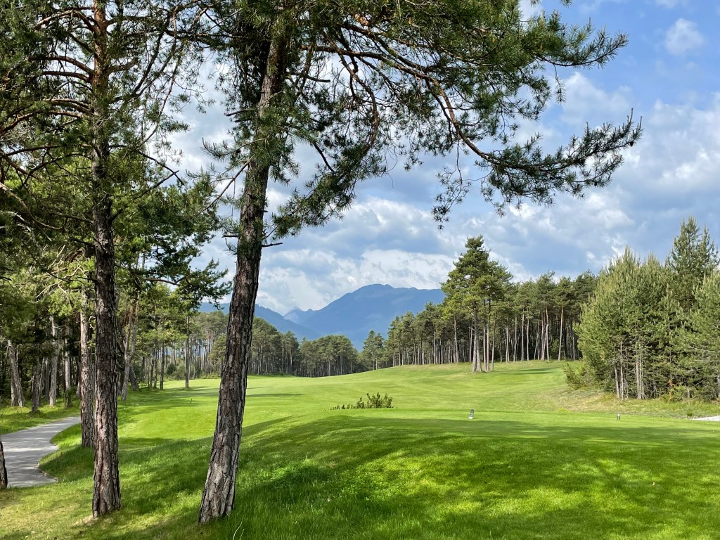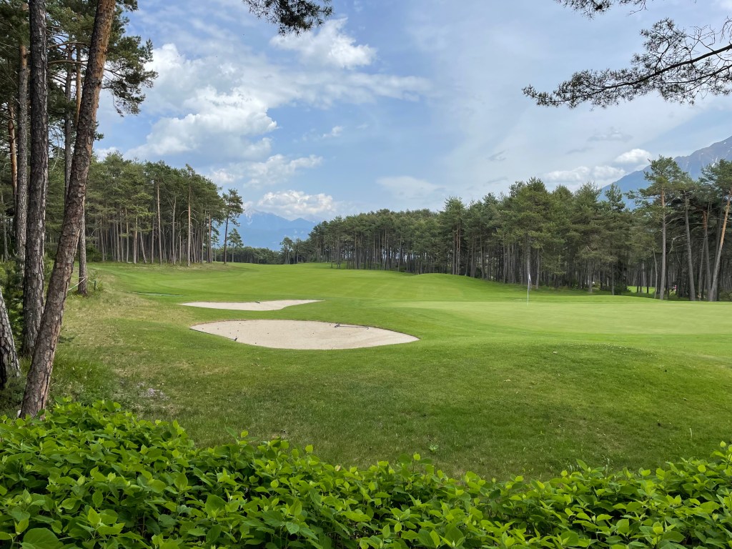 Folgsam schlage ich auf der 1 also meinen Drive extrem auf die linke Seite und der Ball rollt tatsächlich bis über Mitte Fairway hinunter. Wir spielen direkt auf einen ansehnlichen Berggipfel zu, die Hohe Munde. Das soll auch nahezu jede zweite Bahn so bleiben. Der Mieminger Championkurs schlängelt sich terrassenförmig nach oben. Die Bahnen sind sehr lang (6.100 Meter von Gelb, 5.400 von Rot), eigentlich allesamt sehr breit, aber rechts und links von Föhrenwald eingefasst. Die Herausforderung liegt also in der Länge des Platzes, dem immerwährenden Hang zum Inn und darin, dass ein verirrter Ball im dichten, hellgrünen Gras zwischen den Bäumen schwer zu finden ist.