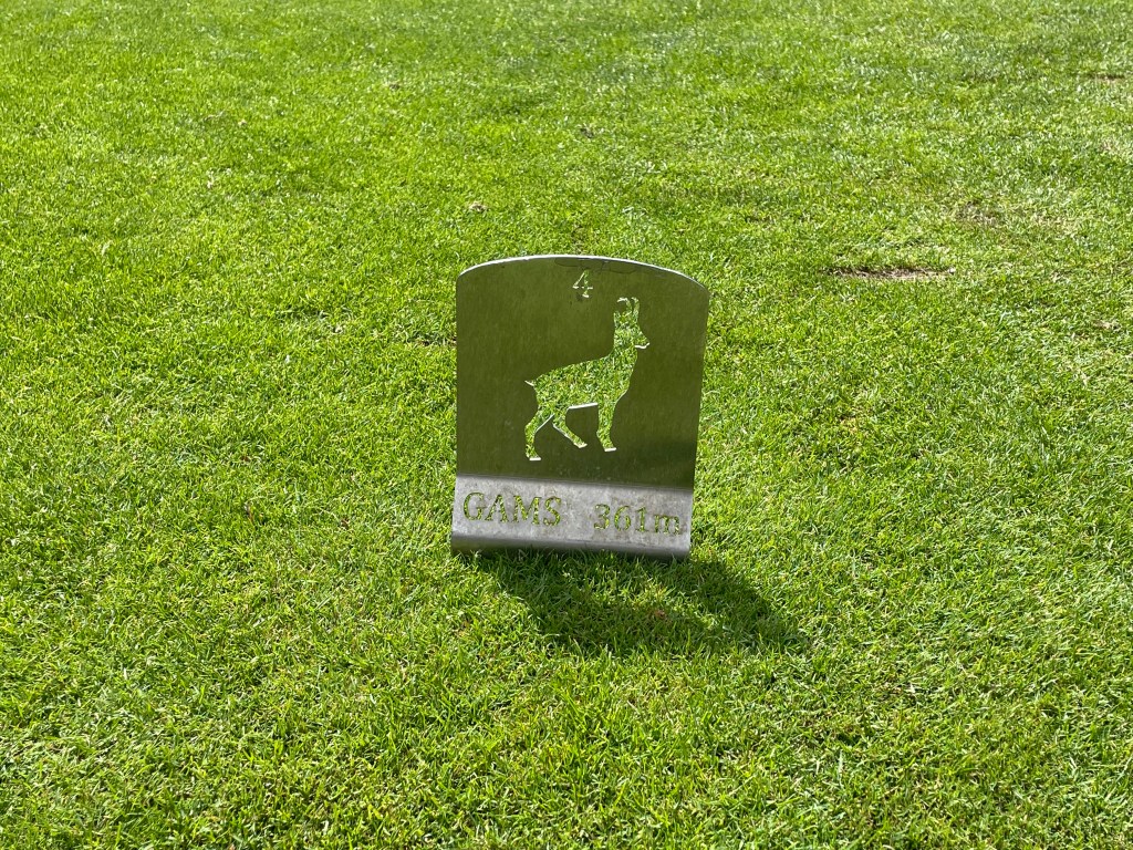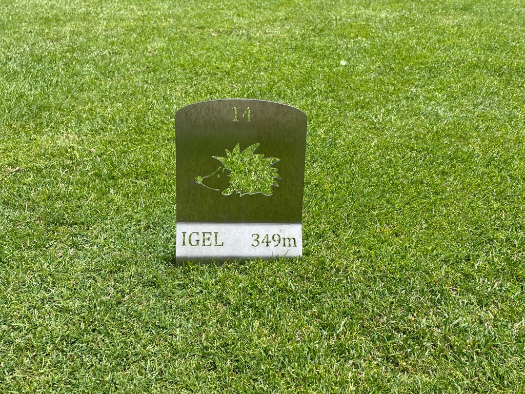 Mieming hat außer dem Championkurs übrigens auch noch einen kurzen 9-Loch-Platz, den ich aber nicht gespielt habe. Daneben die Range und sehr schön angelegte, großzügige Übungsanlagen. Neben dem Puttinggreen ein Biotop. Überhaupt hat man das Gefühl, es wird hier immer ein bissl mehr gemacht, als auch für einen Top-Platz notwendig wäre. Die Bepflanzungen abseits der Bahnen, die Gesteinswelten aus Tiroler Bergen und Tälern an jedem Abschlag. Oder die Abschlagtafeln: Nicht Weiß, Gelb, Blau oder Rot sind die hier sondern Adler, Gams, Fuchs und Igel.