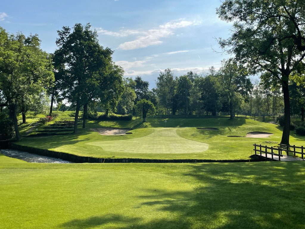 Nach Recherche im Internet hatte ich mich für den Allianz Course by Trent Jones Sr. entschieden, der 1971 gebaut wurde, und ich sag’s gleich: Das war richtig so. Wie vermutet: klassisches Design mit vielen Bunkern unter wunderschönem alten Baumbestand und teppichartig getrimmte Fairways. Hier wurden auch schon die Italian Open der European Tour gespielt, aber ich hatte Hoffnung, den Platz auch zu schaffen, ist doch Robert Trent Jones Leitsatz: „Jedes Golfloch sollte ein schwieriges PAR aber ein einfaches Bogey sein.“ Es sollte sich aber herausstellen, dass der Kurs für mich sehr schwer zu spielen war. Die langen, aber relativ schmalen Bahnen, oft als Doglegs geführt und unterbrochen von kleinen Bächen und einem wunderschönen breiten Gebirgsbach, sind tricky und ohne gute Strategie (und Schläge) verheddert man sich leicht. Breite Fairways enden oft schmal, die Grüns hängen stark und sind sehr schnell. Und trotzdem pure Spielfreude, denn: Was für ein Parklandkurs! Das Licht-Schatten-Spiel der alten Bäume, immer wieder Ausblicke zu den Bergen, völlige Ruhe, nur wenige Spielende auf dem Platz, das Rauschen des gezähmten Wildbachs – und zwischendurch das sanfte Kratzen meines Rechens im Sand.