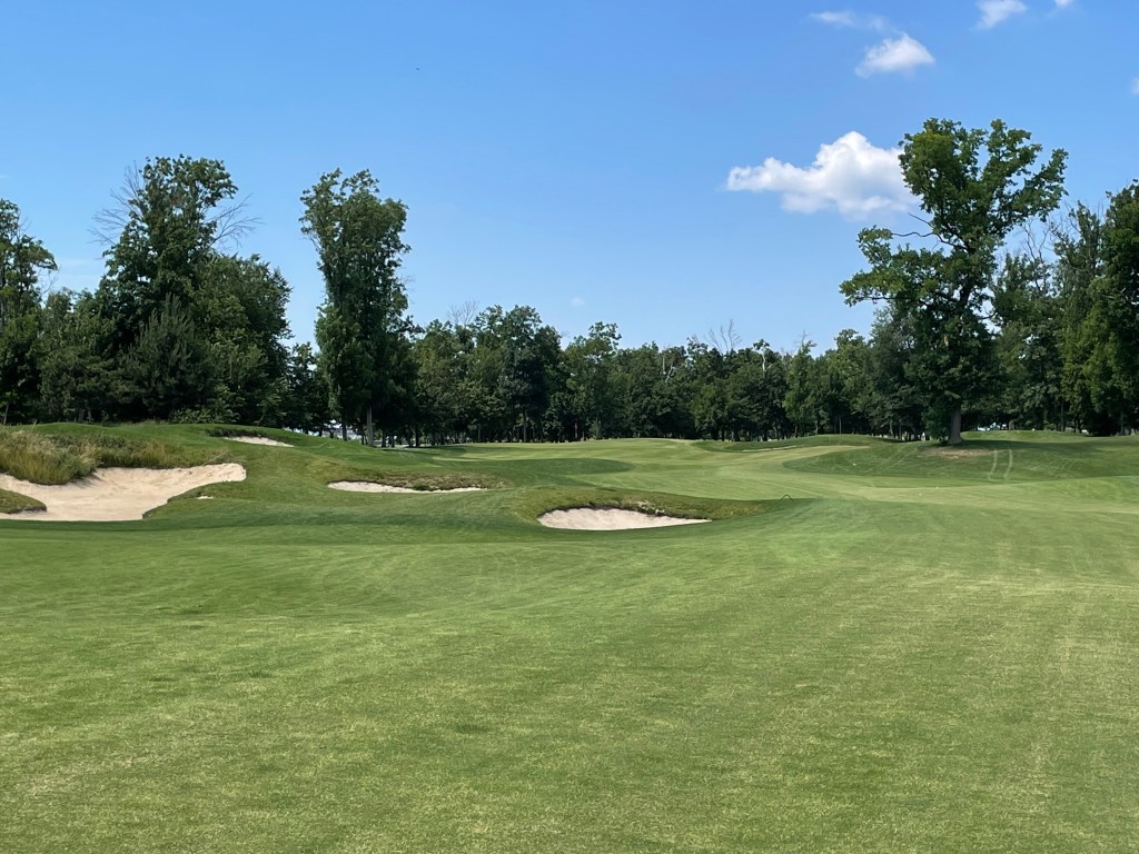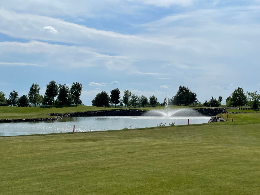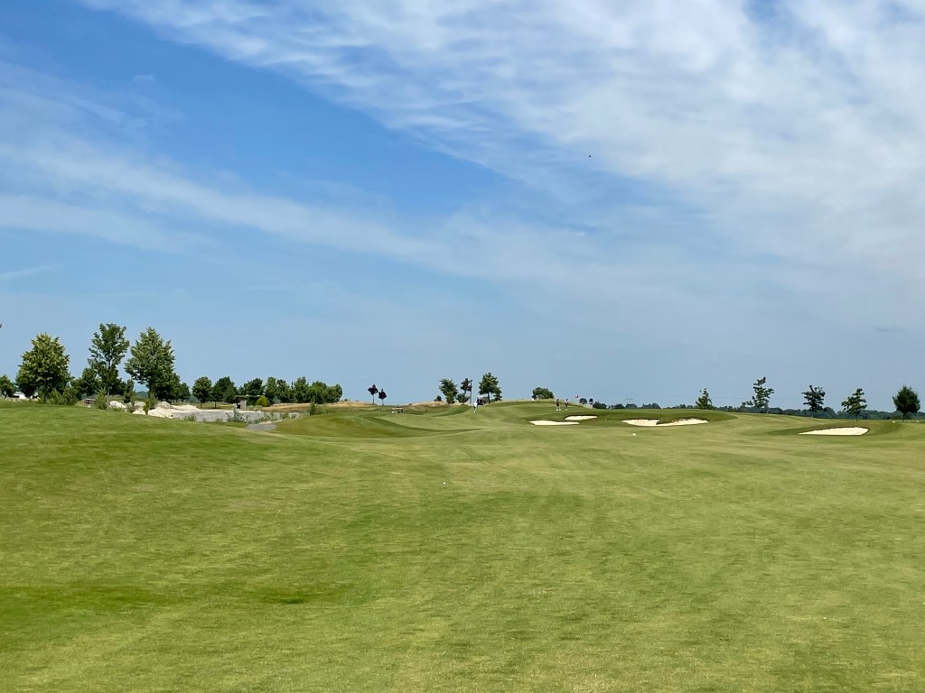 Ein wenig erinnert mich das Design des Platzes an Fontana. Die Breite der Fairways mit stets gut einsehbaren Landezonen, die Pflege, die Bunkerlandschaften, die türkisen Teiche mit Häusern drumherum, das freie Gelände mit wenigen Bahnen im Wäldchen. Eine der schönsten ist für mich die 10. Das Par 4 verläuft am Wasser entlang, hängt dadurch leicht, ist wellig, aber nicht allzu lang. 3x Par im Flight, heißa! Bunkerumkränzt dann nach dem Waldstück die 12, kein Lüftchen regt sich, Gewitter liegt in der Luft. Heiß geht es auch auf der 13 her, einem sehr schönen Dogleg mit Bunkern im Knie und Wasser vor dem Grün. Großartig und wohl das Signature Hole des Platzes: das Par 3 der 16 übers Wasser (Titelfoto), für Herren 120 Meter lang, für Damen nur 70. Wie es das Schicksal will, weht ausgerechnet hier der Wind, was uns aber nicht von erfolgreichen Grüntreffern abhält. Ein Par 5 gibt es dann zum Abschluss auch noch auf der 18, die mich so fordert, dass ich fast zu fotografieren vergesse, was sich dafür endlich positiv im Score auswirkt.