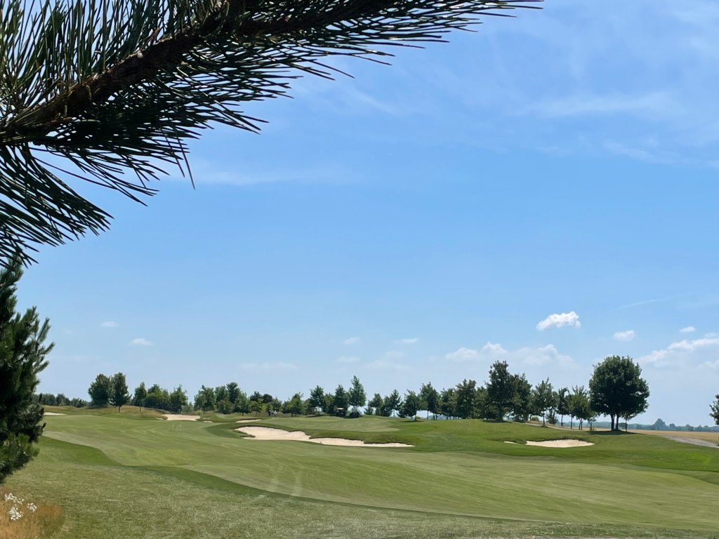Wir haben einen sehr heißen Junitag erwischt und nicht einmal ein Lüftchen regt sich. Ich packe mehrere Wasserflaschen ins Cart, das man auf dem ebenen Gelände keinesfalls braucht, uns aber heute gute Dienste tut. Der erst 2014 angelegte Championshipplatz bietet auf den meisten Löchern relativ wenig Schatten. Abgesehen von einigen Bahnen in der Mitte, die im Auwald liegen, sind die Bäume noch jung.