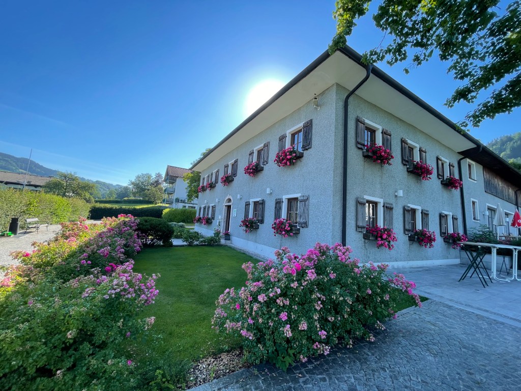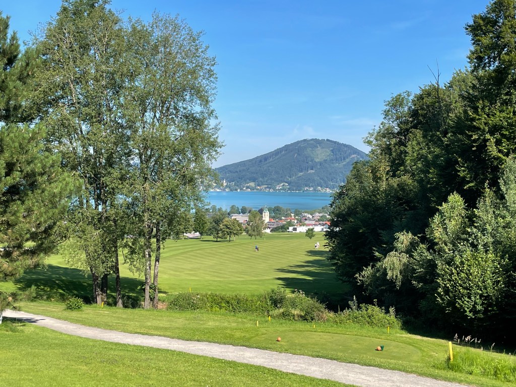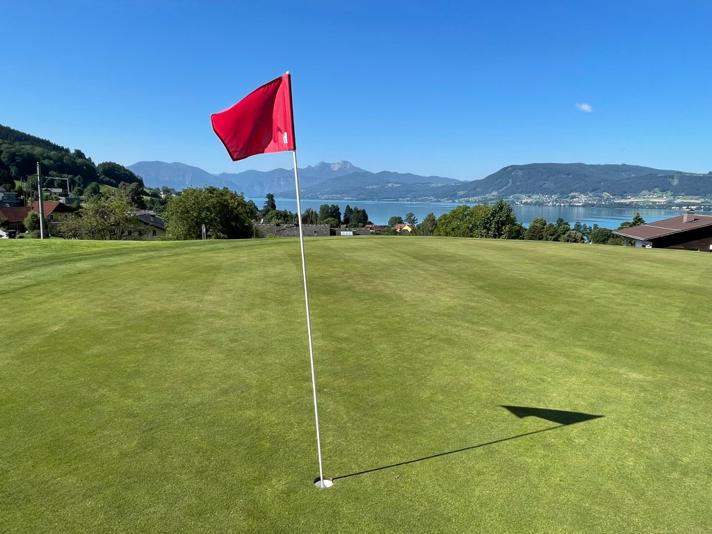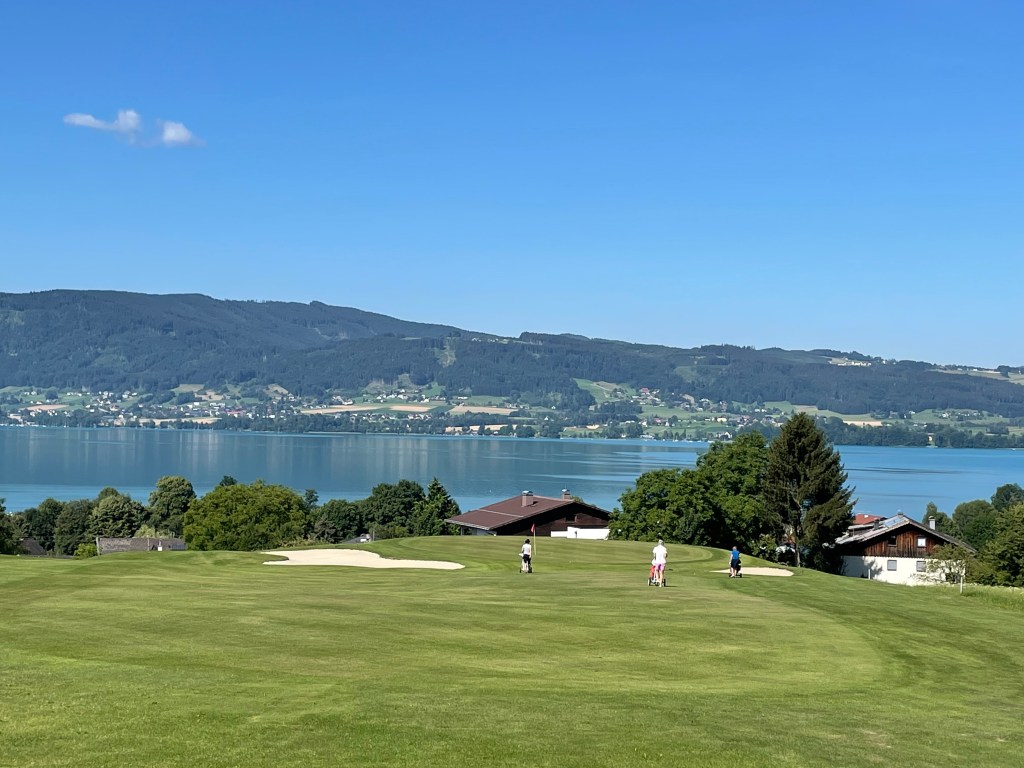 Juli am Attersee, da denkt man an Baden, Schifferl fahren, Segeln und nur am Rande an Golf. Mich trieb an diesem Sonntagmorgen die Neugier ans Ostufer, genauer nach Weyregg. Vom dortigen Golfplatz hatte ich schon viel (Unterschiedliches) gehört und wollte mir nun selbst ein Bild machen. Erster Eindruck: das entzückende Clubhaus mit wunderschönem Blumenschmuck, das Restaurant jetzt vor 9 Uhr verständlicherweise noch geschlossen. Durch die Siedlung geht es zum 1. Abschlag – nicht ganz einfach zu finden. Das Ah und Oh angesichts der schönen Seeblicke geht gleich an Tee 1 los. Das Par 5 startet bergab durch eine Schneise Richtung See, verläuft angenehm breit und endet auf einem Grün praktisch neben dem Kirchturm von Weyregg. Tatsächlich läuten gerade die Kirchenglocken zur Sonntagsmesse, als ich putte, was das Ganze sehr feierlich macht.