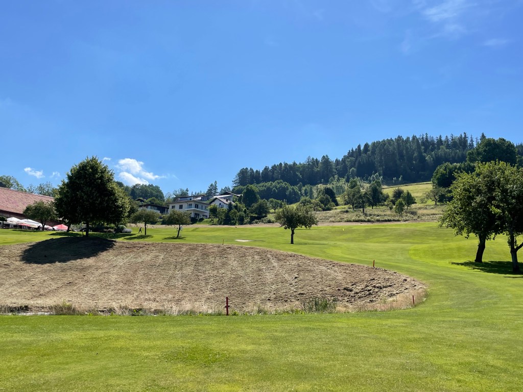 Dann die 2 bergab, ein Par 3 mit kreisrundem Grün vor einem Hausdach, nicht sehr viel Platz drumrum. Auch dieses Grün schaut optisch toll aus, ist aber ziemlich langsam. (Ok, ich habe gestern Altentann gespielt, der Vergleich mit den Championship-Grüns dort muss schlechter ausfallen.) Auch die 3 ist ein Par 3, steil bergauf diesmal und das Grün nicht einzusehen. Nach der 4, einem relativ unspektakulären Par 5, das breit bergauf führt, führt der Weg dann zurück Richtung Clubhaus. Das Par 3 der 5 liegt etwas oberhalb. Der Blick auf den See: toll! – der Blick auf das Grün: leicht beängstigend. Wenn man das nämlich nicht genau trifft, liegt der Ball entweder links oben auf der Böschung oder rechts unten im Gestrüpp. Ich habe Glück, schaffe ein Bogey und stapfe zufrieden bergan zum Abschlag der 6 mitten in einer Einfamilienhaussiedlung. Vor mir liegt erst mal links eine steil nach rechts abfallende gemähte Wiese, sehr weit weg ein Streifen Fairway, ehe sich die Bahn steil nach links hinauf dreht zum uneinsehbaren Grün. So eine Art Abenteuergolf, vor allem wenn man das erste Mal hier spielt und keine Platzkenntnis hat. Das Grün ist komplett nass und träge, liegt erstmals aber so richtig idyllisch im Wald. Mein Score hier: frag‘ nicht.