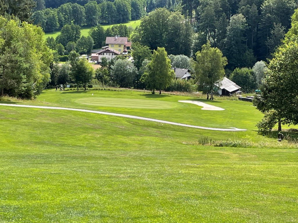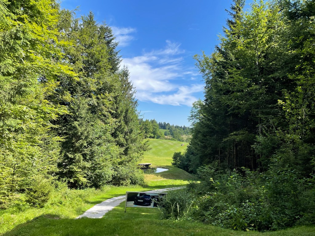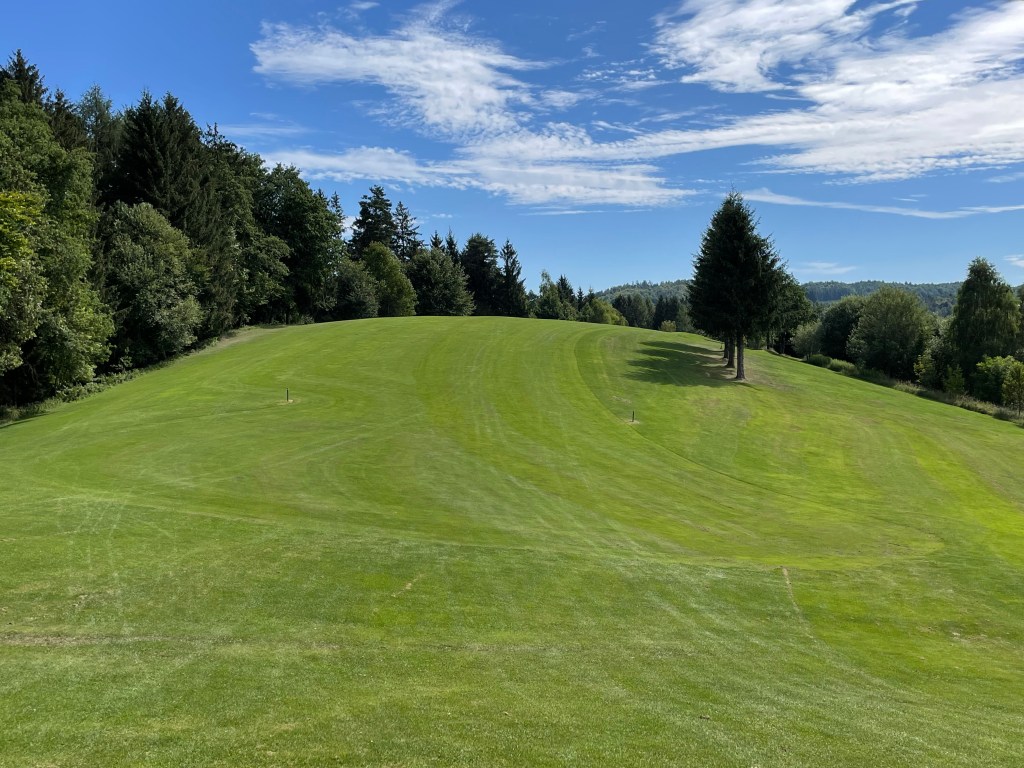 Die 4 ein Dogleg bergab und zweimal Wasser vor dem Grün, die 5 mit extremer Schieflage nach links und das schwierigste Loch am Platz. Das Par 3 der 6 schließlich extrem schmal, aber kurz und ich schaffe glücklich ein Par. Ganz wunderschön die 7, samtig grün, hohe Fichten am Rand, das Grün in einer Waldlichtung. Den Abschlag der 8 finde ich dann nicht gleich und parke sicherheitshalber das Cart am Weg, was gut ist. Von links oben zischen die drei Bälle meines Vorderflights an mir vorbei auf das Fairway. Dort hinauf muss ich dann auch, über einen idyllischen Waldweg zu einem weniger idyllischen Abschlag durch eine schmale Schneise. Das Grün vermute ich (weil Blindschlag) etwas zu weit rechts und rette mit einem hohen Schlag von sehr tief unten sehr hoch hinauf gerade noch den Score. Klingt frustiert? Nicht wirklich. Denn trotz aller Mühen ist der Platz gut zu spielen und nicht allzu lang. So hat man Schläge zum Korrigieren übrig.