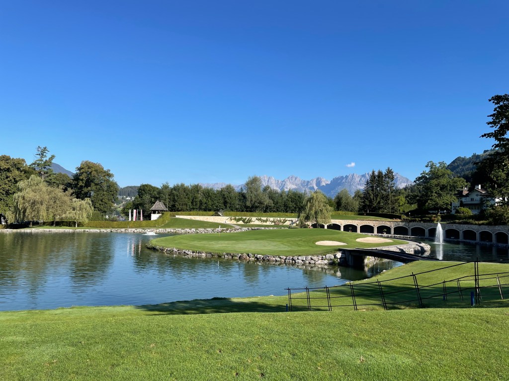 Ich hatte vor ein paar Jahren schon einmal hier gespielt, als sich der Platz noch Kitzbühel-Kaps nannte. Damals allerdings bei Regen und ohne einen einzigen sichtbaren Berg rundum. Umso erfreulicher der Anblick vom Wilden Kaiser, der auf der 8 vor mir steht. Ich weiß natürlich, was jetzt kommt, von der letzten Runde und auch, weil ich im Hotel wohne und aus dem Zimmer gut das Ende der Bahn beobachten kann. Das leicht gebogene Par 5 mit einigen Bunkern endet auf einem stark ondulierten Inselgrün: in der „Arena“ aus Hotelterrasse rechts und Clubhausterrasse links. Fast jeder 2. Ball landet im Wasser davor, wird unsere Statistik über drei Übernachtungstage später aussagen. Meiner heute nicht. Ich treffe den Bunker, immerhin und beende die Bahn mit einem würdigen Bogey. Es bleibt spannend: Nur 124/97 Meter geht es auf der 9 gleich auf das nächste Halbinselgrün knapp vor dem Clubhaus.