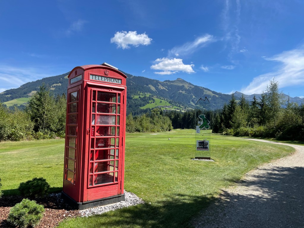 Ohne die erwartete und sehr bekannte Telefonzelle am Ende der 17 kommt natürlich keine Platzbeschreibung von Westendorf aus. Früher konnte man hier Getränke bestellen – jetzt ist sie nur mehr Deko. Die 18 beschert uns einen würdigen Abschluss, sehr schwierig zu spielen auch, Dogleg, Länge, Wasser, Grün mit Bunkern daneben und dahinter, was soll ich sagen.