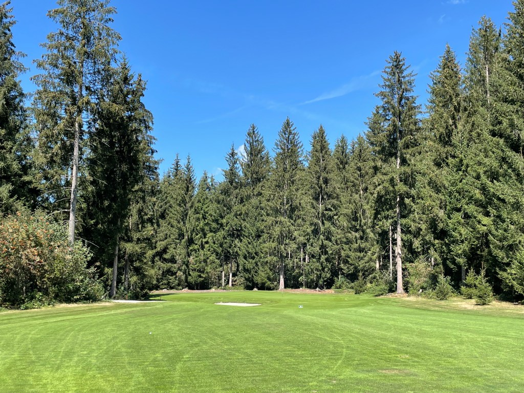 Was für eine Bahn, die 11! 478/419 Meter lang ist das Par 5, das breit beginnt und immer schmäler wird. Nur scheinbar einfach die 12, vom Gasthaus hinter dem Grün weht Blasmusik zu uns herüber. Mehr Tiroler Lokalcolorit geht nicht! Wunderschön und schmäler werdend leicht bergab verläuft die 13, die wieder im Wald endet, ehe wir auf dem Weg zur 14 bunte Hinweisschilder zum „Verkauf von Edelbränden“ passieren. Ach, wären wir nur abgebogen! Die 14 erweist sich als störrisch, das Par 4 ist ein Dogleg nach rechts mit dortigem Feld-Out, mündet in eine enge Waldschneise mit einem der schmalsten Grüns dahinter, das ich je gesehen habe. Score… frage nicht.