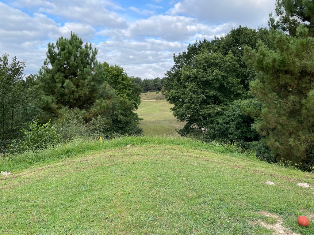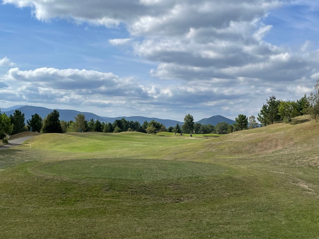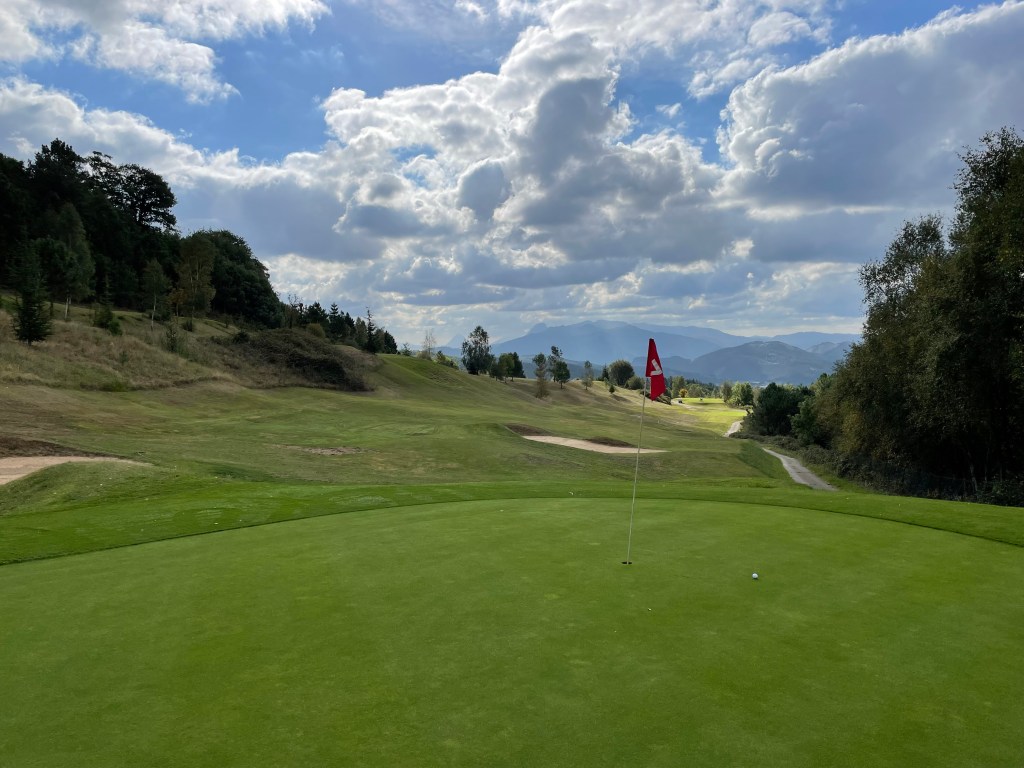 Nach der anstrengenden 11 bergab, das kurze Par 3 der 12 mit Hcp 1 zur Erholung, und man genießt den Blick ins Land. Großartig die 14, die breit beginnt, wunderschöne Wellen hat und am Ende eine kreativ designte Bunkerlandschaft, der ich wie durch ein Wunder ausweichen kann. Überhaupt: Ich habe ein höheres Hcp, spielt aber hier keine Rolle. Die Bahnen sind – auch durch das starke Gefälle – nicht allzu lang, die Bälle rollen weit und wenn man sich vor dem Schlag genau überlegt, wo der Ball hinsoll (und der Schlag gelingt), kommt man gut durch. Streuen wäre viel schlimmer. Etwa auf dem Dogleg der 17, wo im Knie rechts Ungemach in Form von Grasgruben droht und links das Aus. Oder auf der 18, die erst bergab, dann bergauf durch eine Waldschneise führt, ehe sie auf dem erhöhten Grün endet.