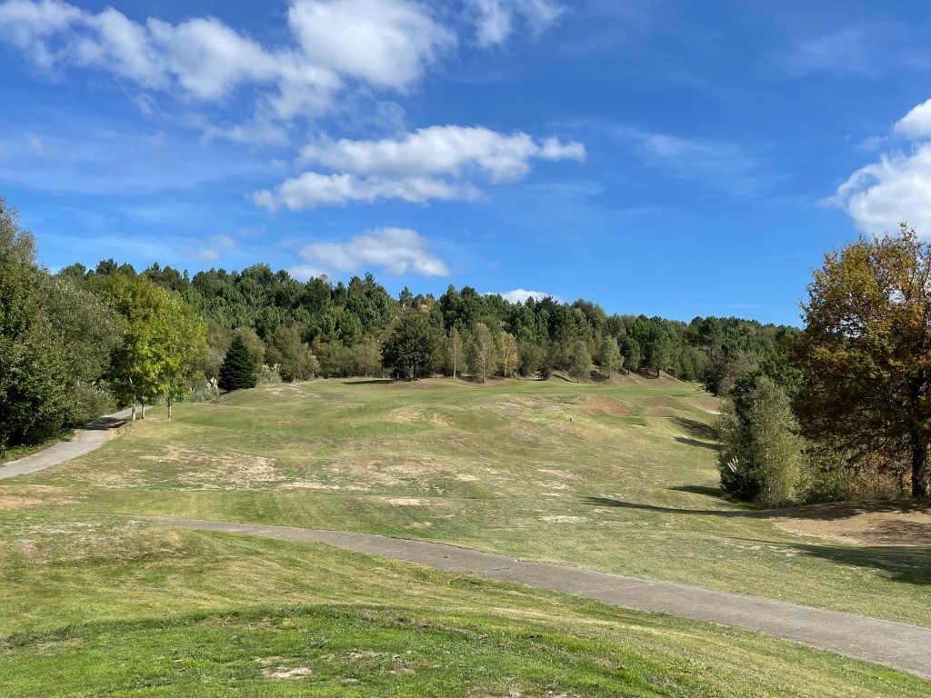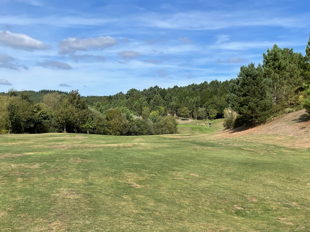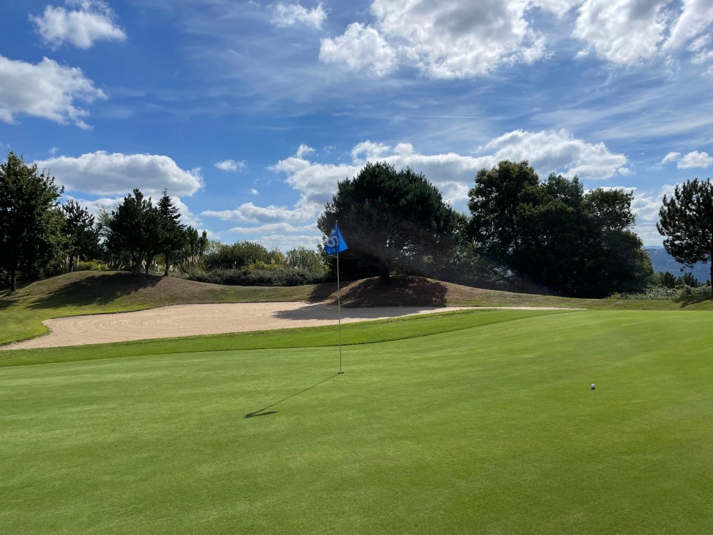 Weit ist der Weg zur 10, es geht bergab die nächsten Bahnen, man spielt mitten in alten Eichen und Nadelbäumen. Jetzt Anfang September sind die Fairways ausgetrocknet von der Sommerhitze, was mein Spiel aber nicht stört. Wir sind eben in Spanien. Wer einen absolut grünen Platz mag, muss im Frühjahr herkommen. Wunderbar (gepflegt) sind die Grüns samt Umgebung und keine einzige Pitchmarke zu sehen, was wohl an der Disziplin der hier Golfenden liegt. Noch mehrmals sollte ich freundlich durchgewunken werden als Einzelspielerin mit Cart. Das hätte ich mal gern anderswo.