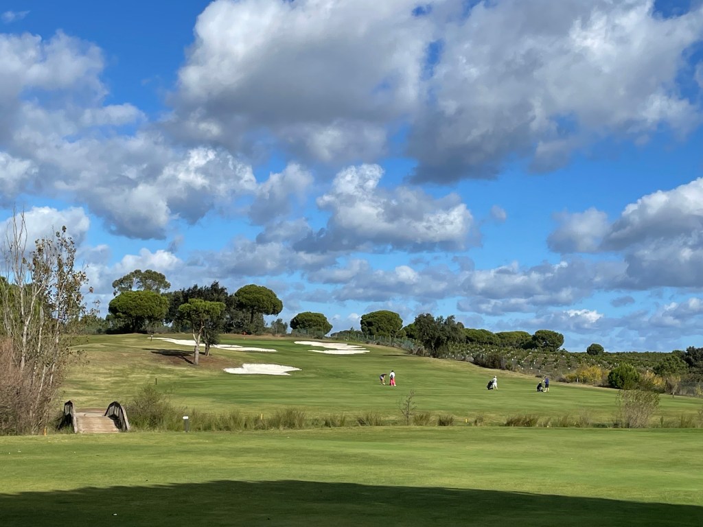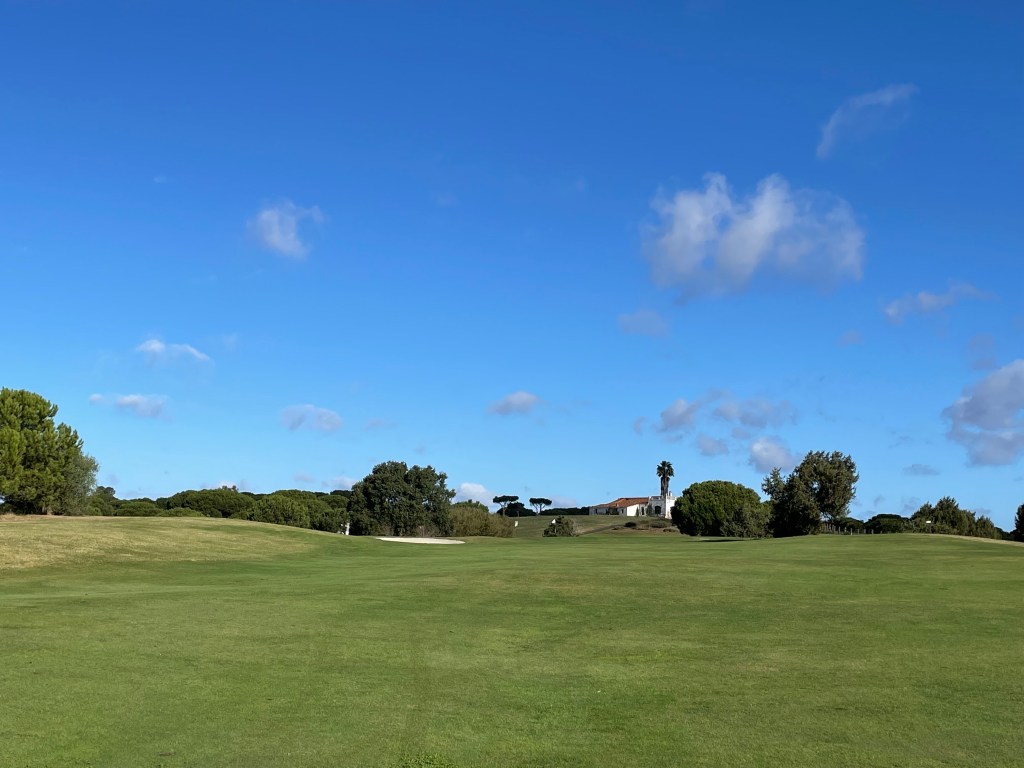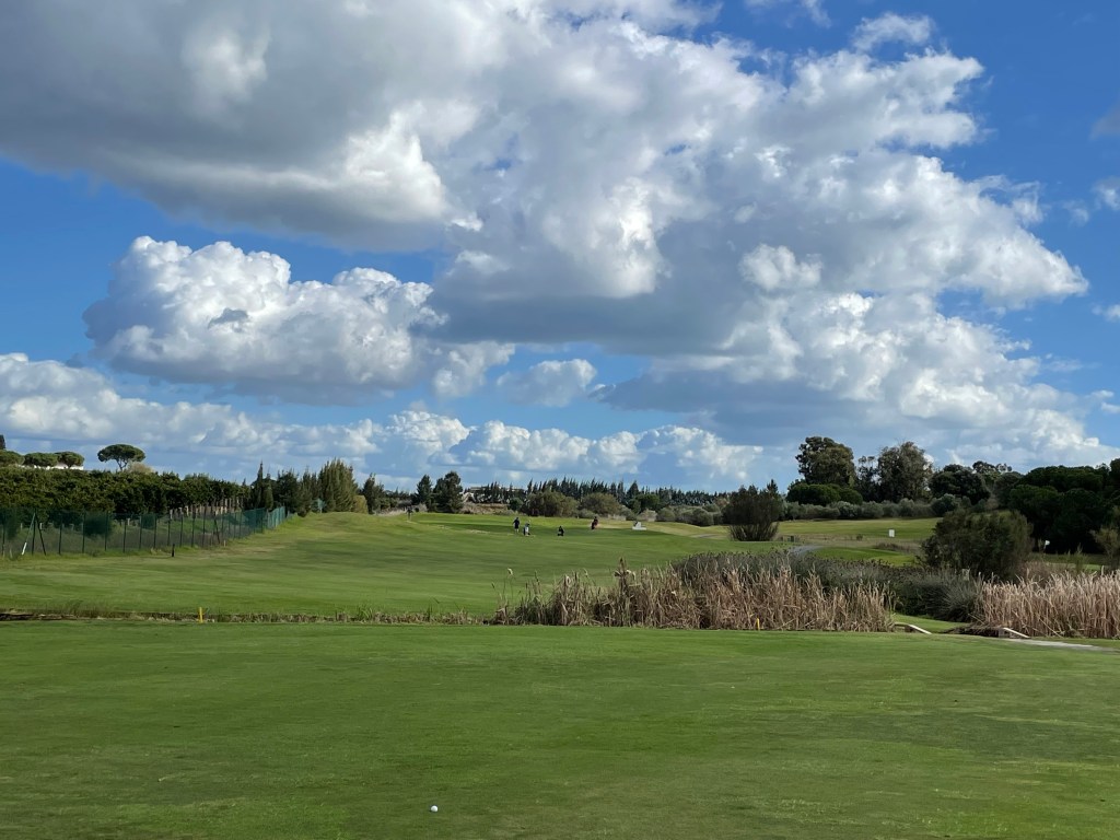 El Rompido (Betonung auf dem „i“) NORD beginnt mit einem geraden Par 4, das rechtzeitig vor dem Grün schmal wird. Der eisige Wind trägt unsere Bälle, wohin er will. Das bleibt auch auf den nächsten Bahnen so, die wenige Bäume drumrum haben. Bergauf auf der 4 hilft uns der Wind eher, das Grün liegt vor einer malerischen Hazienda, die sich beim Vorbeigehen als Schuppen für Golfgeräte entpuppt. Die klare Luft ist wunderbar, zaubert dramatische weiße Wolken in den blauen Himmel. Die Fairways sind strahlend grün hier, offenbar werden sie im Sommer gut bewässert. Der Pflegezustand: ausgezeichnet, die Grüns sind endlich einmal pfeilschnell und wir plagen uns ganz schön damit.