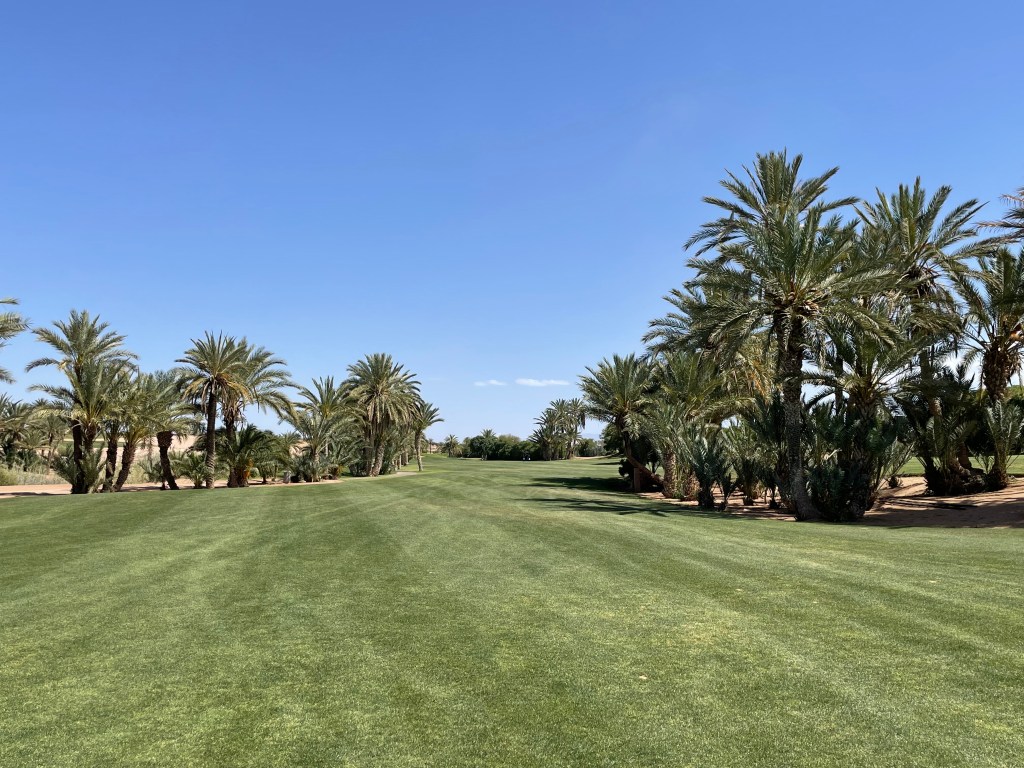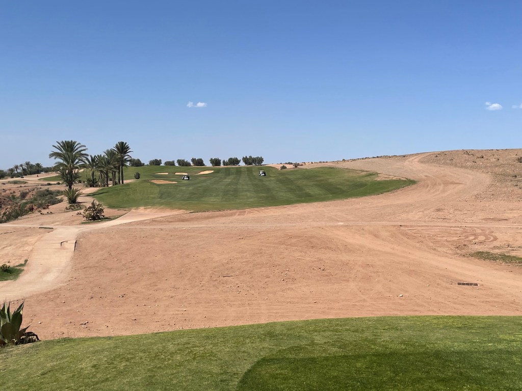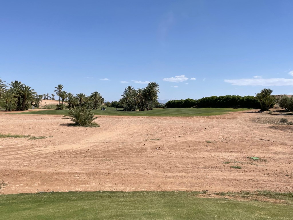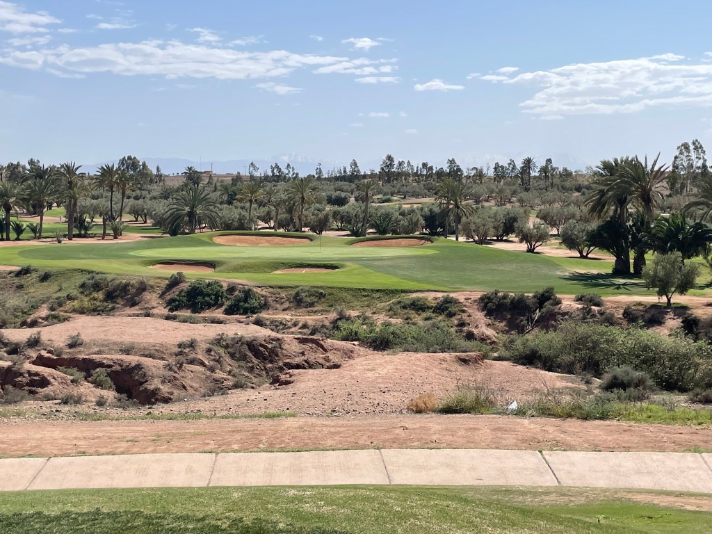 Der Kurs startet grün und leicht bergauf, tolles Fairway mit schönem Roll und einem topgepflegten Grün. Ab der 2 hat man am Tee oft etwas vor Augen, das anfangs vielleicht ein wenig gewöhnungsbedürftig ist: riesige Wastareas aus grobem, roten Sand mit Steinen drin. So herausfordernd wie die Optik vermuten lässt, sind sie aber nicht, weil meist gut zu überspielen. Falls man doch einmal zu kurz, aber wenigstens gerade ist, springt der Ball immer noch vom harten Boden weiter aufs Fairway. Wasteareas und auch die karge Umgebung rundum charakterisieren den ganzen Platz und sorgen für ein richtig schönes, „typisch marokkanisches“ Gefühl, zu dem auf den südlich ausgerichteten Löchern das verschneite Atlasgebirge im Hintergrund auch noch das Seine beiträgt. Wie viel Wasser es in dieser Gegend braucht, um Fairways und Grüns grün zu halten, mag man sich lieber gar nicht vorstellen…
