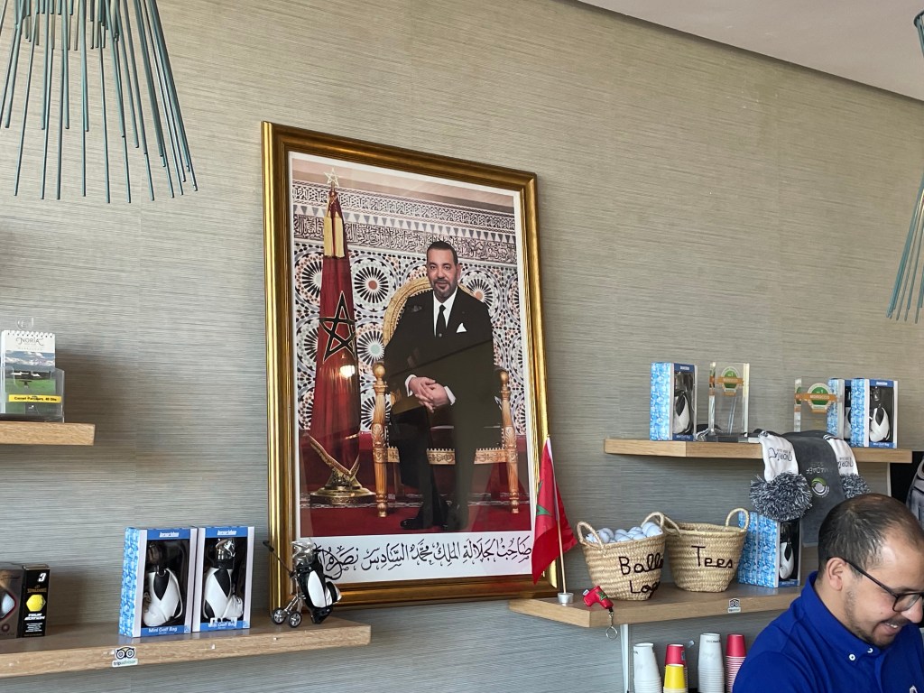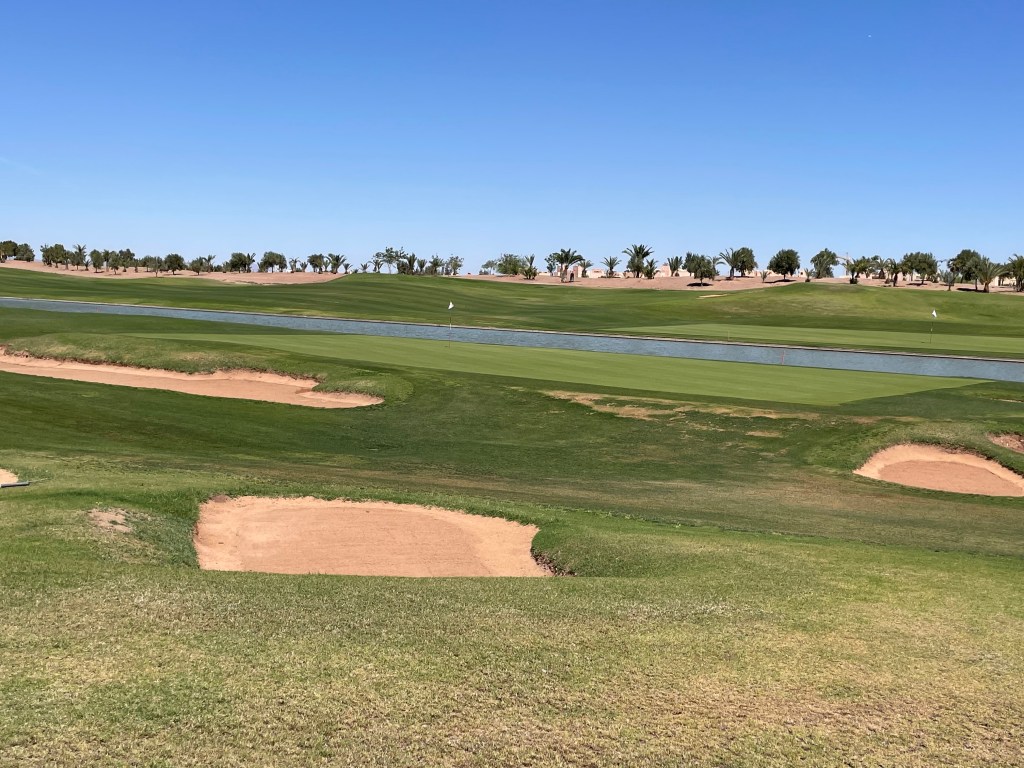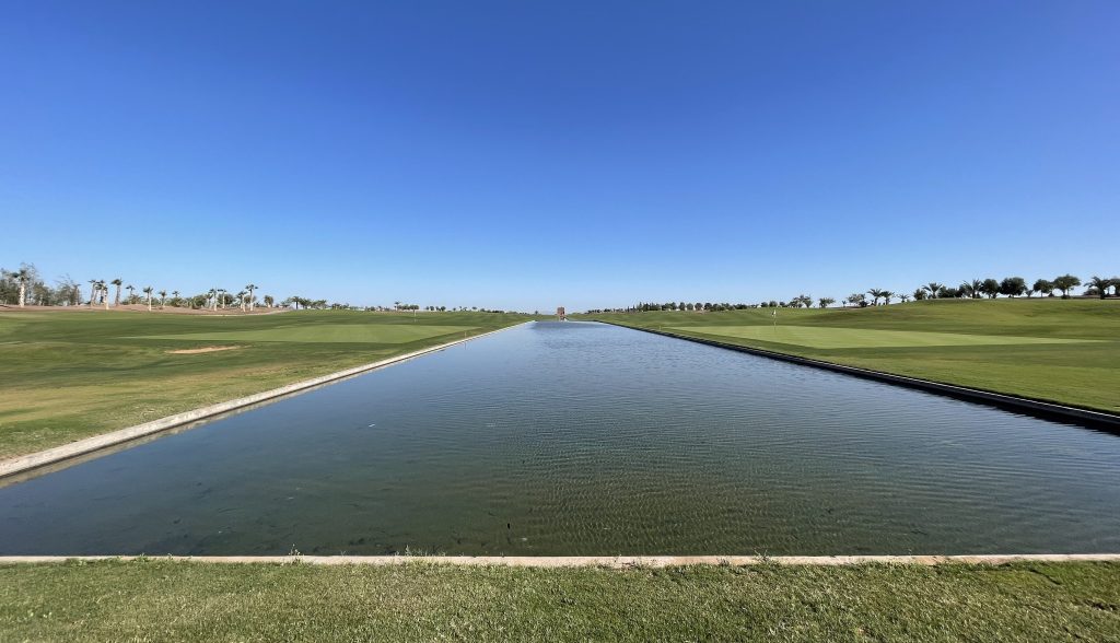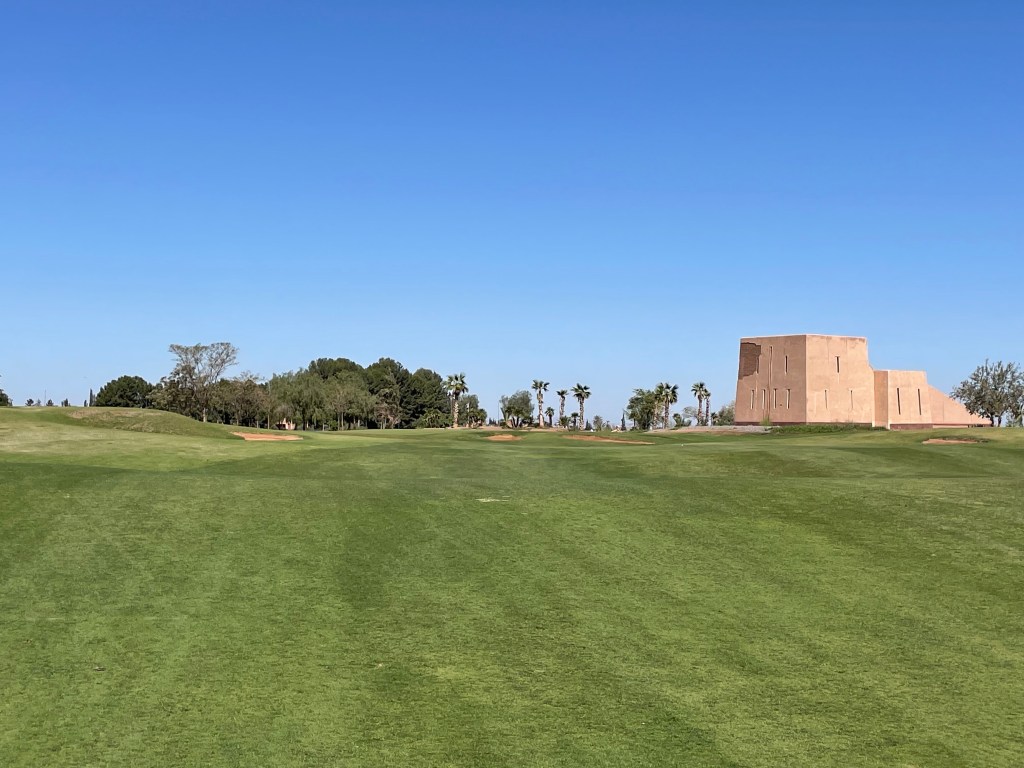 Unser Taxi hält diesmal vor einem sehr modernen Clubhaus aus Beton, eckig und kantig – leider aber auch geschlossen. Wir müssen außenrum ins Sekretariat im Erdgeschoss, sind aber ohnehin abgelenkt vom ungewöhnlichen Blick auf den rechteckigen Teich und die beiden ebensolchen Grüns rechts und links davon. Fast Jede:r von uns zückt das Handy. Das Sekretariat wirkt provisorisch, das in den Clubs obligatorische Bild des marokkanischen Königs hängt allerdings an der Wand. Wir checken ein und bekommen einen kleinen Compact Guide für die Spielbahnen mit, der sich als sehr nützlich erweisen soll. Die gewellten Fairways verstecken ihre Bunker (und derer gibt es viele!!) nämlich sehr gekonnt.